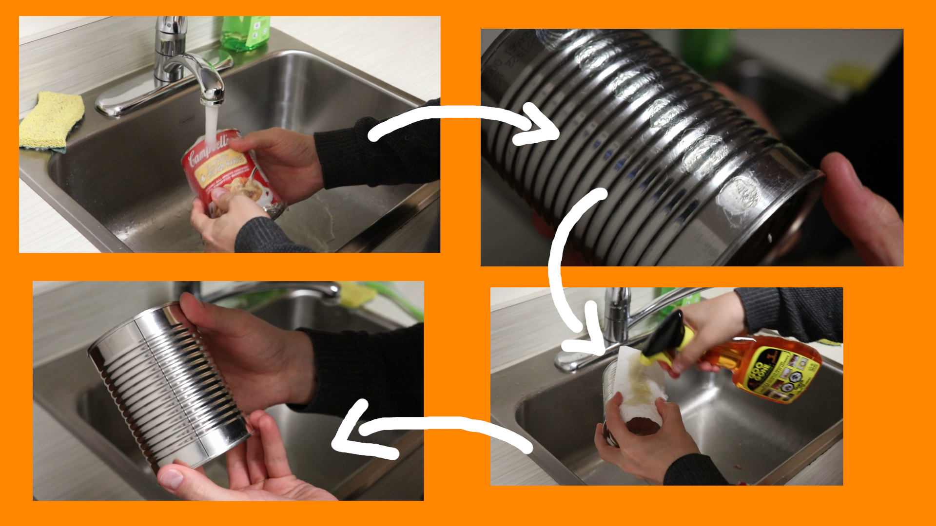 I find it the easiest to clean the soup can when the soup is still inside because then the can has some weight to it. After all the glue is removed it comes the time to empty the can, eat the soup, and think about drilling a lot of holes into the can.
