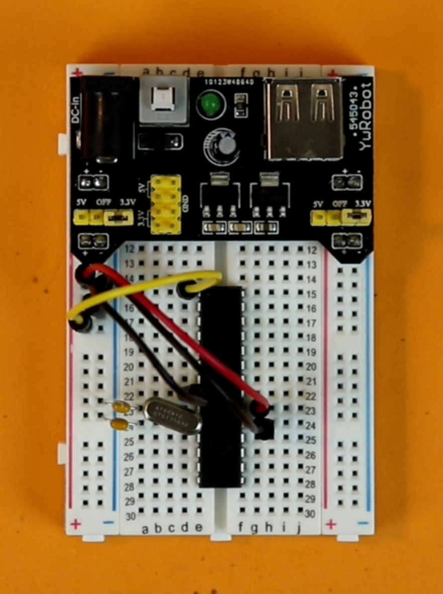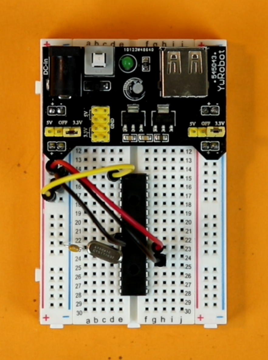 Use a yellow cable to connect pin 1 (MCLR) of the PIC16F883 with the +5V power rail.