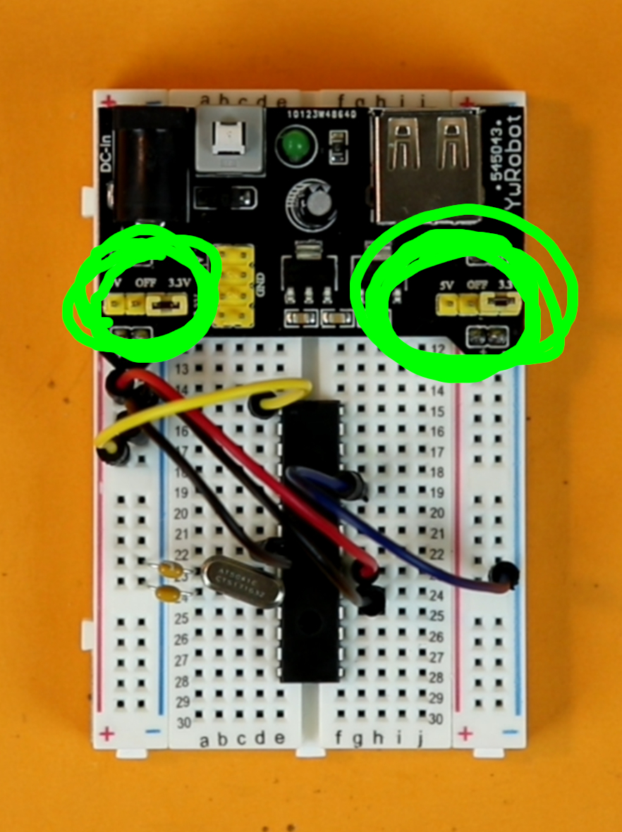 Place the USB breadboard power supply. Make sure that both jumpers are set to the 5V configuration.