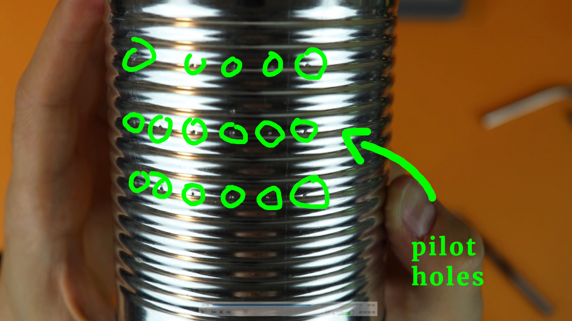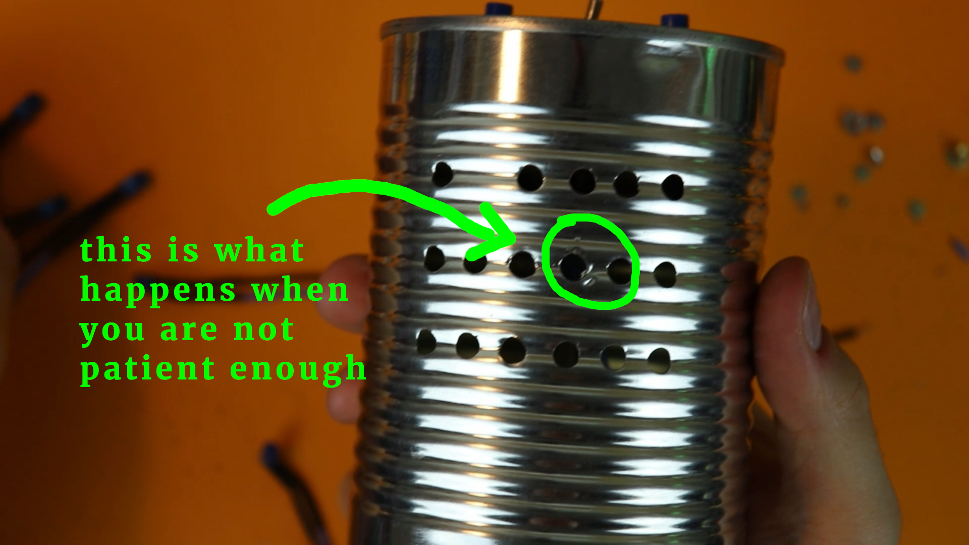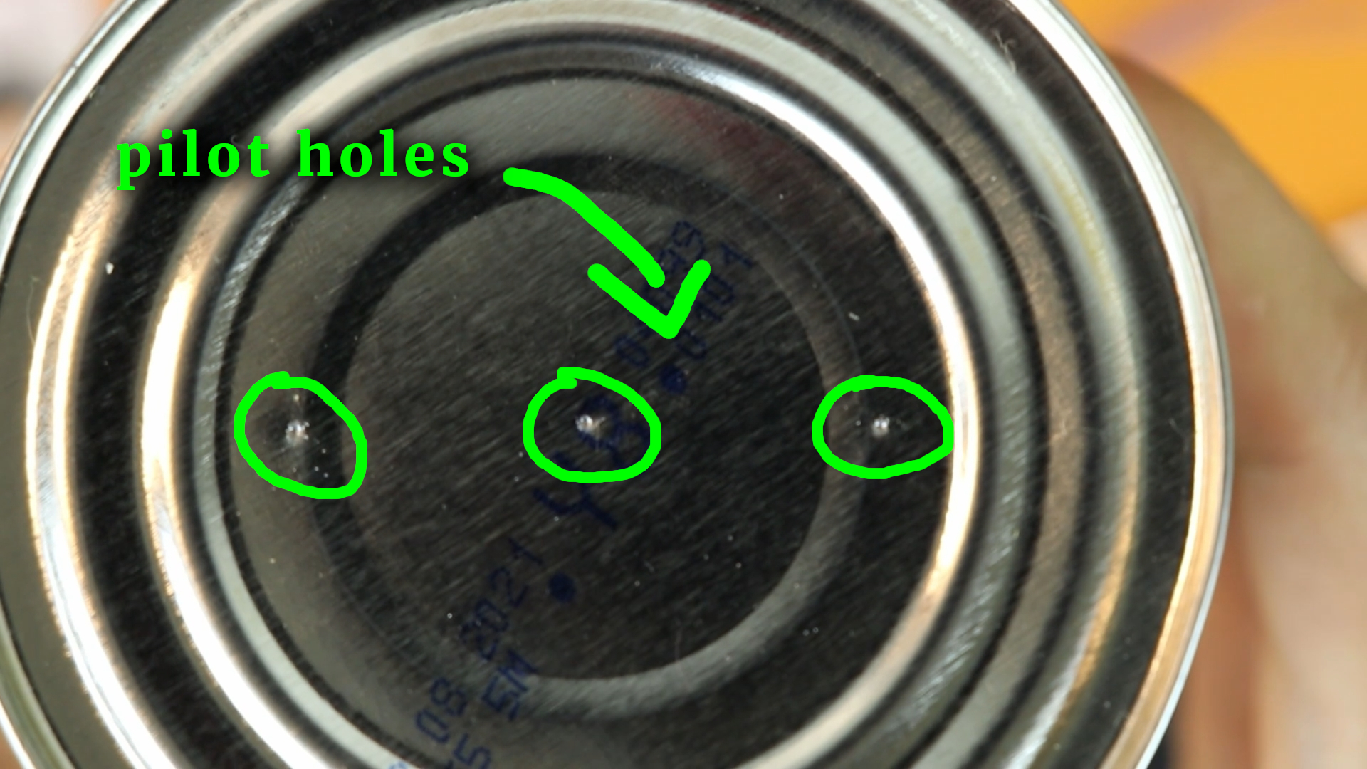 One general piece of advice: take your time while drilling! The results will be the cleanest when you take your time and don't push the drillbit too much against the can. It also helps to punch little pilot holes with a center punch (or with the tip of the 7mm bradpoint bit) so that you have a clean starting point for drilling the holes: