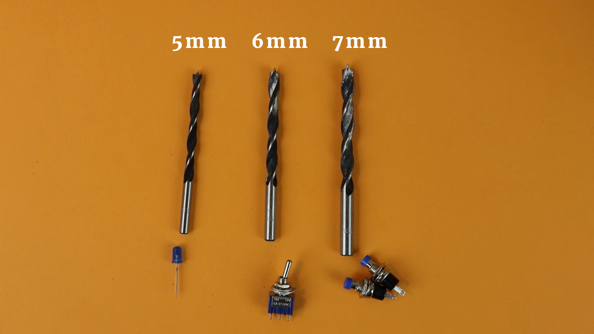 I recommend using bradpoint bits for that purpose. For the LEDs you will need 5mm bits, and the for switch and the two buttons it depends a little bit on the ones you choose. My switch works with 6mm and the pushbuttons need 7mm.
