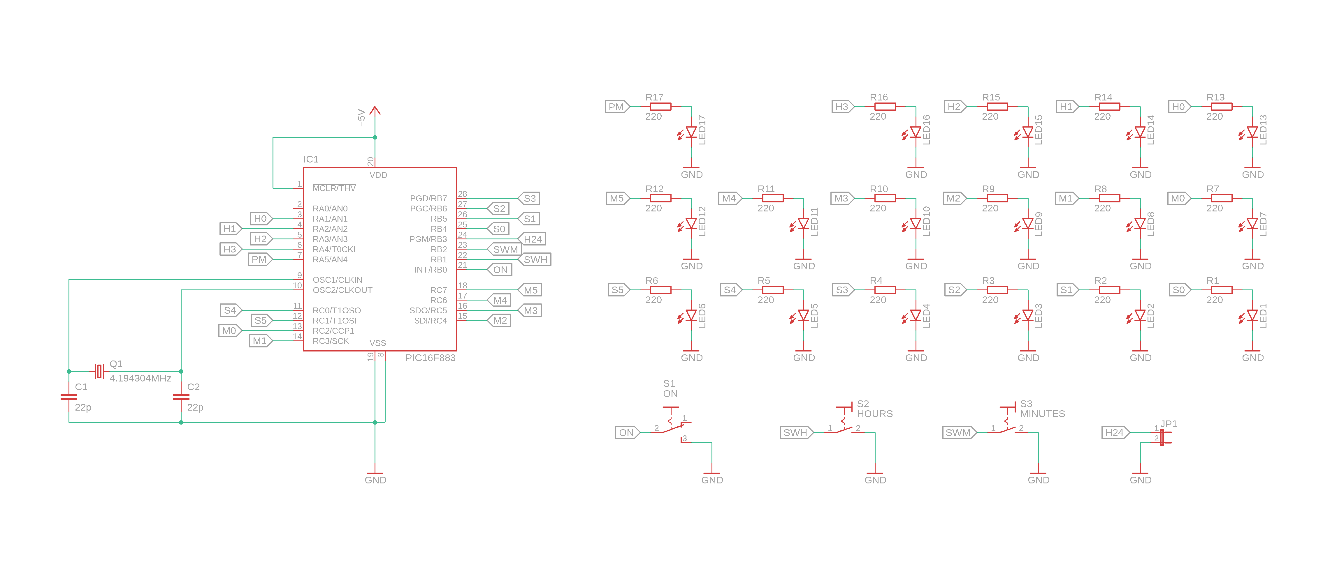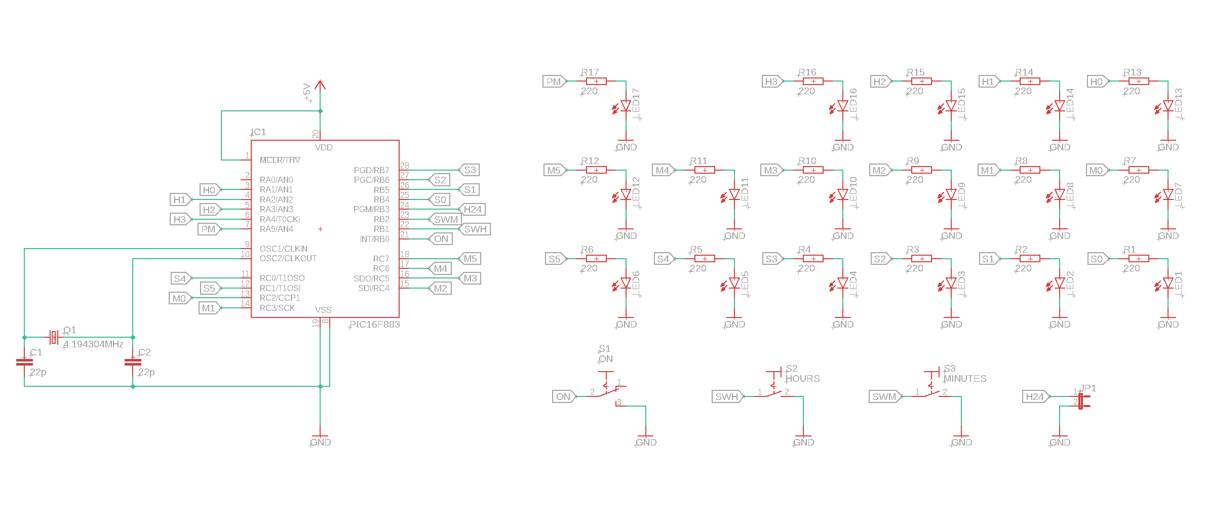 - On the right side you can see the 17 LEDs. I arranged them in the same way that they are mounted in the final binary clock. All LED cathodes (negative terminals) are permanently connected to ground. Their positive terminals (anodes) are connected to a 220 Ohms resistor. This resistor is then connected to the output of the PIC16F883.