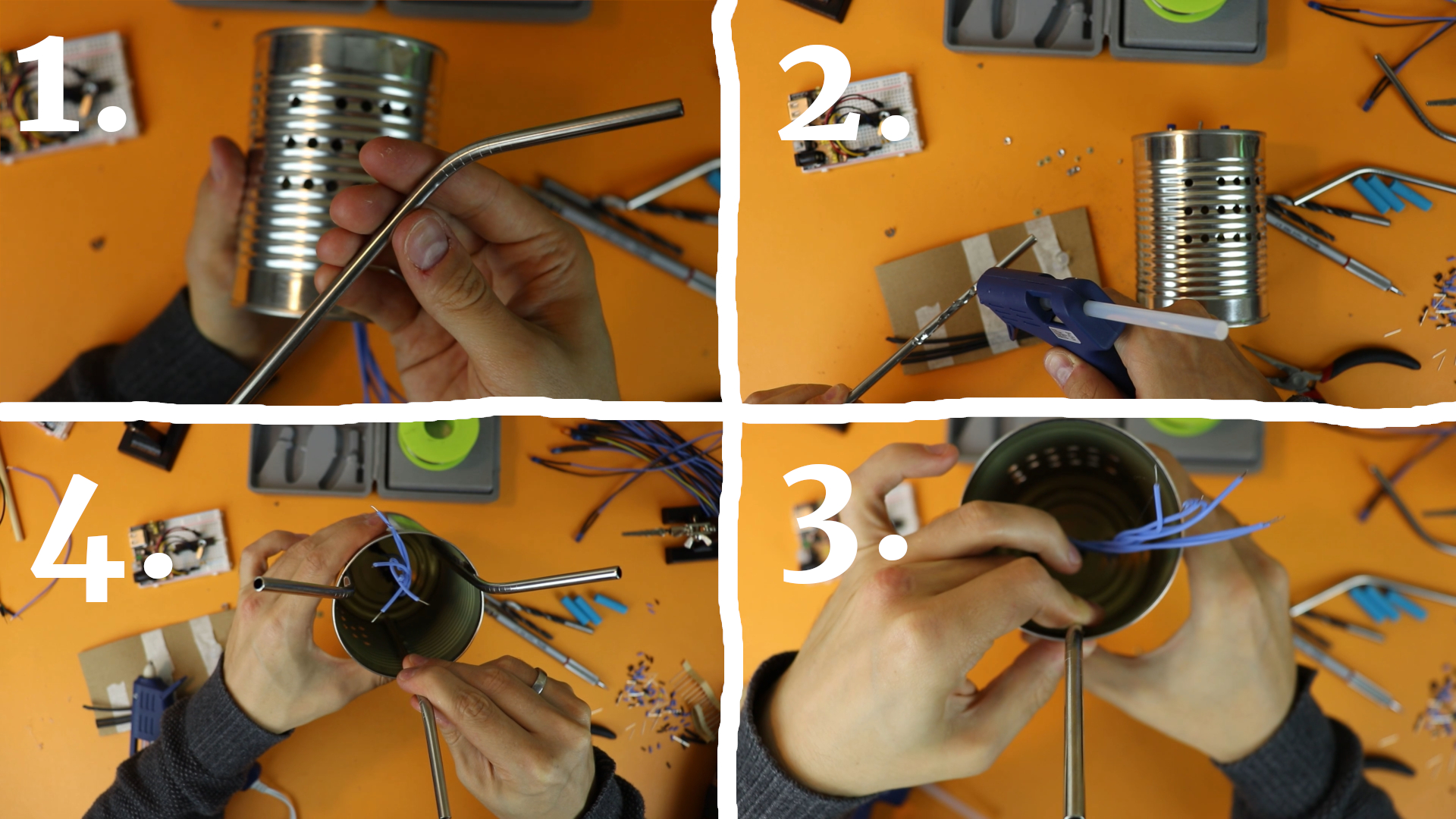 As legs I chose simple stainless steel drinking straws (20cm or 8" long). They can be mounted straightforwardly with hot glue: