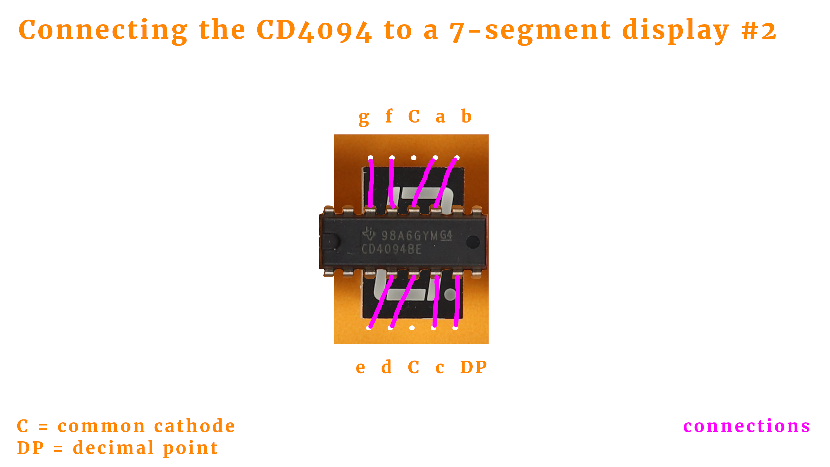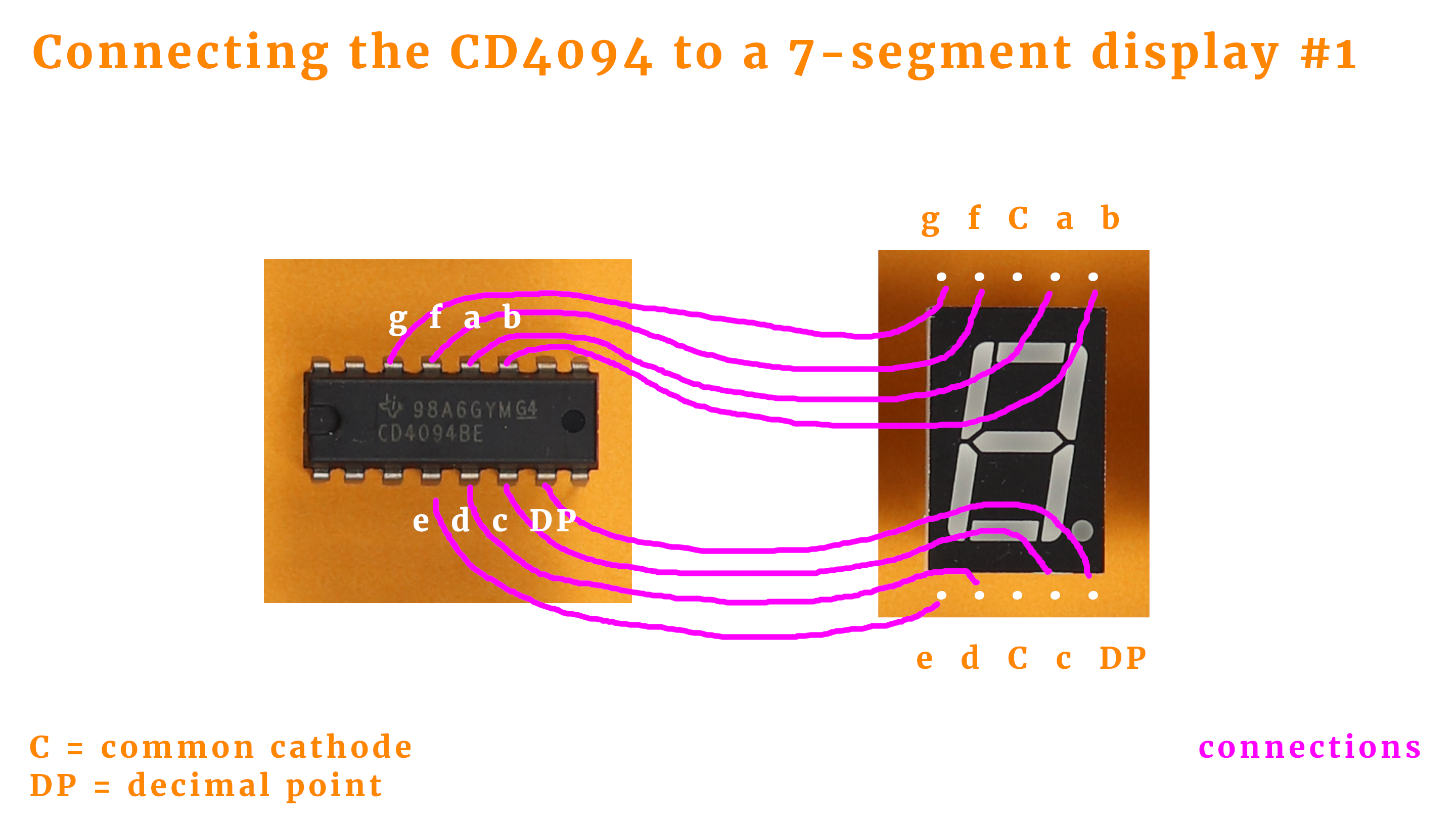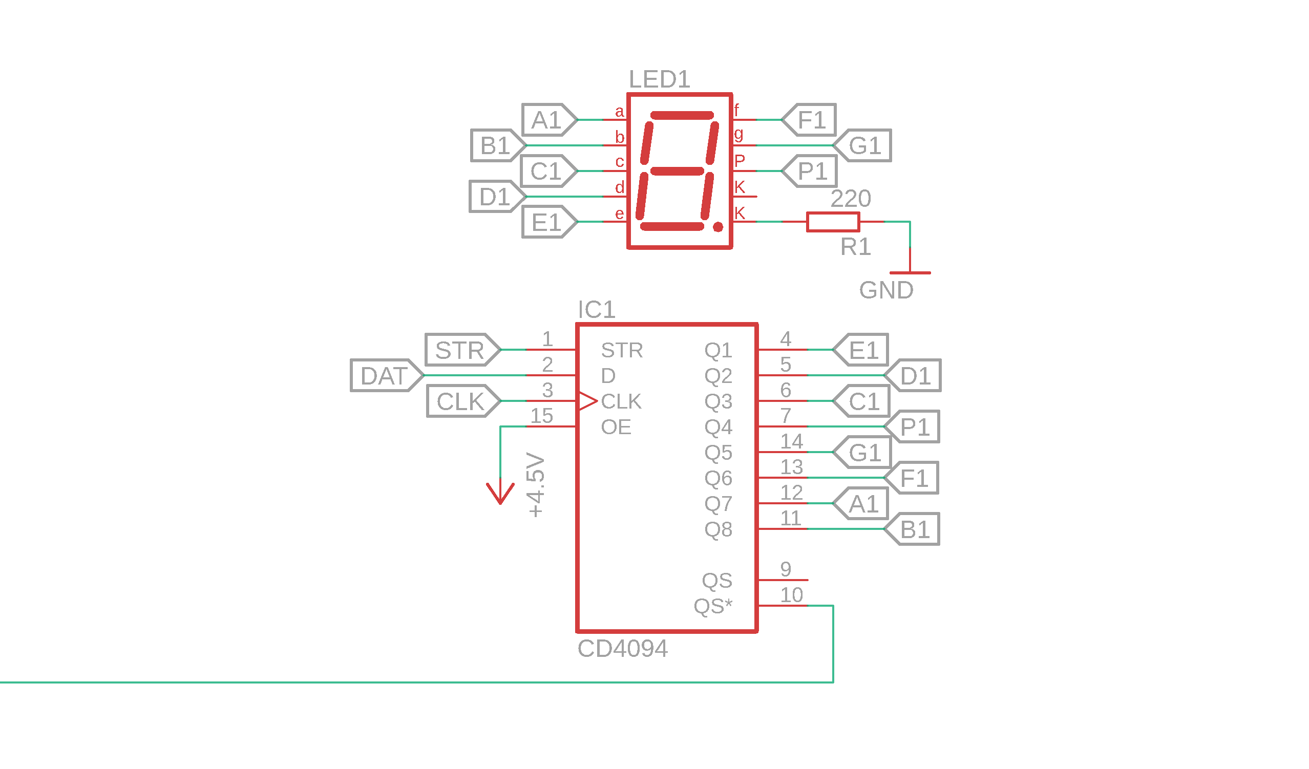 - Each CD4094 register has eight outputs Q1-Q8, and we use them to drive the seven segments (and the decimal point) of each 7-segment display. The assignment of where Q1 goes (here to segment 'e') is completely random and can be adjusted in the software that we will discuss below.