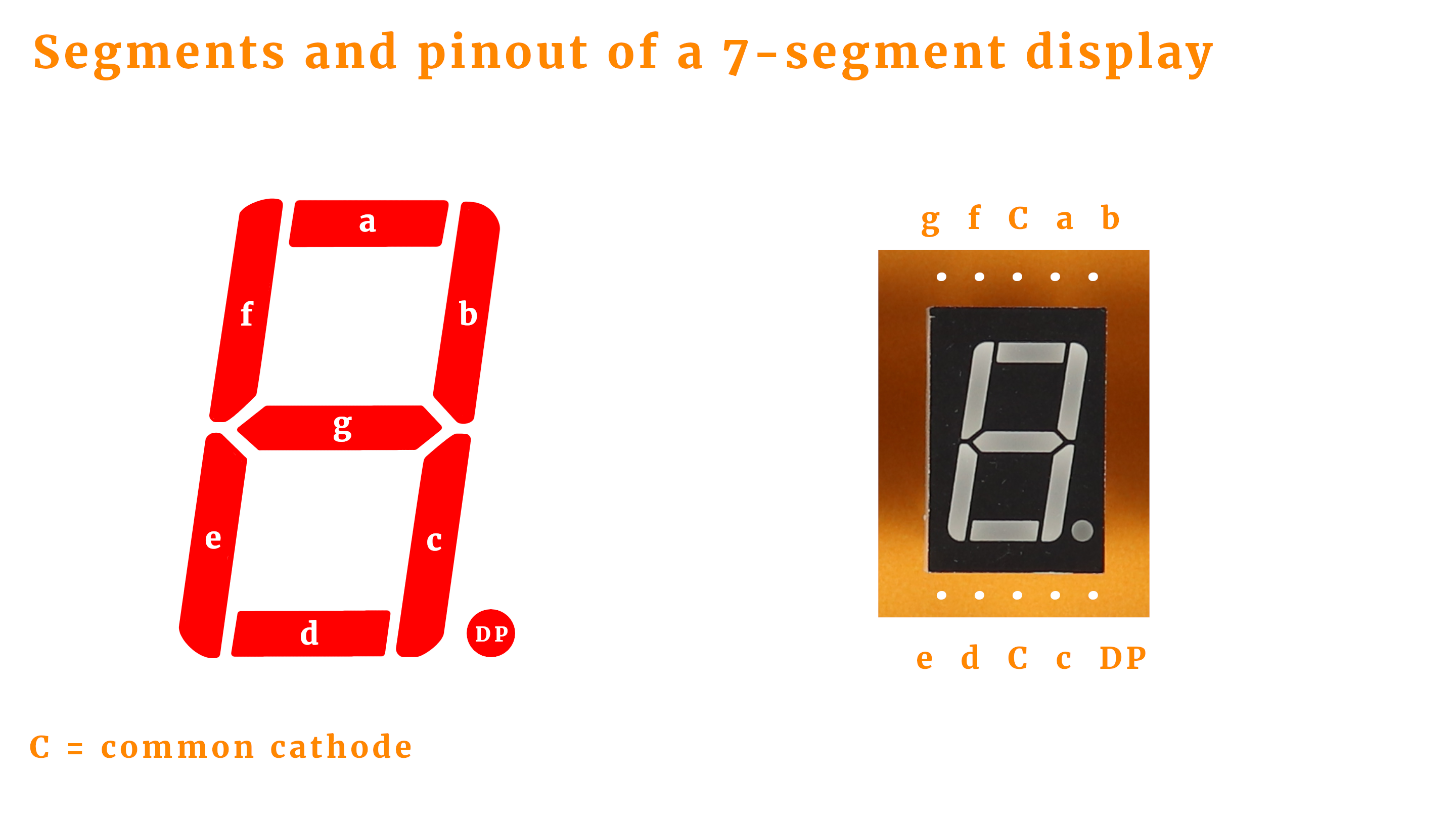 - The 7-segment displays are common cathode displays, but if you only have common anode displays you can use them as well but will have to tweak the code a little bit, more on that below.