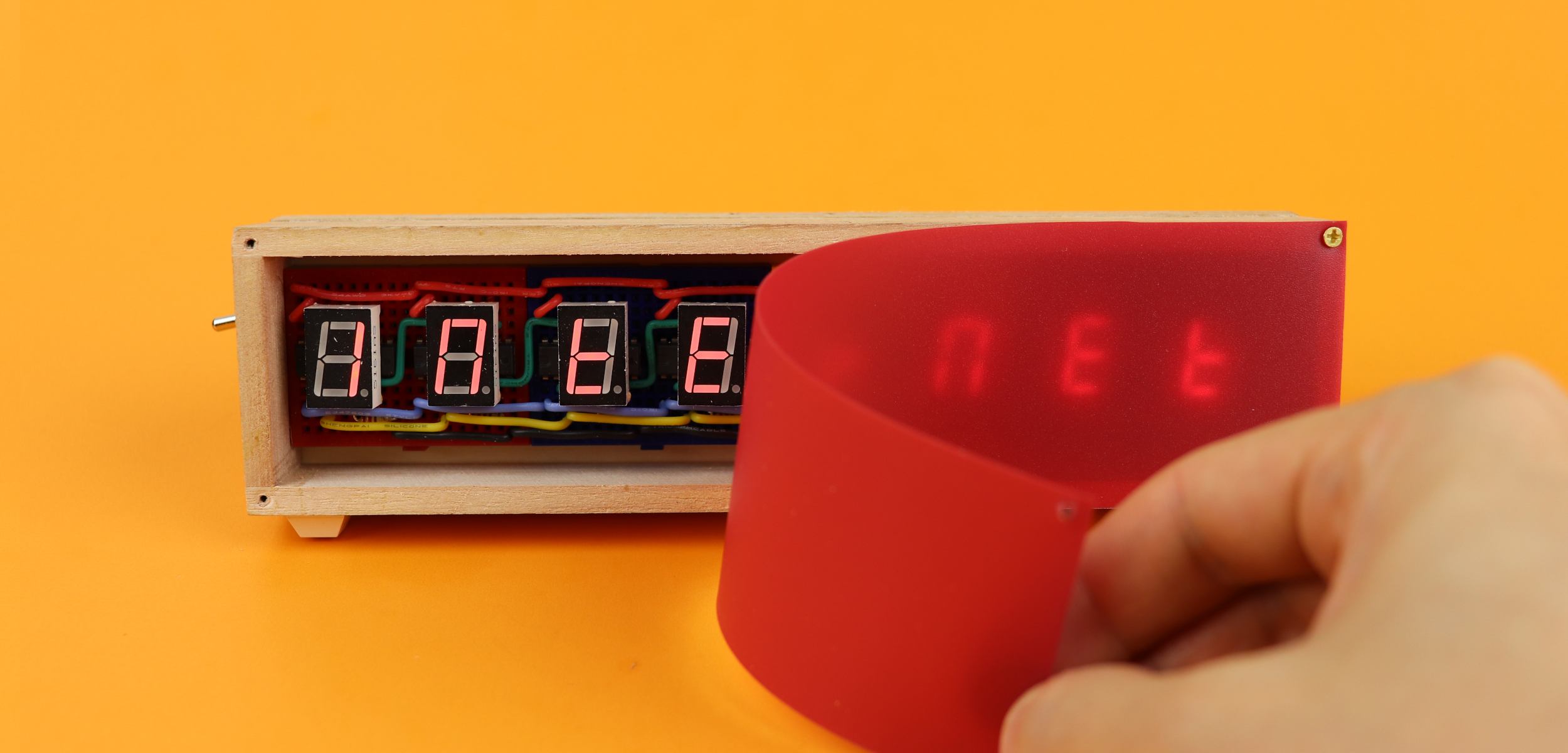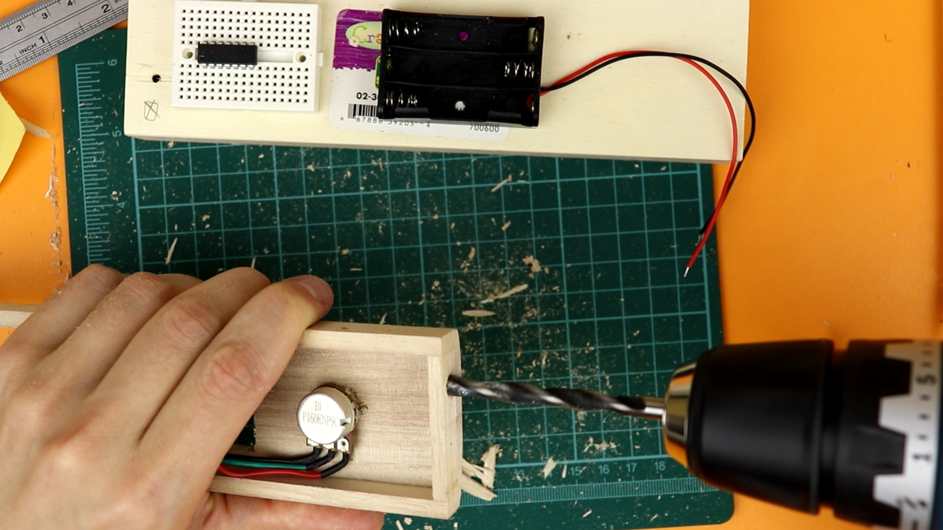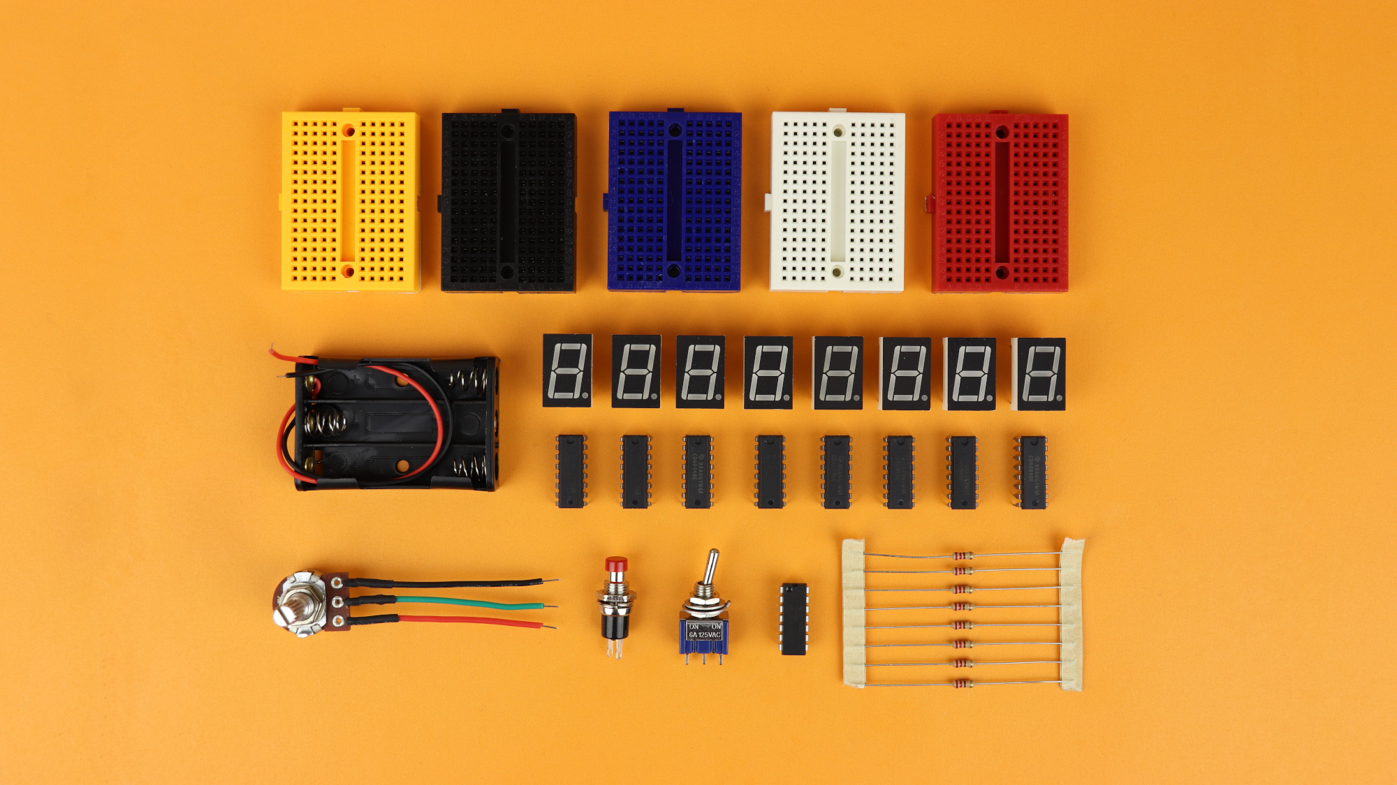 - Other than that, there is only a switch to turn the display on or off, a 4.5V battery compartment (which you could also choose to be 3×AA for a longer battery lifetime, but I couldn't due to space constraints), a couple of 220Ω resistors for the 7-segment displays, and a pushbutton as well as a 4.7kω potentiometer (that could also be 5kω or 10kΩ).