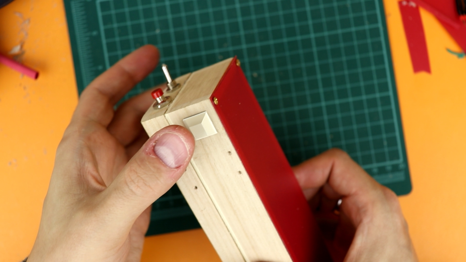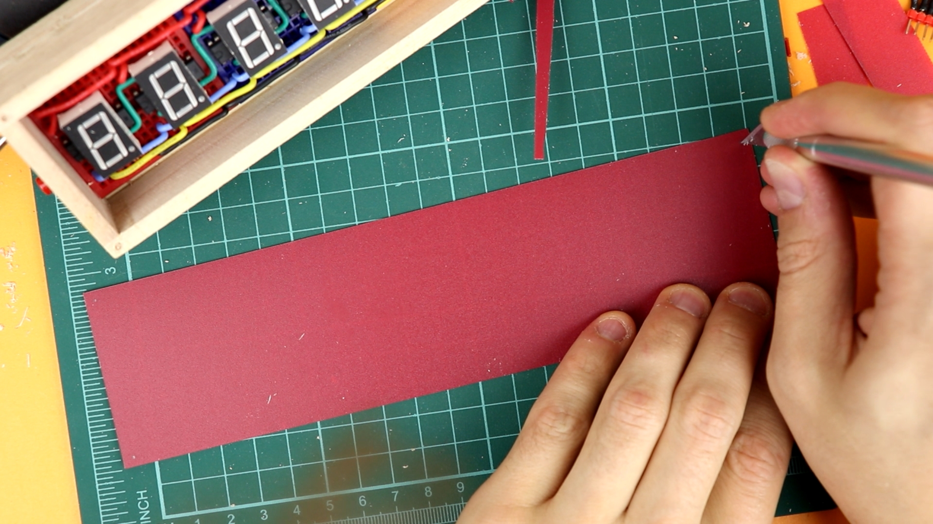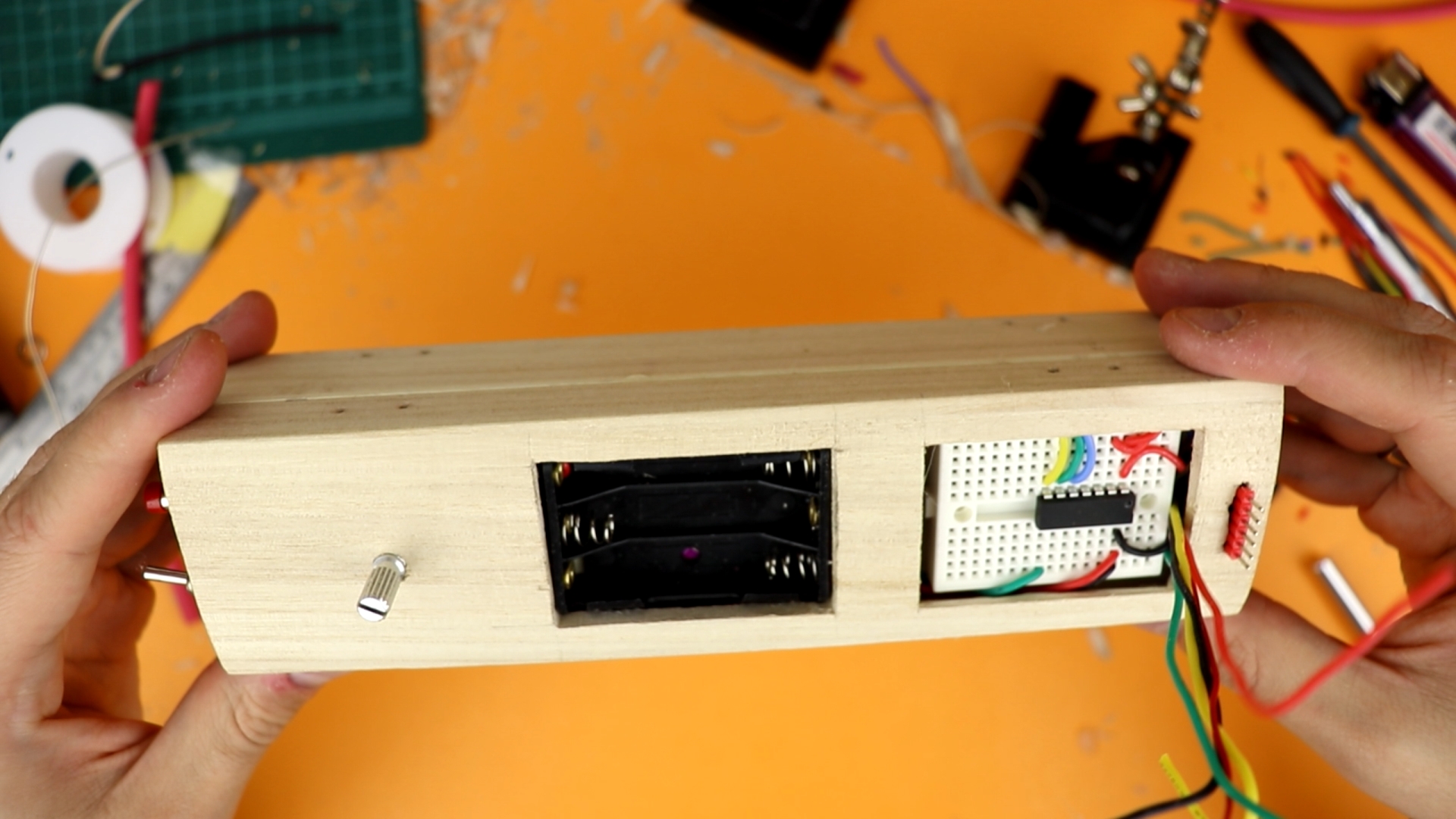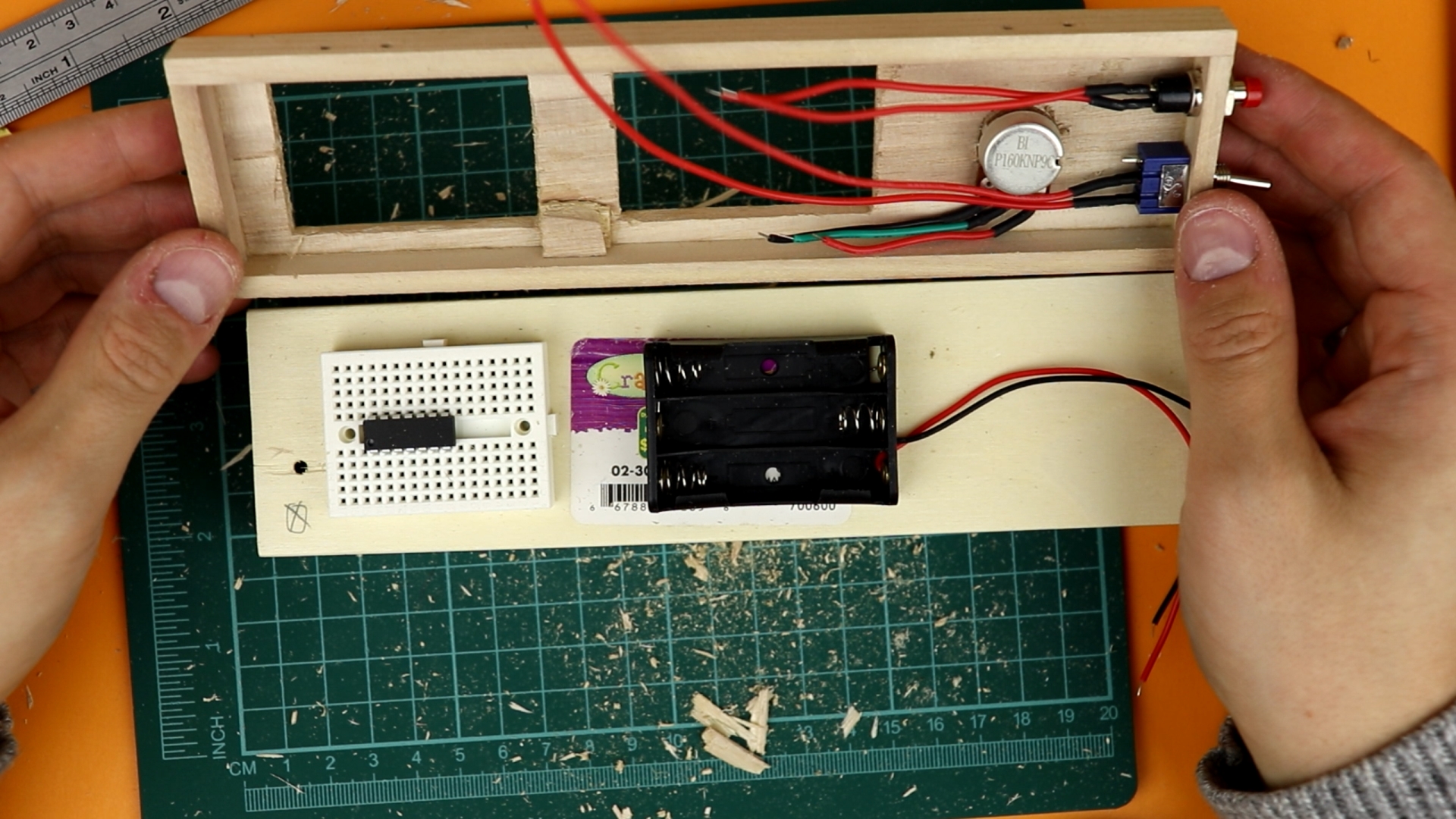 - Other than that, there is only a switch to turn the display on or off, a 4.5V battery compartment (which you could also choose to be 3×AA for a longer battery lifetime, but I couldn't due to space constraints), a couple of 220Ω resistors for the 7-segment displays, and a pushbutton as well as a 4.7kω potentiometer (that could also be 5kω or 10kΩ).