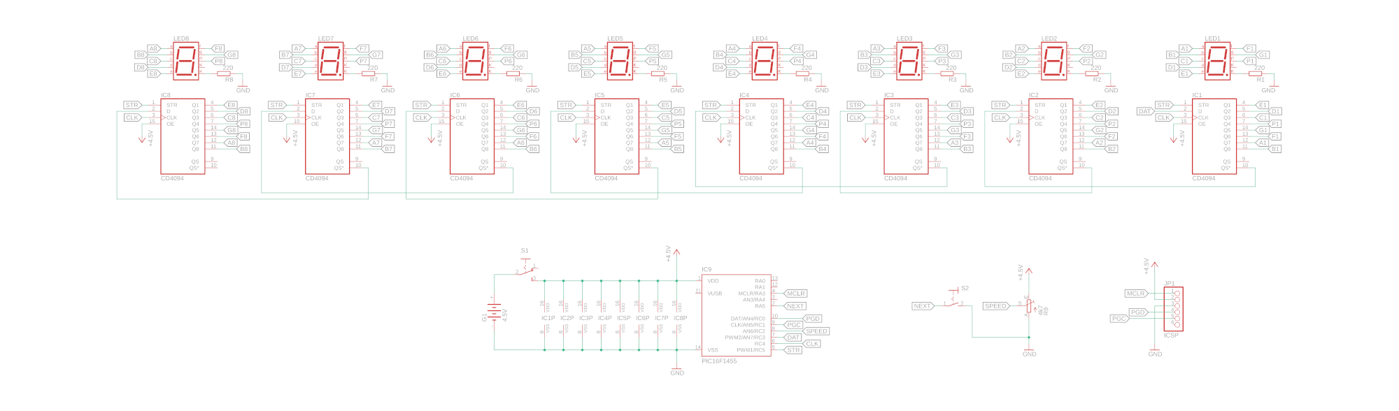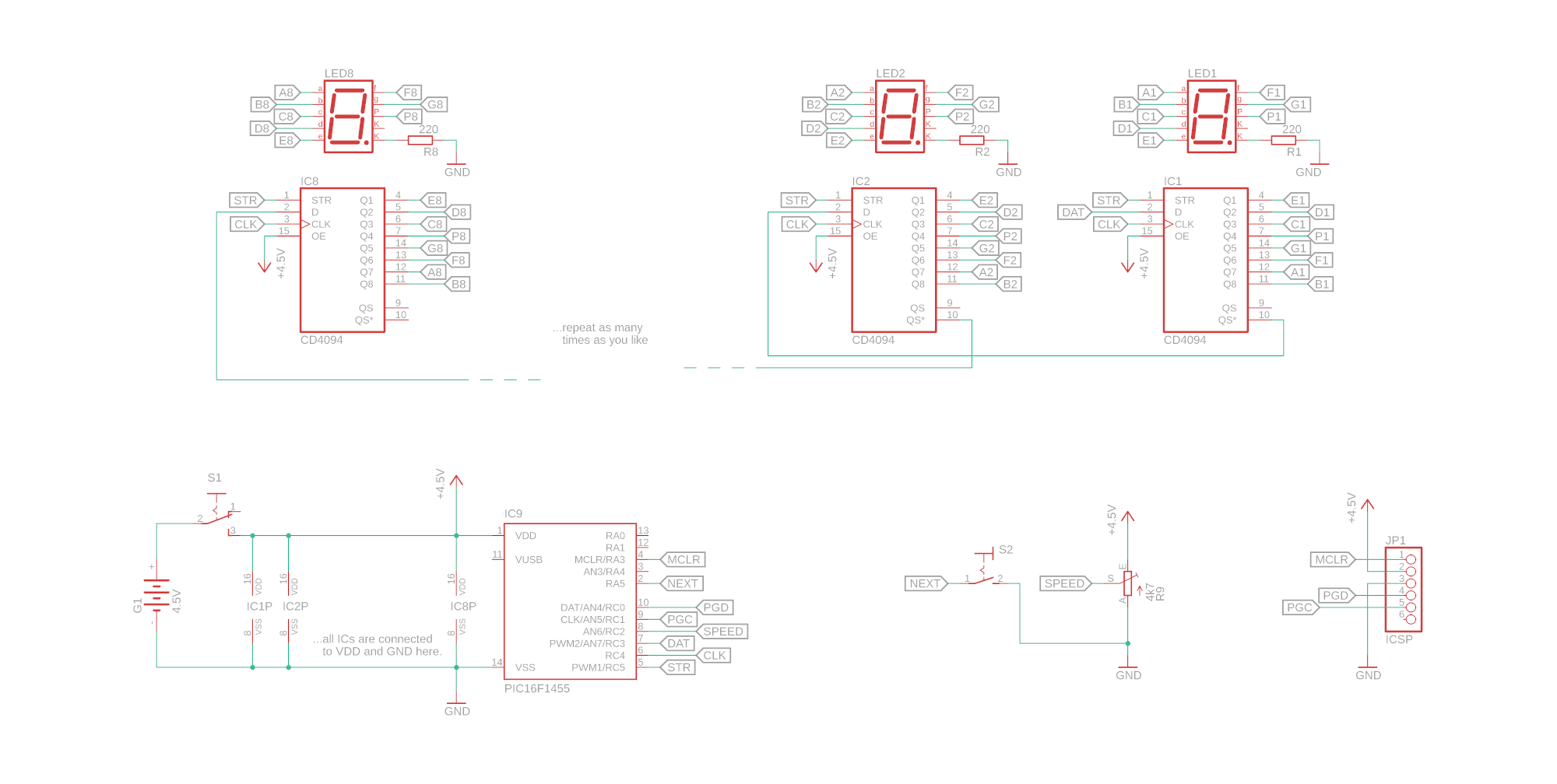 - Now what are those funny symbols IC1P, IC2P, and IC8P on the left side? Those are the power connections to the shift register ICs IC1, IC2, and IC8. It just means that for each shift register that we use we have to connect its pin 16 to +4.5V and its pin 7 to ground. It's a bit confusing, but you can read more about that kind of symbol in our article on how to read schematics.