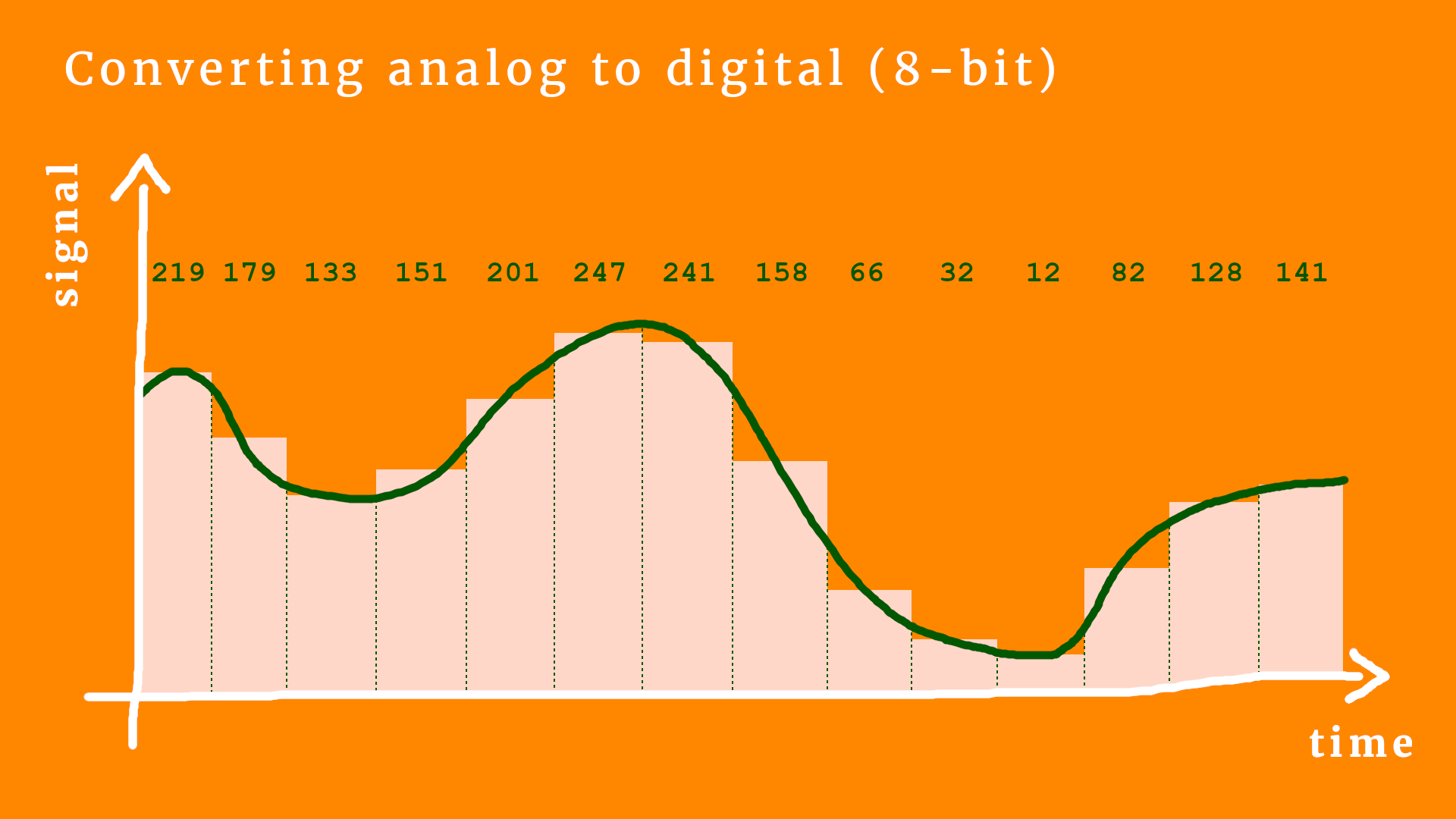 Here is a less pretty and poetic, but more tangible example. Imagine you are building a circuit that is supposed to measure a voltage. It should not just measure ON or OFF, but also the magnitude of a signal. This is what an analog to digital converter (or ADC for short) does. It takes a continuous, real world quantity (like a voltage) and converts into a binary number.