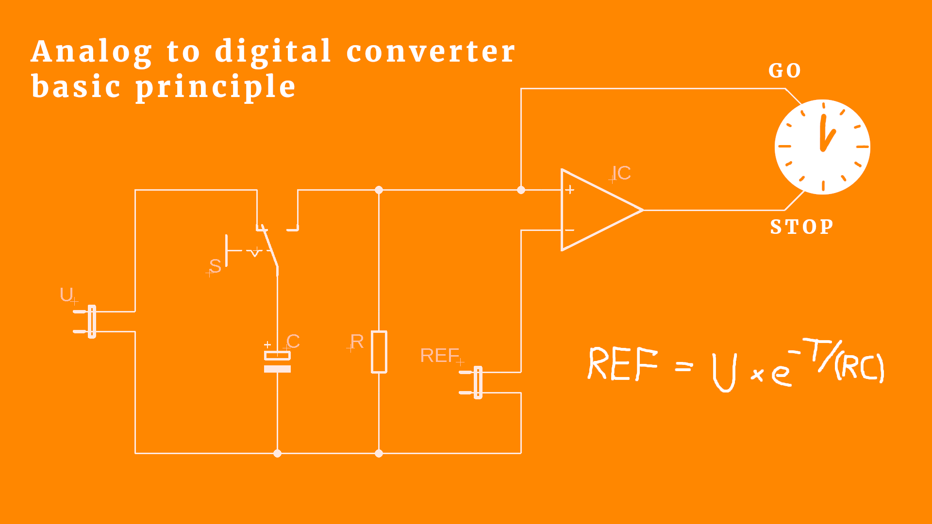 - When the voltage stored in the capacitor reaches the reference voltage, the comparator kicks in. The signal at + is no longer greater than that at -! This means that the output of the comparator turns ON and stops the timer. This process is called conversion. Now that we have the time it took to reduce the signal from U to REF, we can calculate U if we know the values of REF as well as R and C. The formula is written in the diagram above.