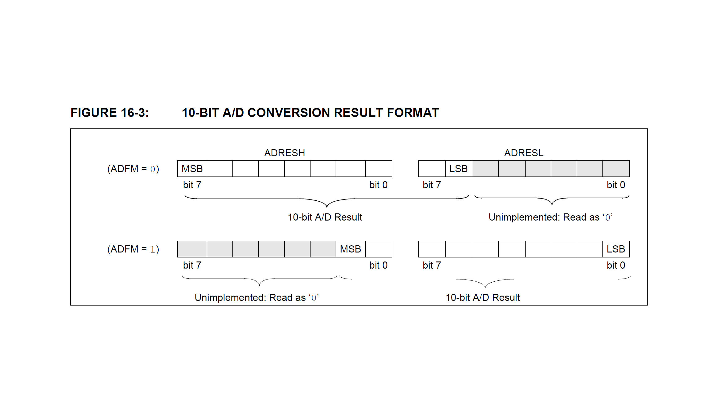 - In line 51 we adjust the alignment. What is that? Well, the PIC16F1455 is an 8-bit microcontroller but its ADC module has a resolution of 10 bit, which means that these ten bits have to be distributed on two registers, see more below. Line 51 corresponds to one possible option, see also the datasheet on page 152.