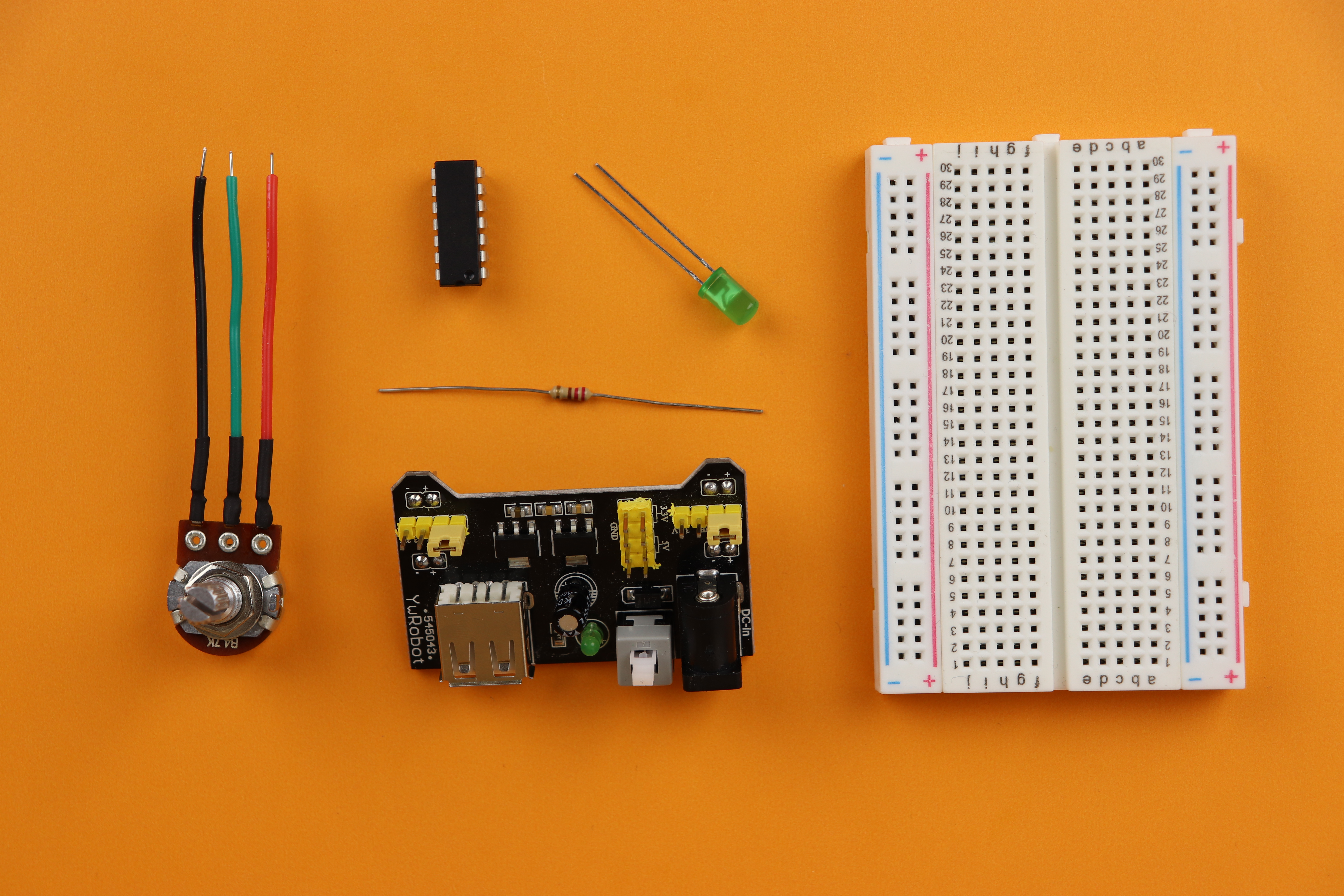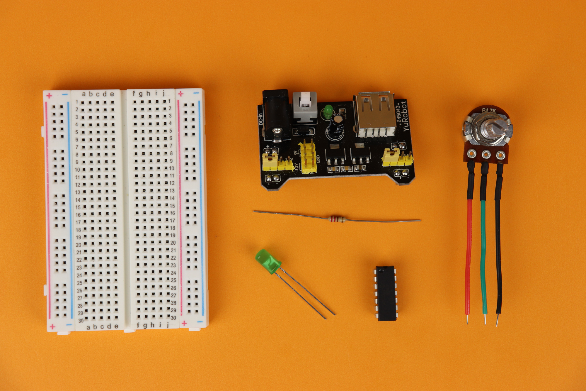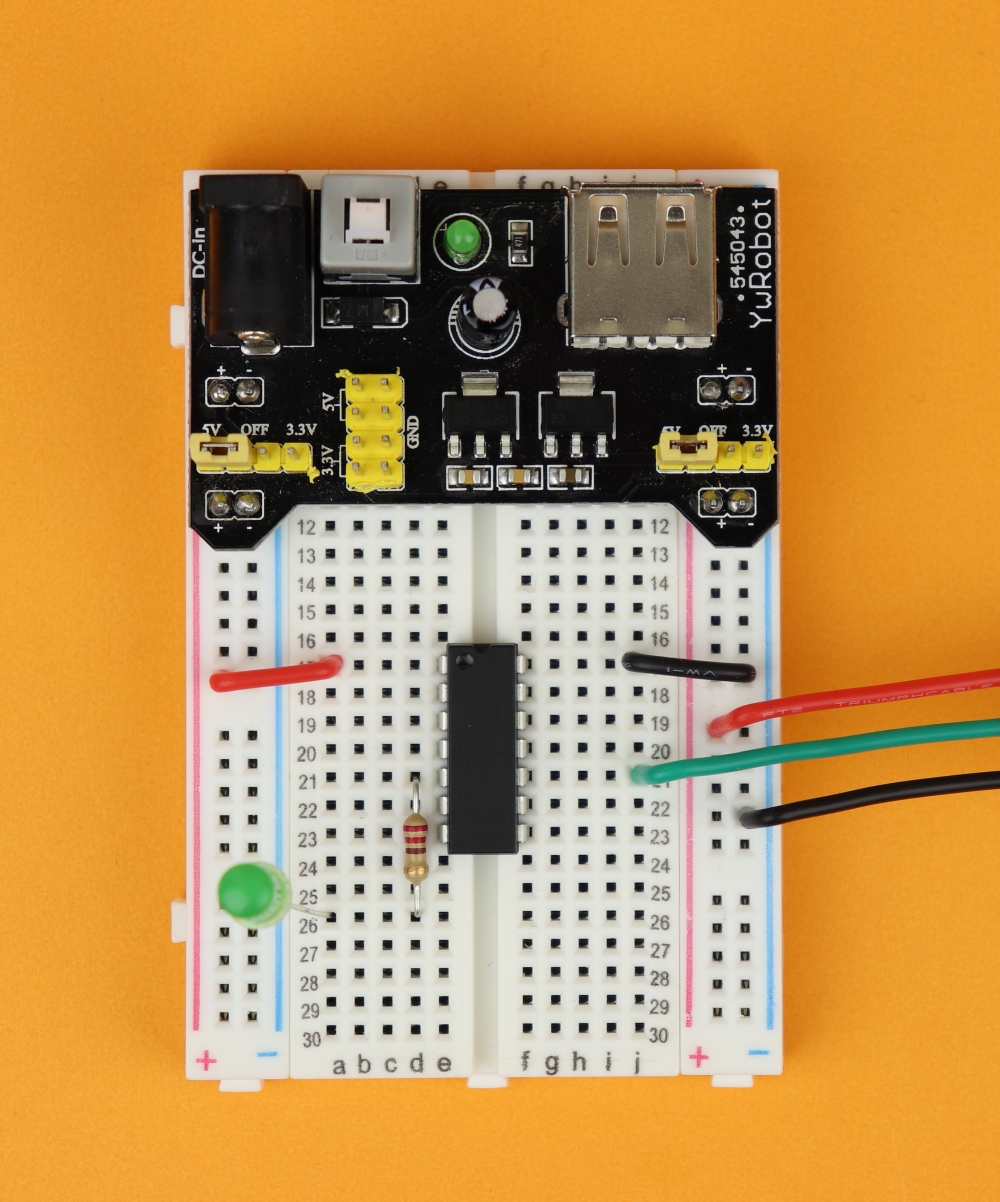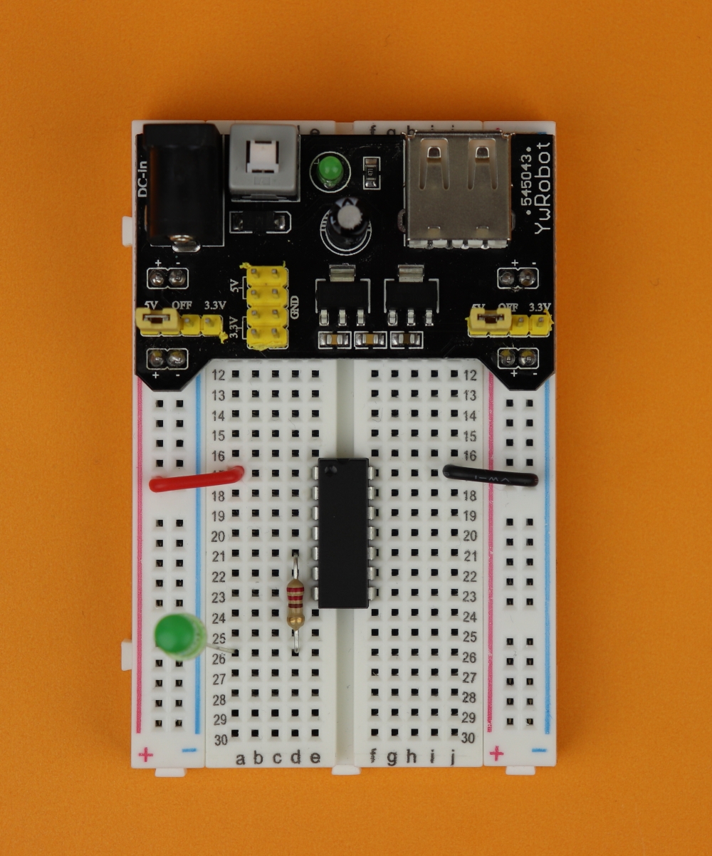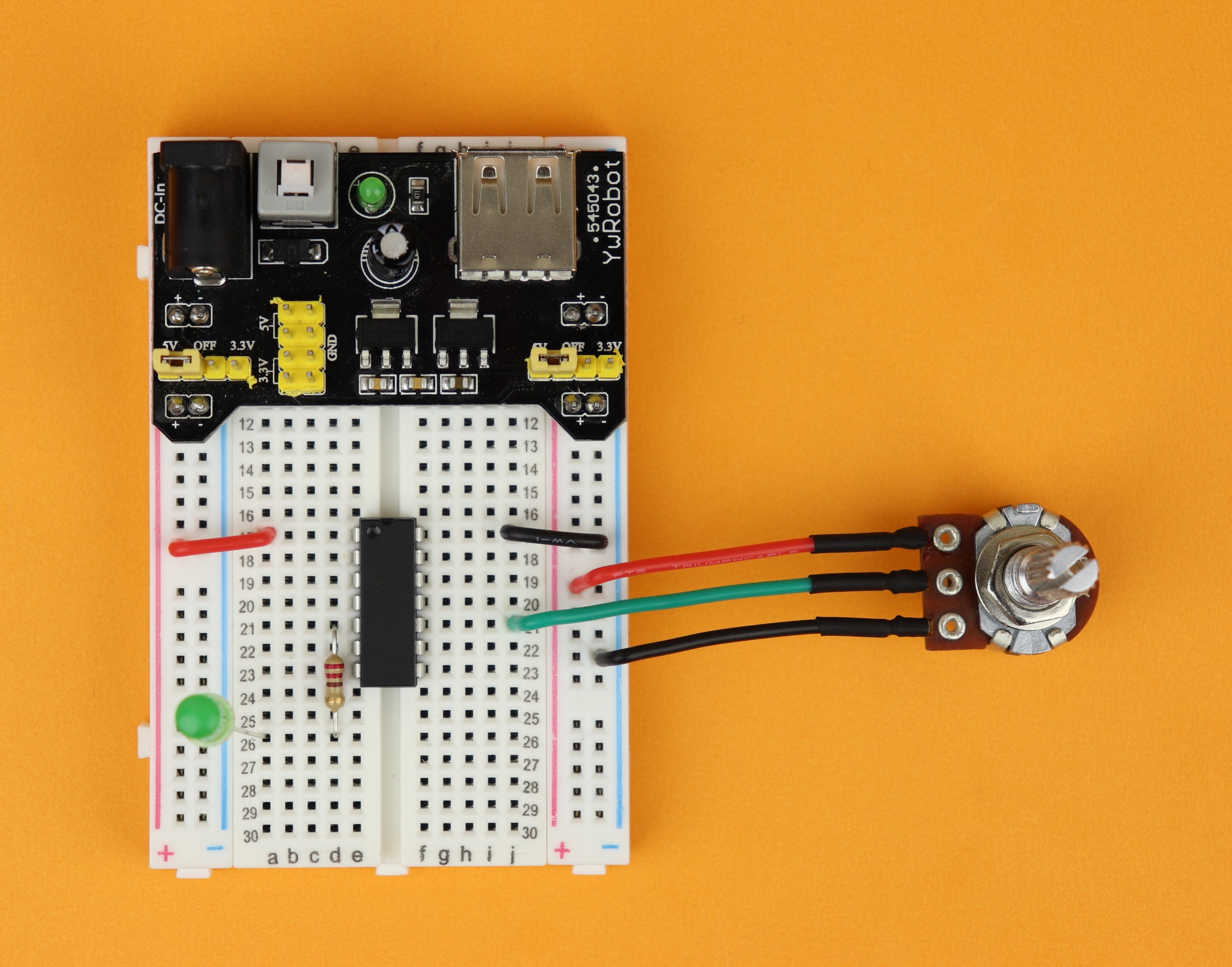 And that's it! You can now plug a standard USB cable into the USB breadboard power supply, and turn the power supply on by pressing the white-greyish button. After that, you can use the potentiometer to adjust the brightness of your LED!