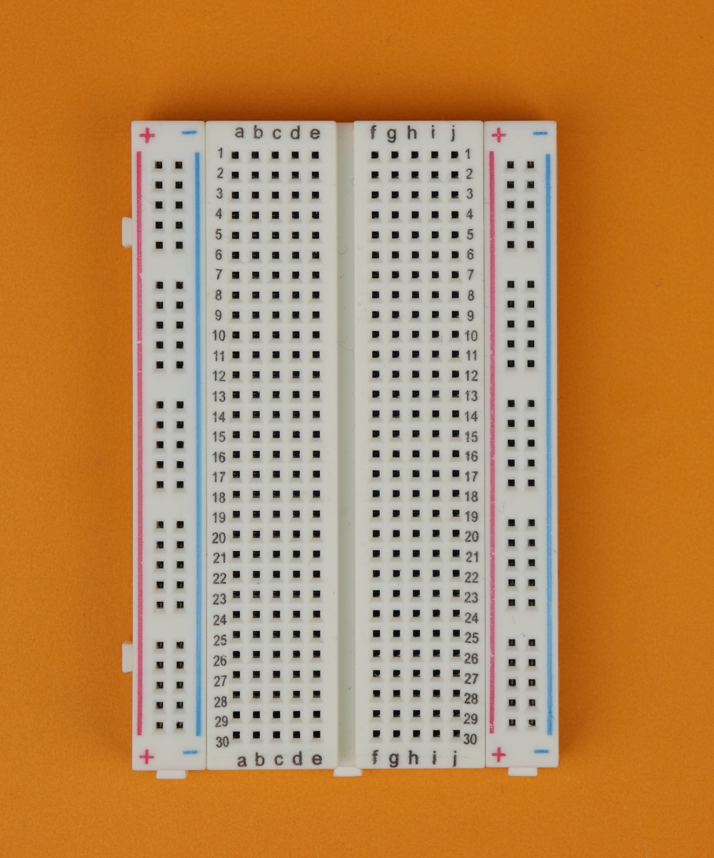Place the 400-pin breadboard in front of you :) We will call the blue lines the VSS or ground rails, and the red lines the VDD rail. They will later carry the operating voltage for our circuit.
