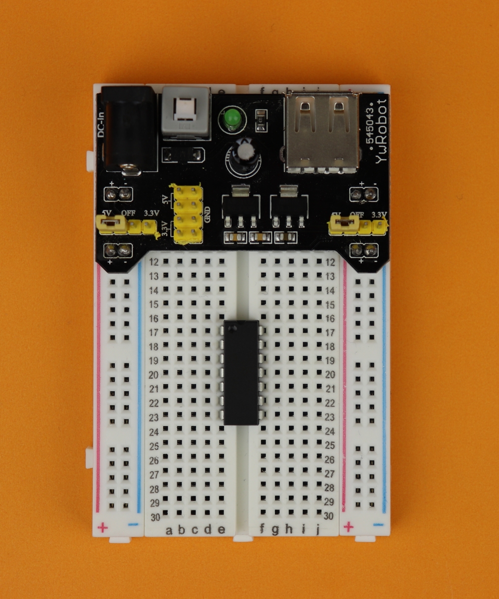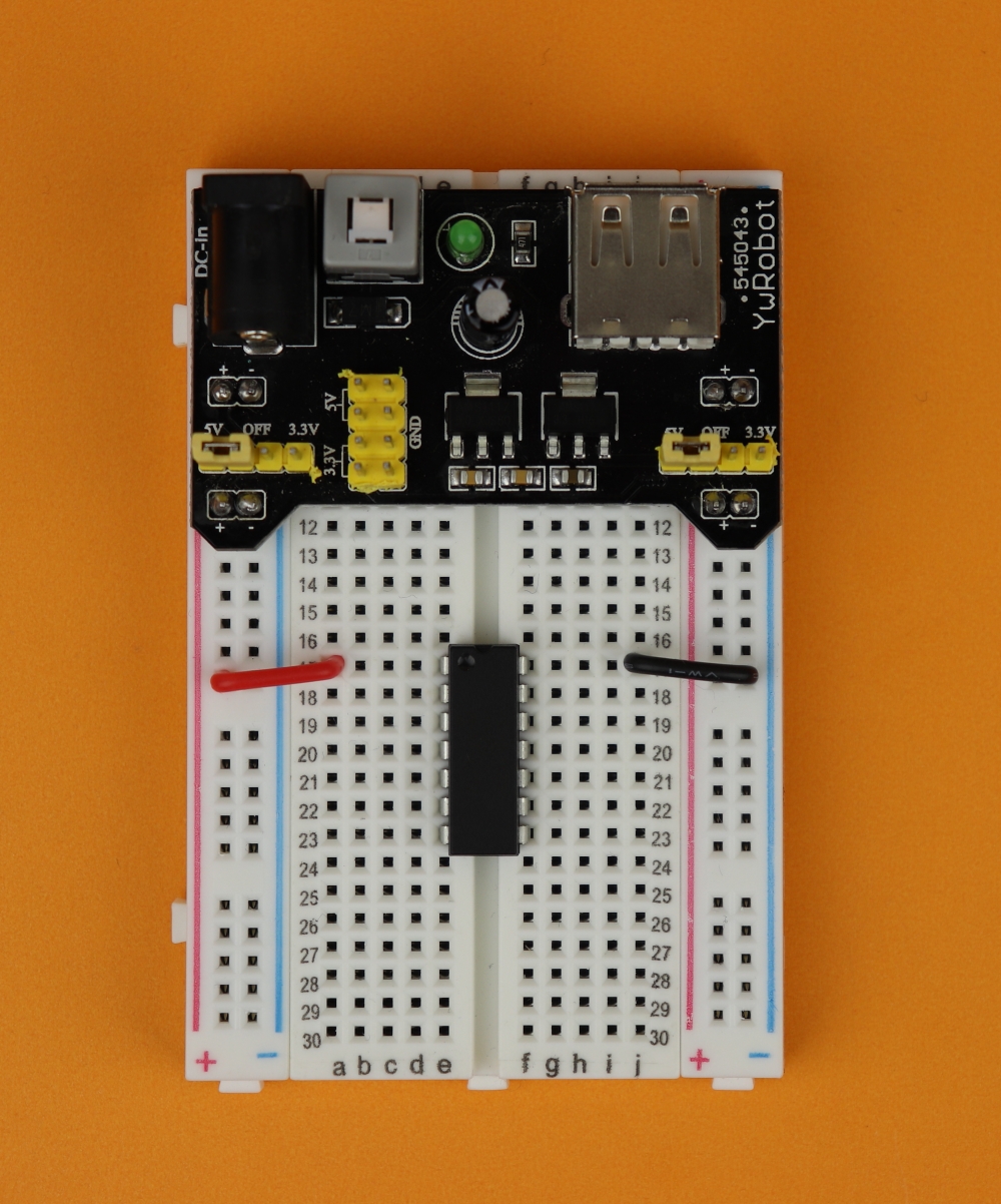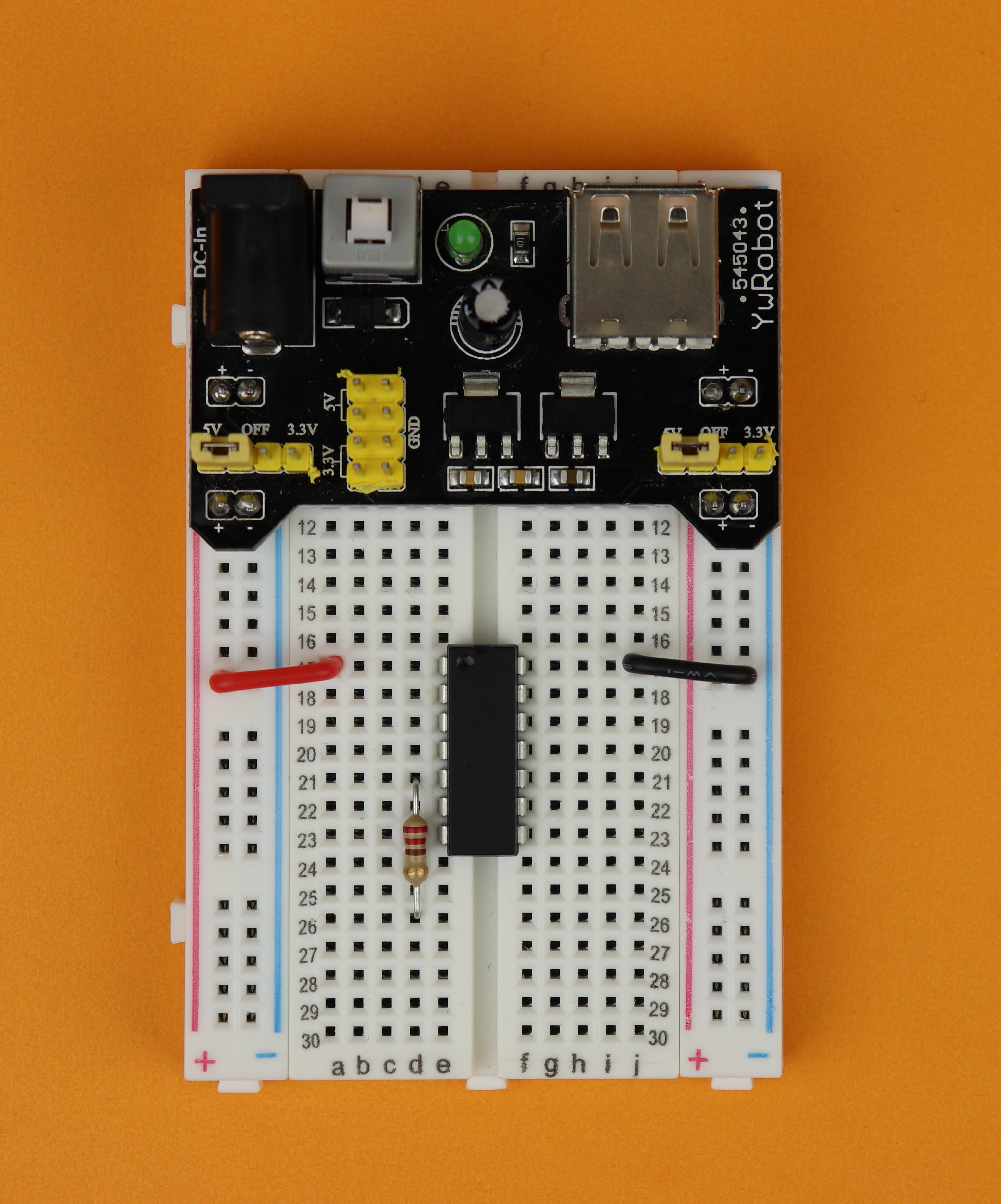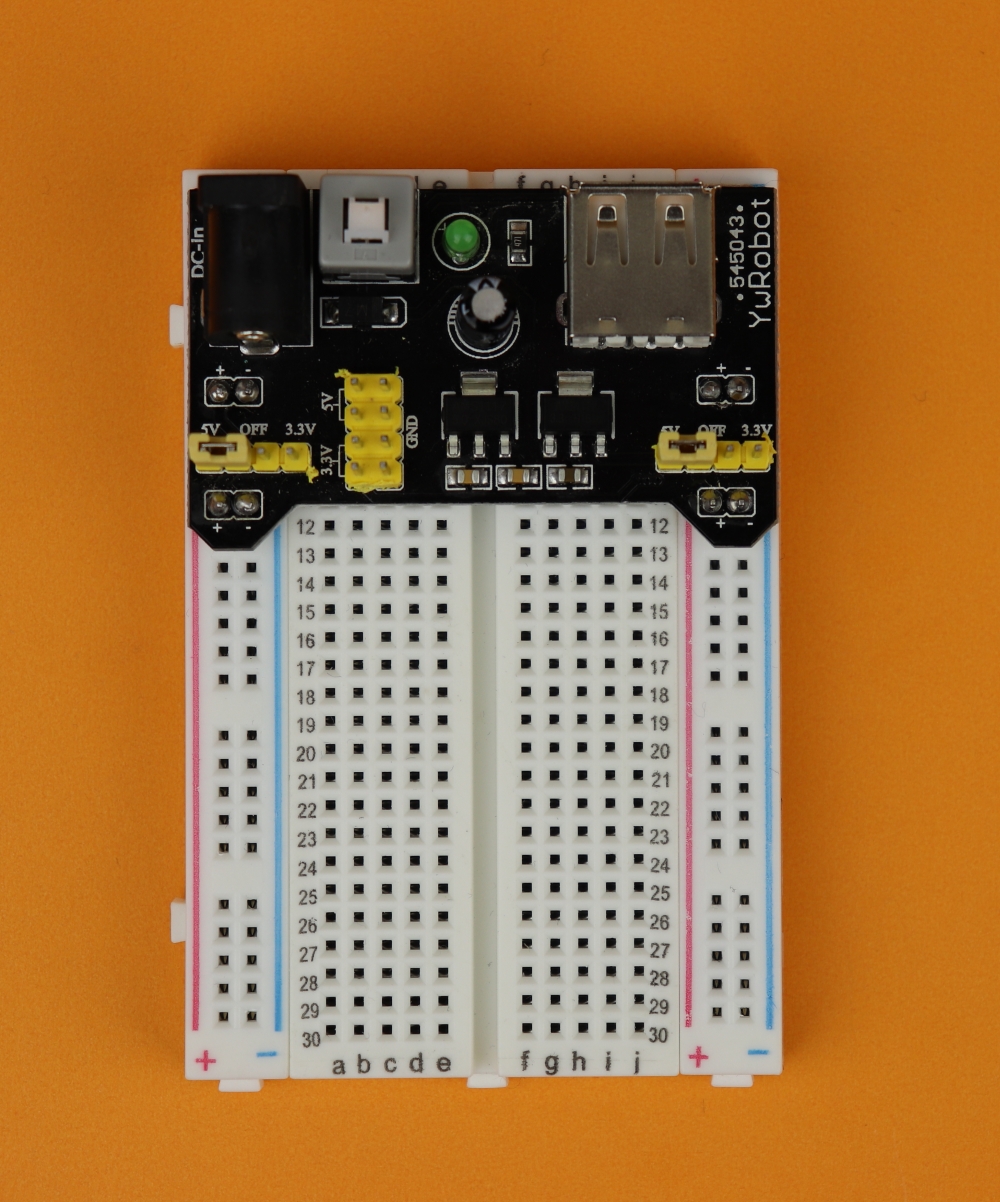 Insert the USB breadboard power supply in the upper part of the breadboard. Make sure the jumpers are set to 5V (and not to 3.3V), because otherwise the LED will not reach its maximum brightness.