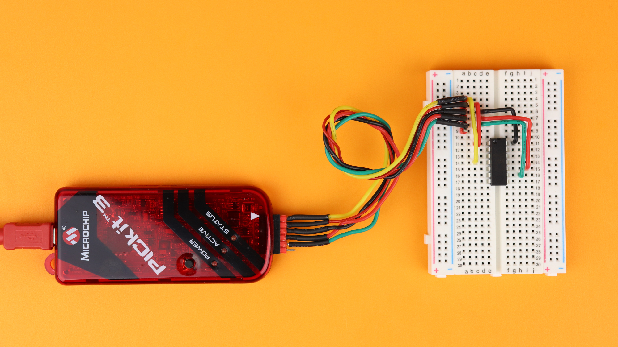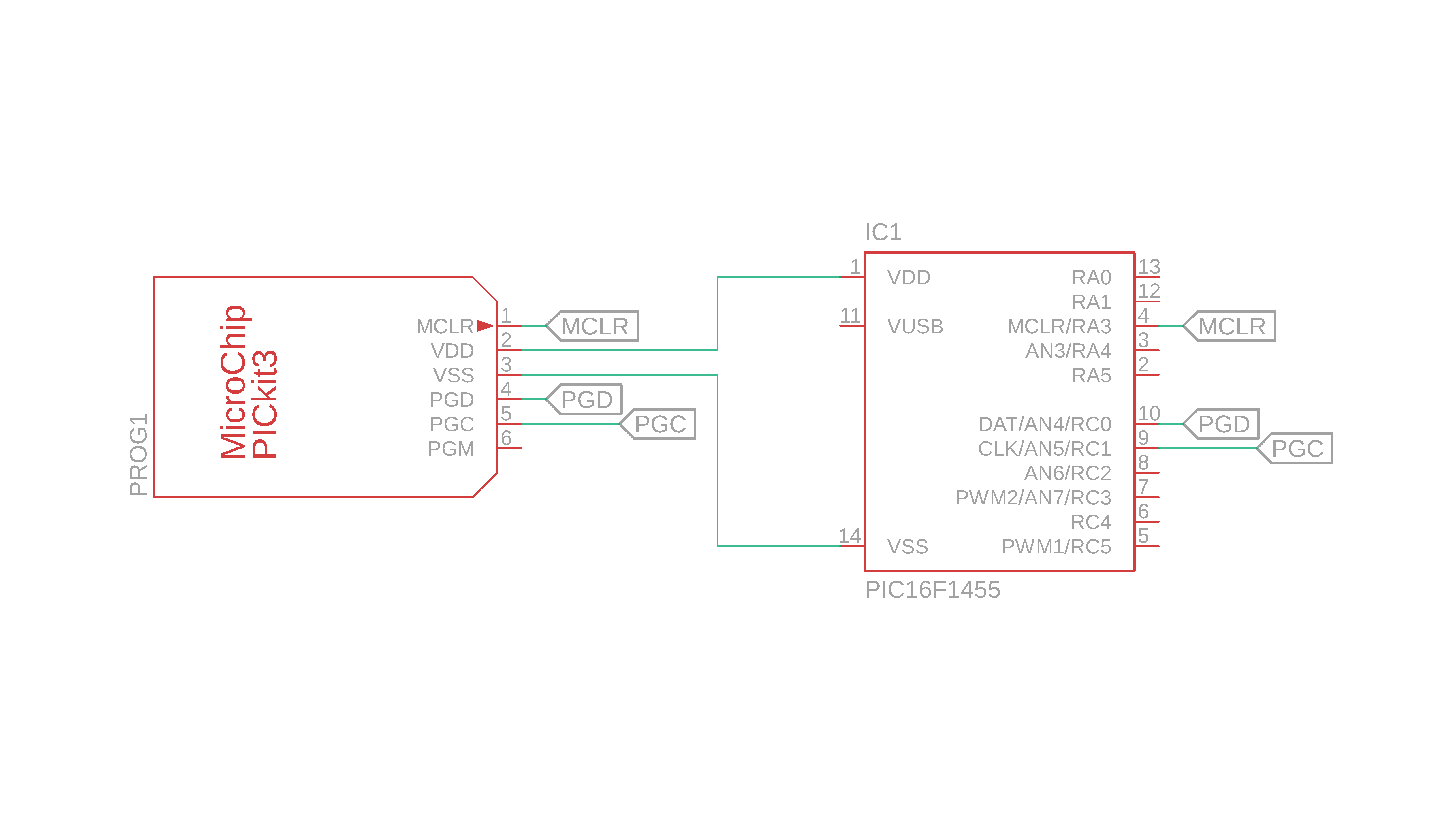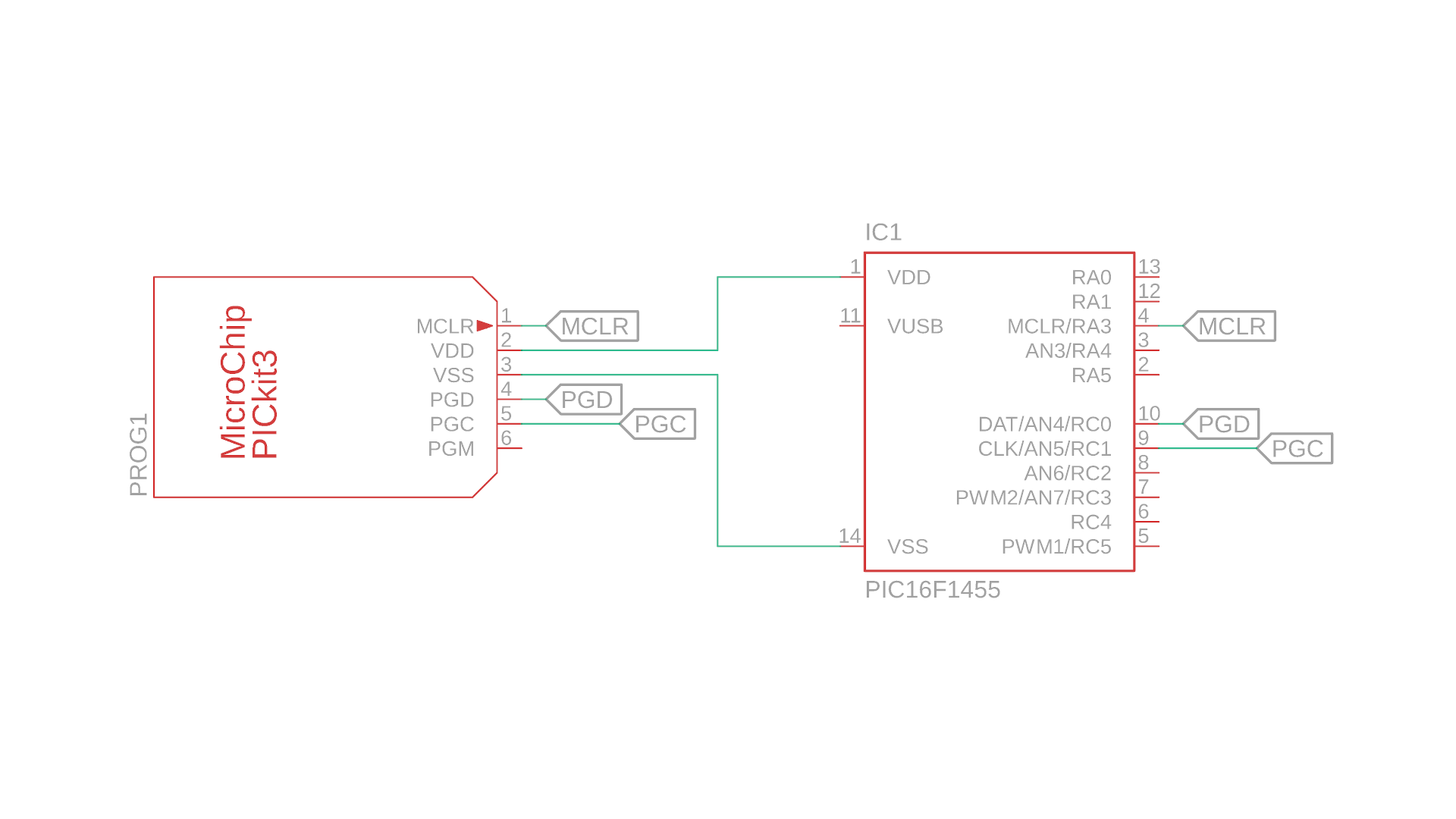 Connect pin 1 of the PIC16F1455 to VDD (the red wire), and pin 14 of the PIC16F1455 to VSS (the black wire).