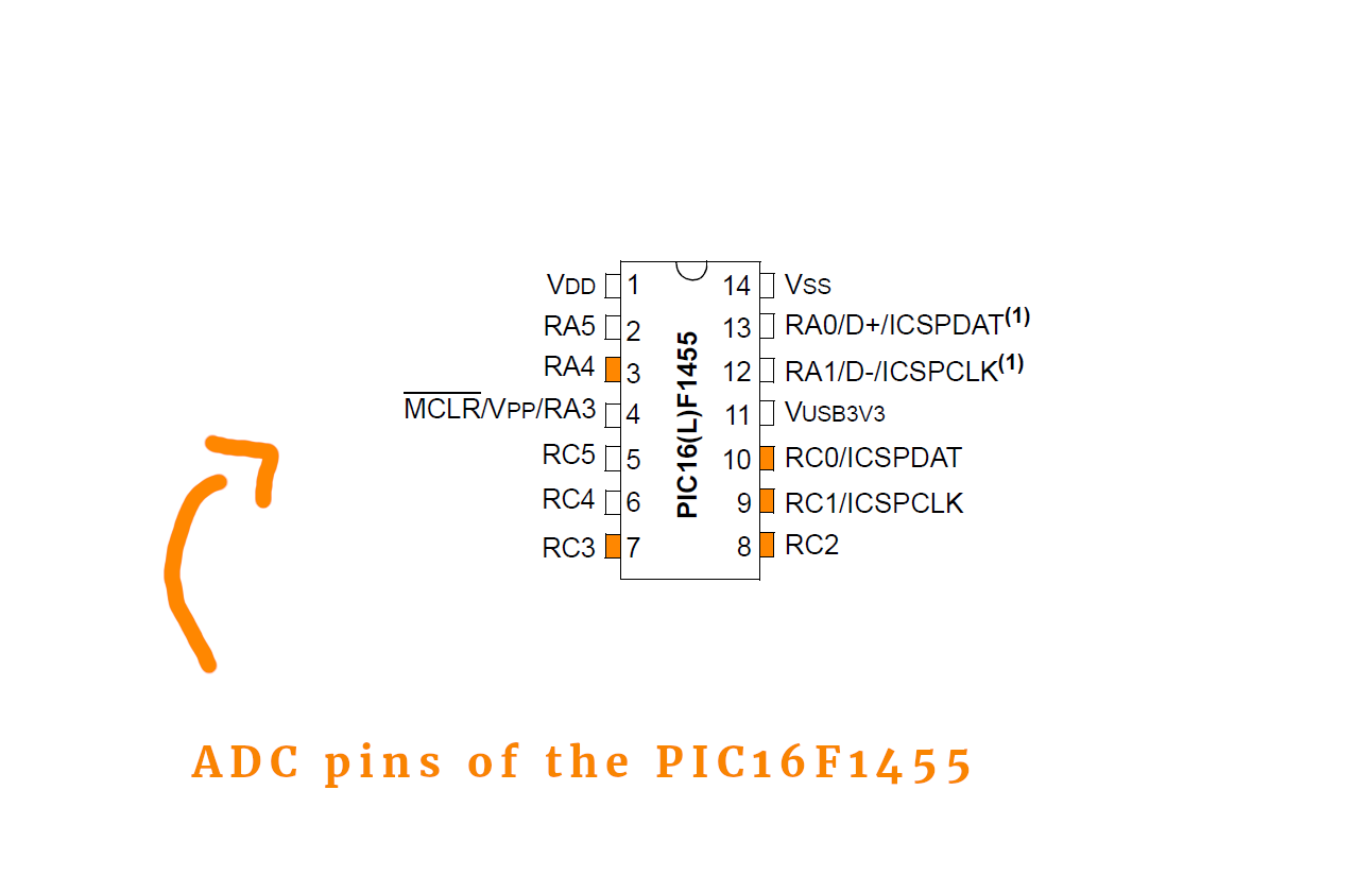 All ADC inputs are highlighted in orange, and, as you can see, there are many of them! The PIC16F1455 only has one built-in ADC module, however, and we have to control with our software (see below) which analog input is connected to the ADC module.