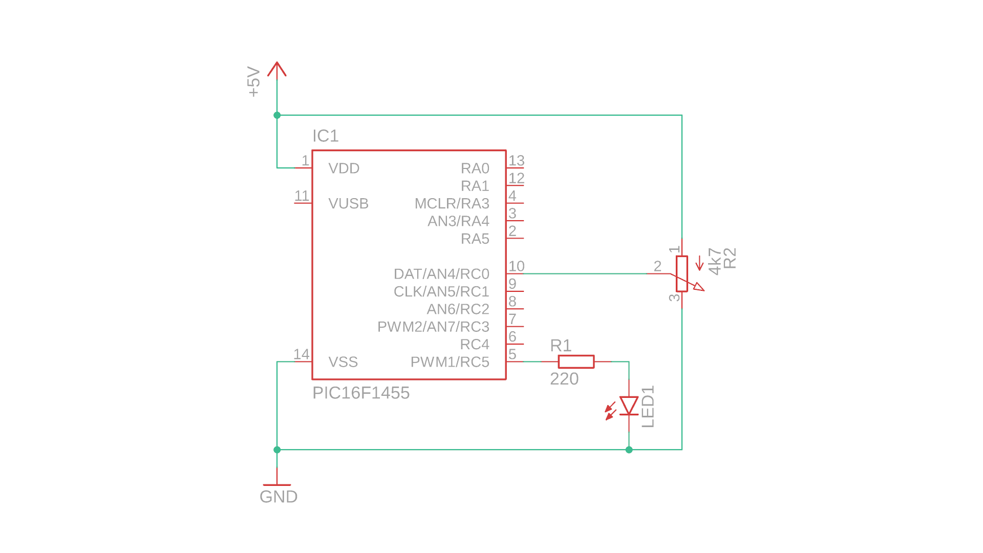 Our little test circuit is very simple: we will convert the position of the potentiometer into a number from 0-1023 (because the PIC16F1455's ADC module has a resolution of 10 bit) and then we will use pulse-width modulation to adjust the brightness of an LED accordingly. The PIC16F1455's PWM module also has a resolution of 10 bit, so we can just take the 10 bit ADC conversion result and write it into the duty-cycle register of the PWM module.