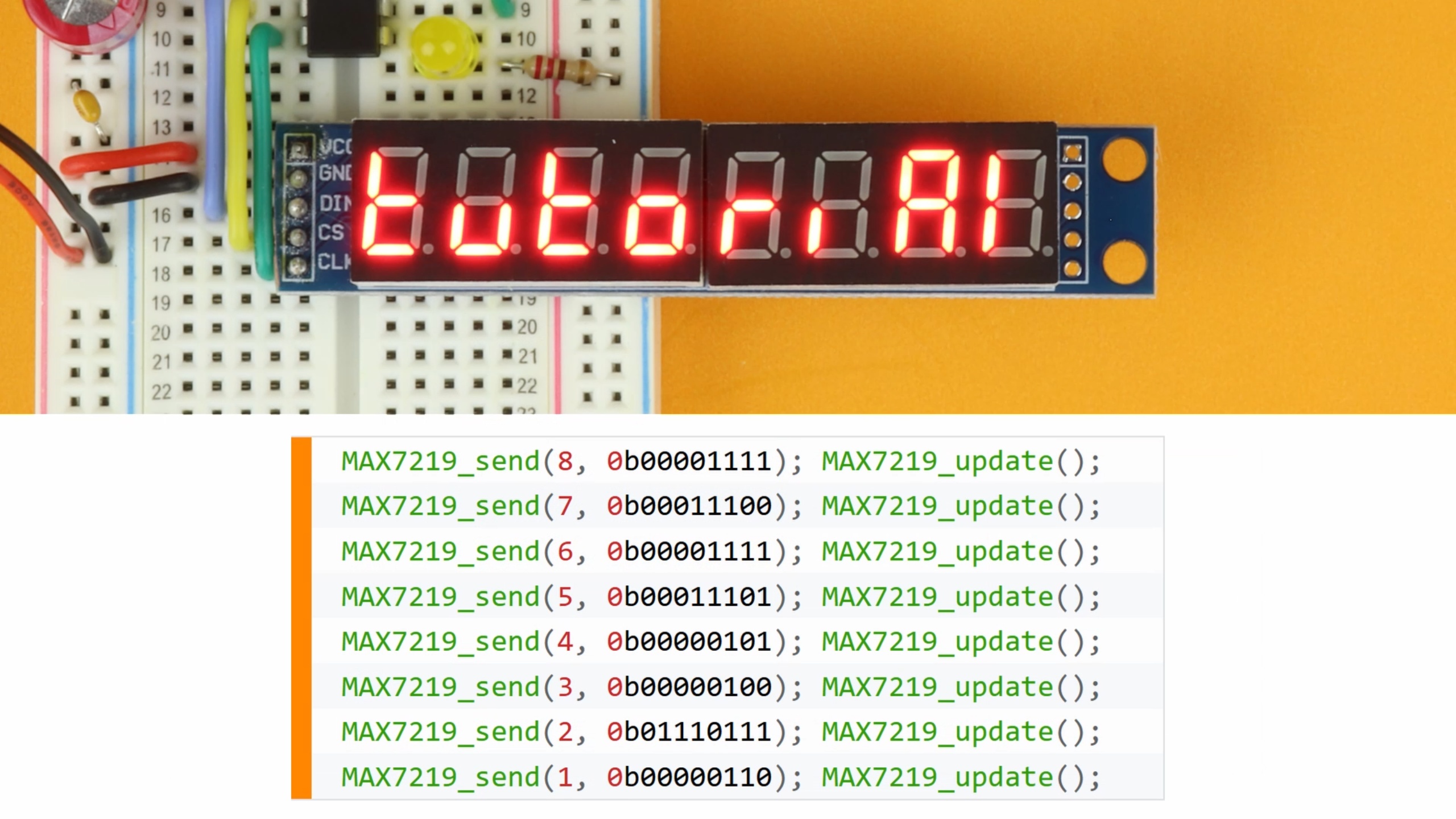 MAX7219_send(6, 0b00001111); MAX7219_send(6, 0b00000111); MAX7219_send(6, 0b00000011); MAX7219_send(6, 0b00111111); MAX7219_update();