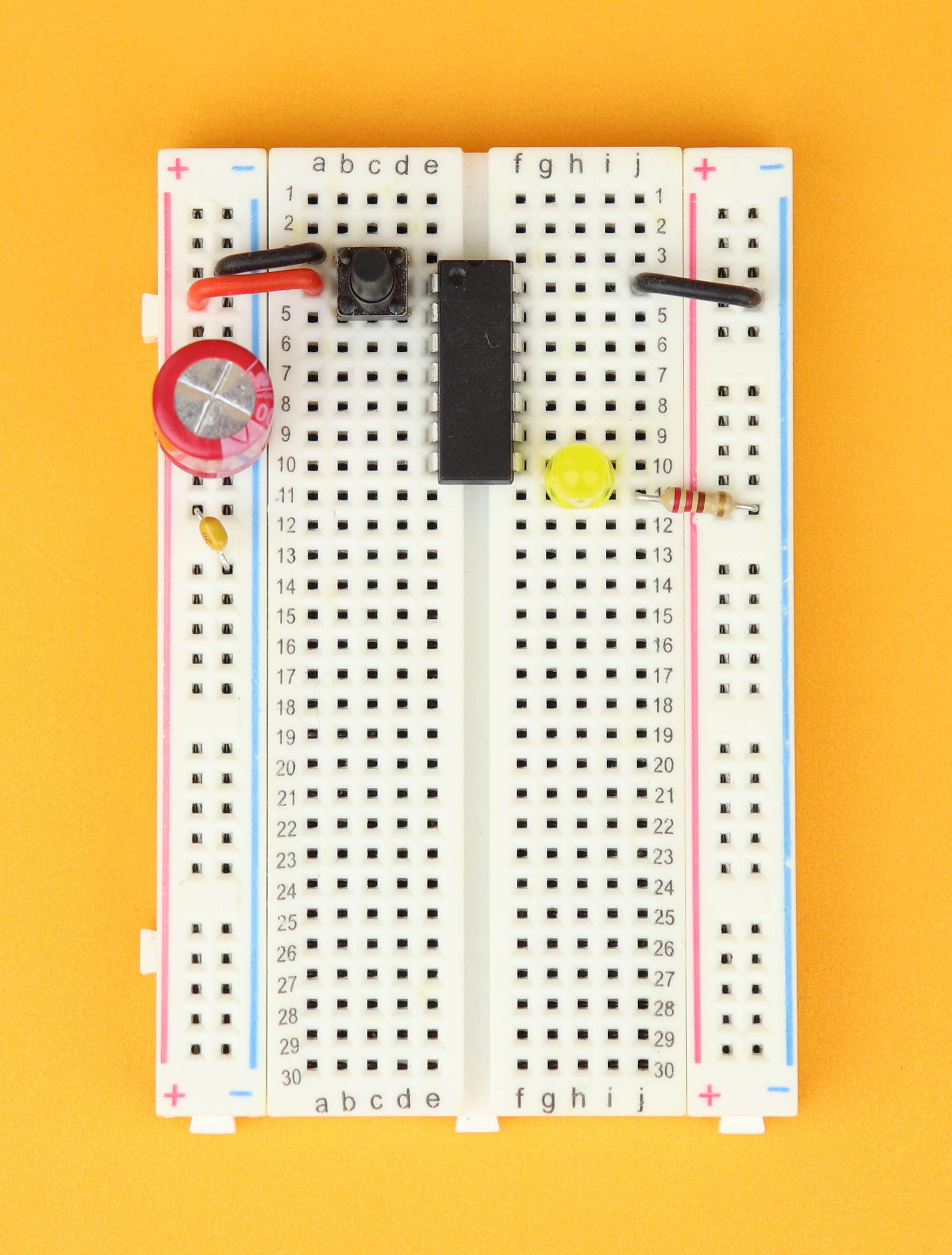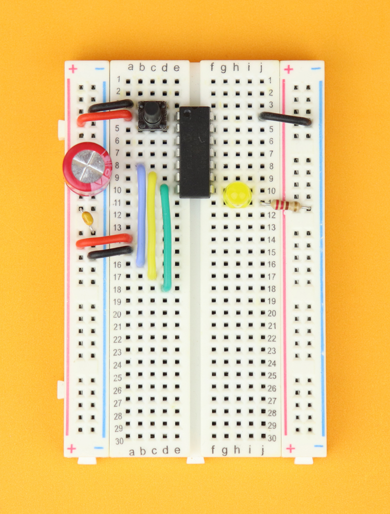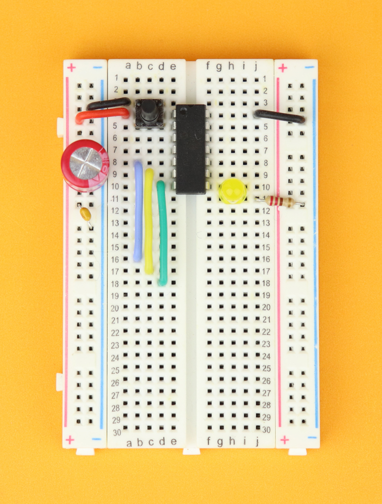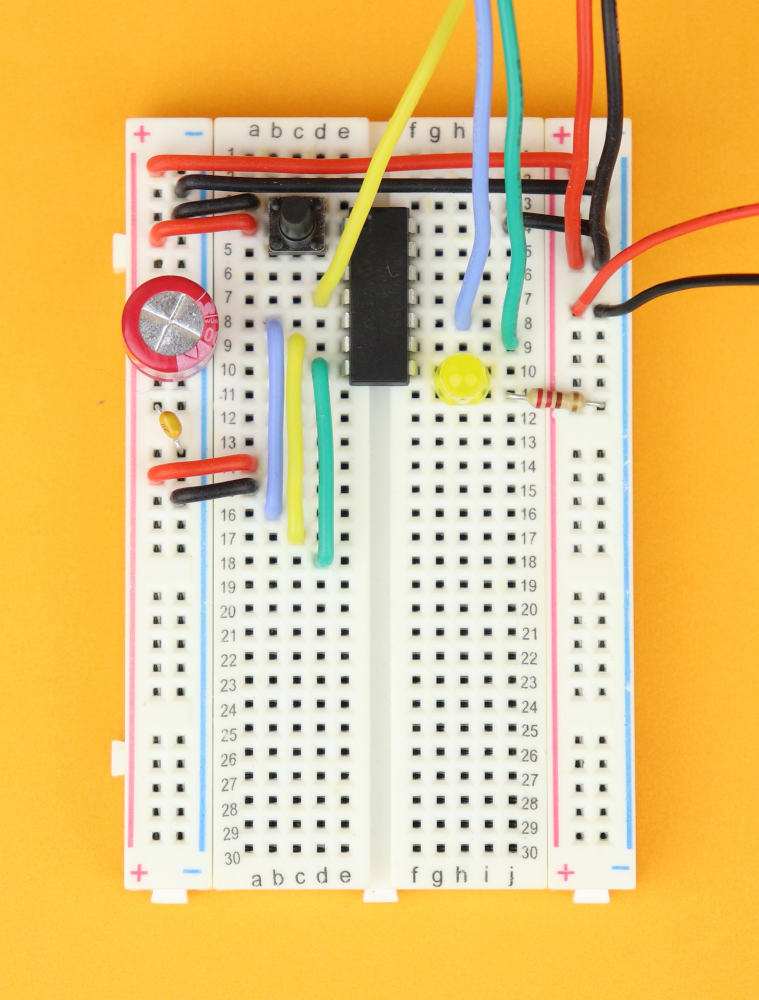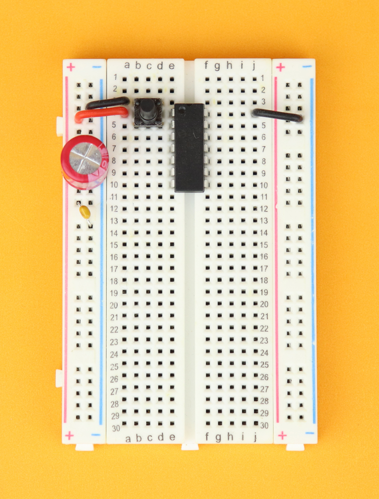 - We also need a 400-pin breadboard, together with a 100μF and 100nF capacitor, an LED, a 220Ω resistor, and a pushbutton.