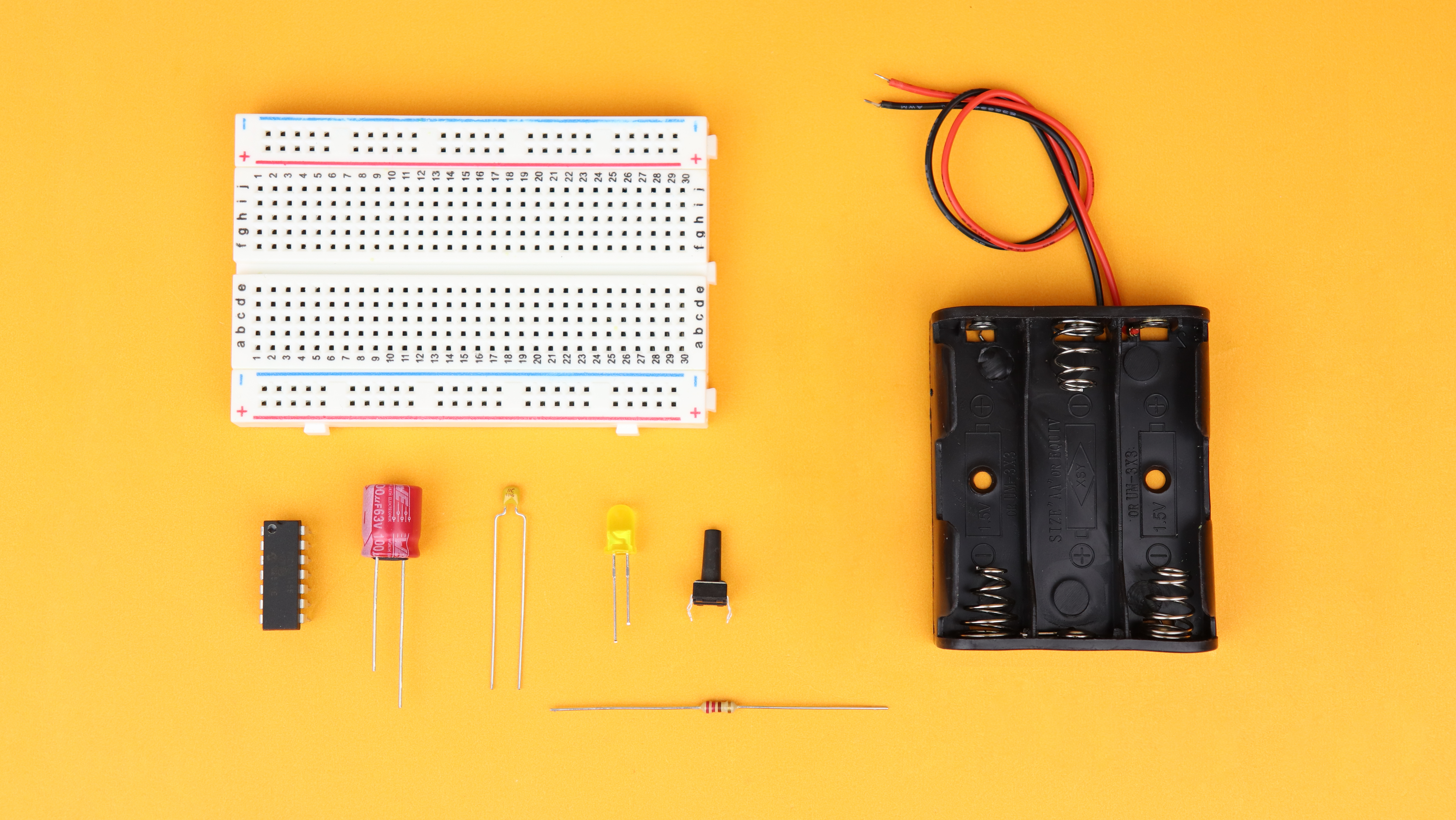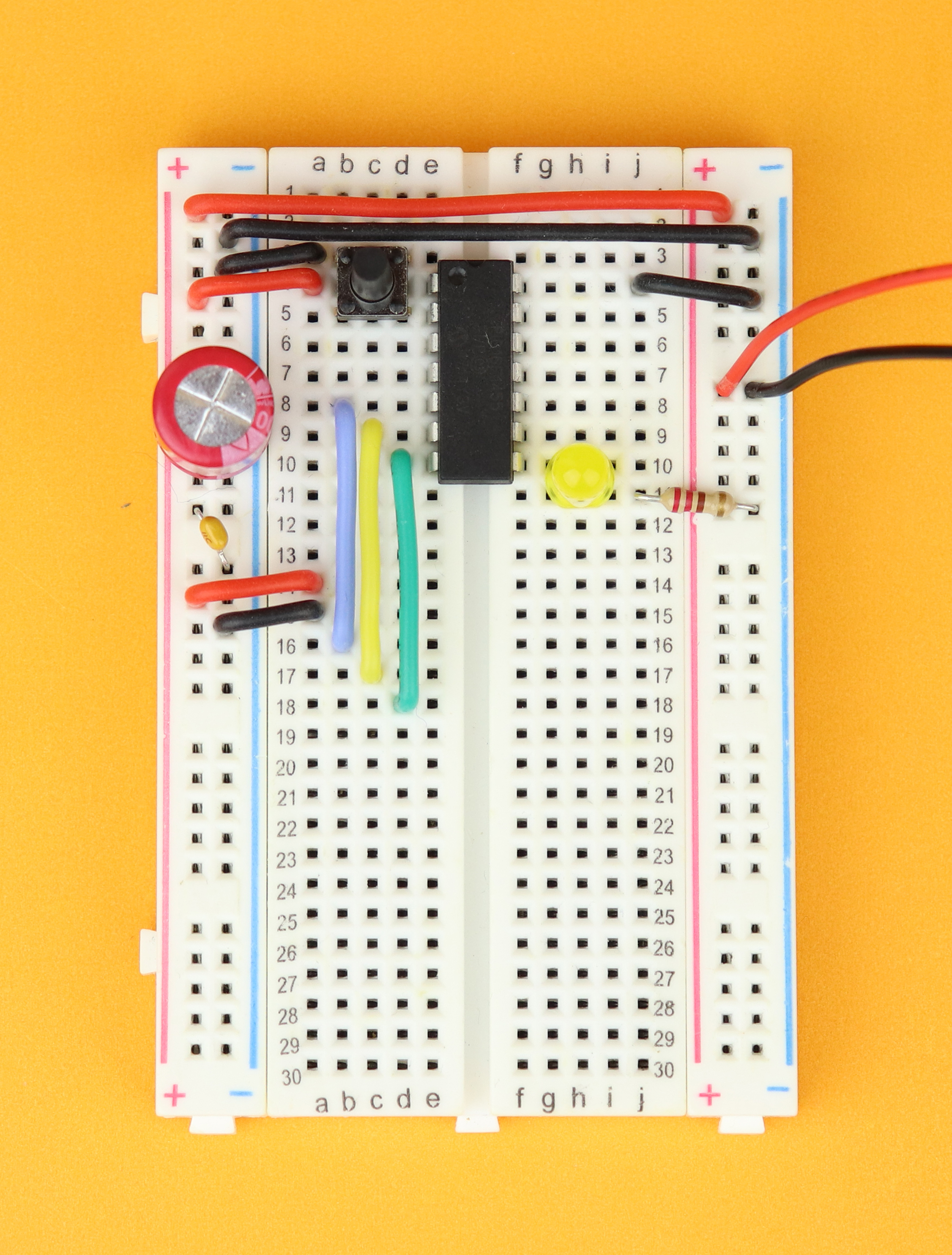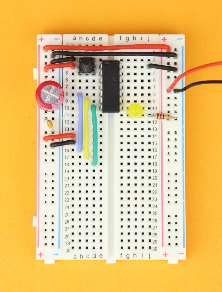 - We also need a 400-pin breadboard, together with a 100μF and 100nF capacitor, an LED, a 220Ω resistor, and a pushbutton.