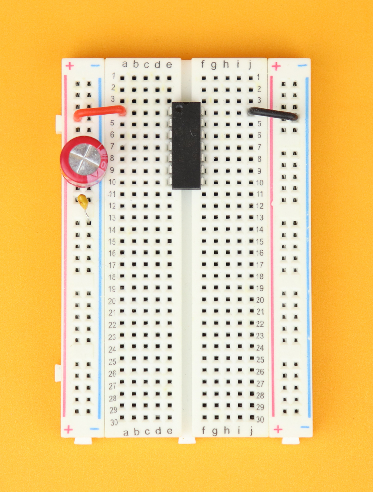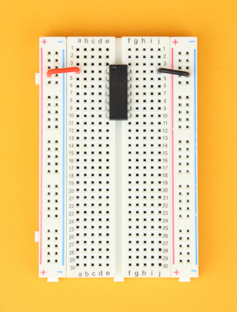 Place the 400-pin breadboard in front of you, and make sure row 1 is at the top. Insert the PIC16F1455 in row 4 and connect it to power at pins 1 and 14.