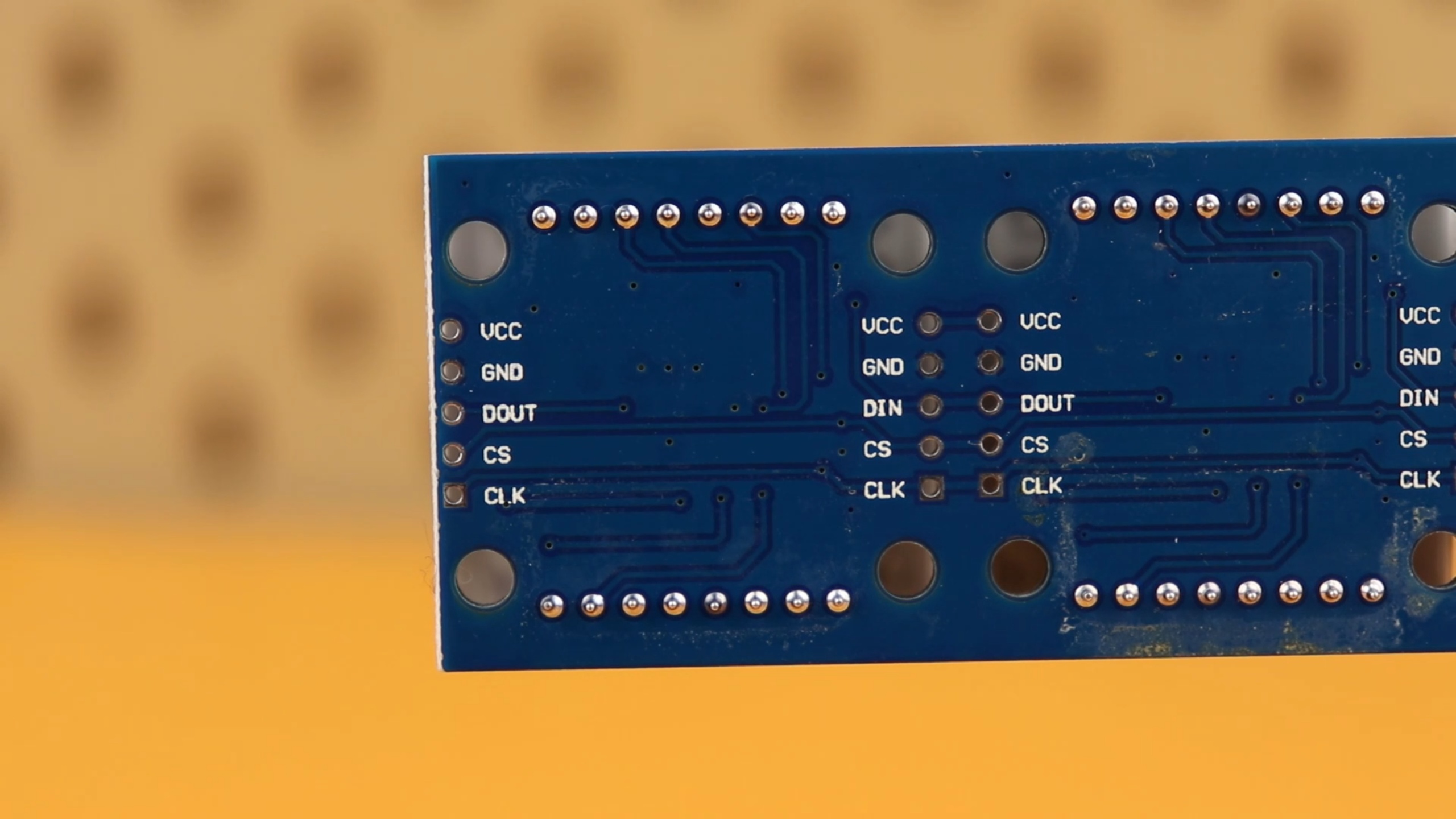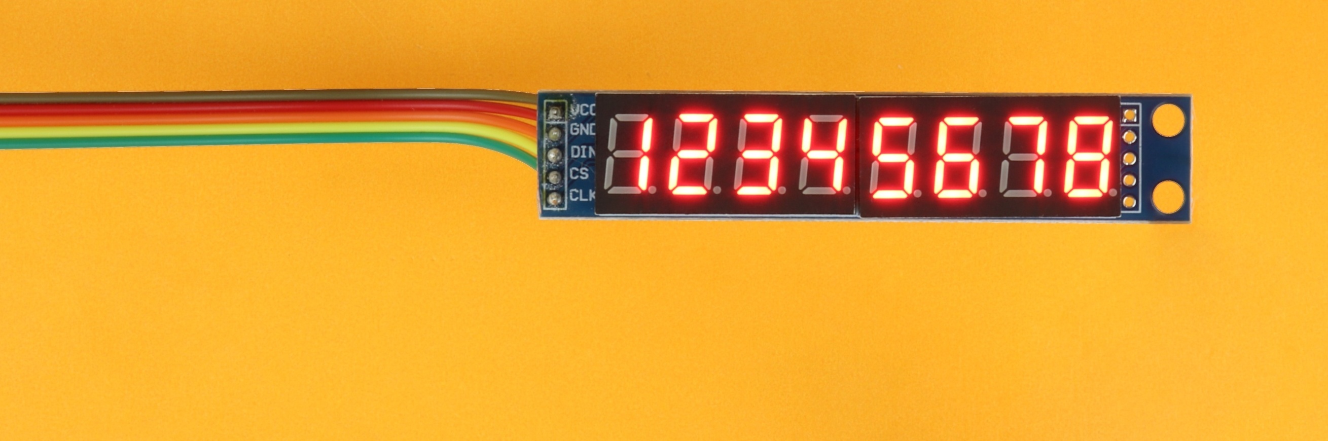 Insert two more wires for VDD and ground, and this way we can later plug in any MAX7219-based module we want right here because they all tend to have the same pinout, more on that below.