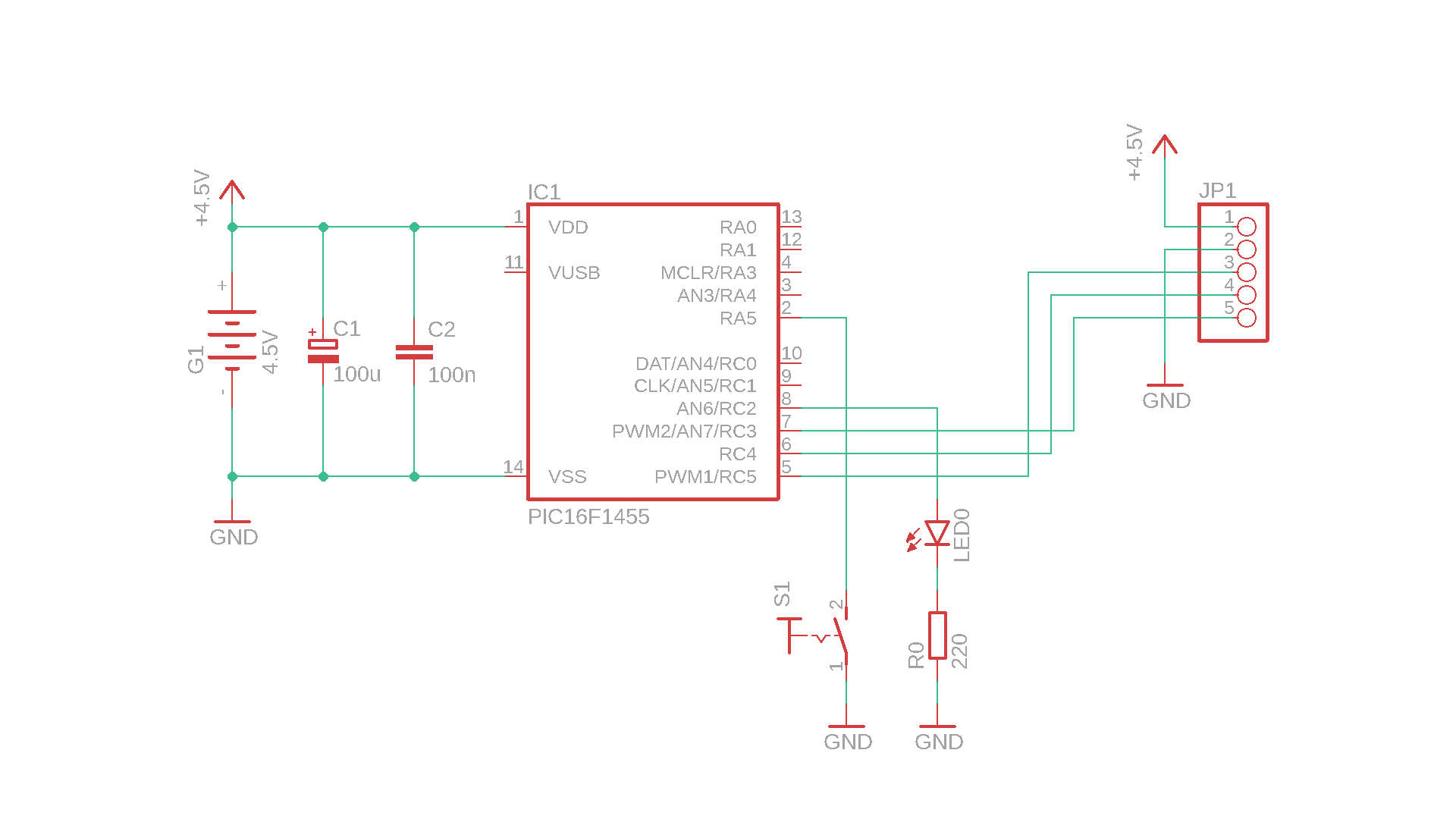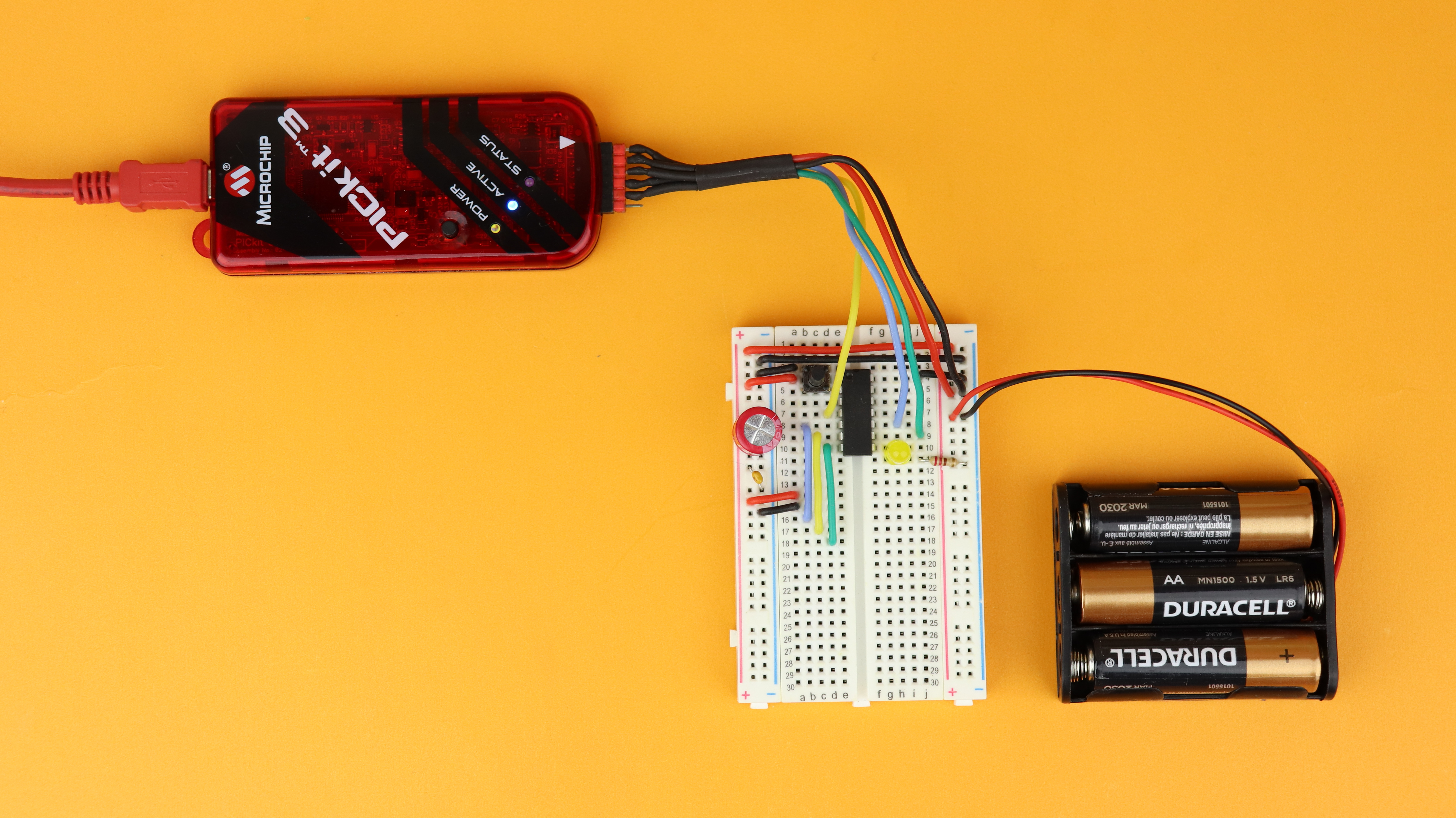 And last, wire up the PICkit3 to the PIC16F1455. VDD and GND can be connected into the power rail, MCLR goes into pin 4 of the PIC16F1455, PGD into pin 10, and PGC into pin 9.