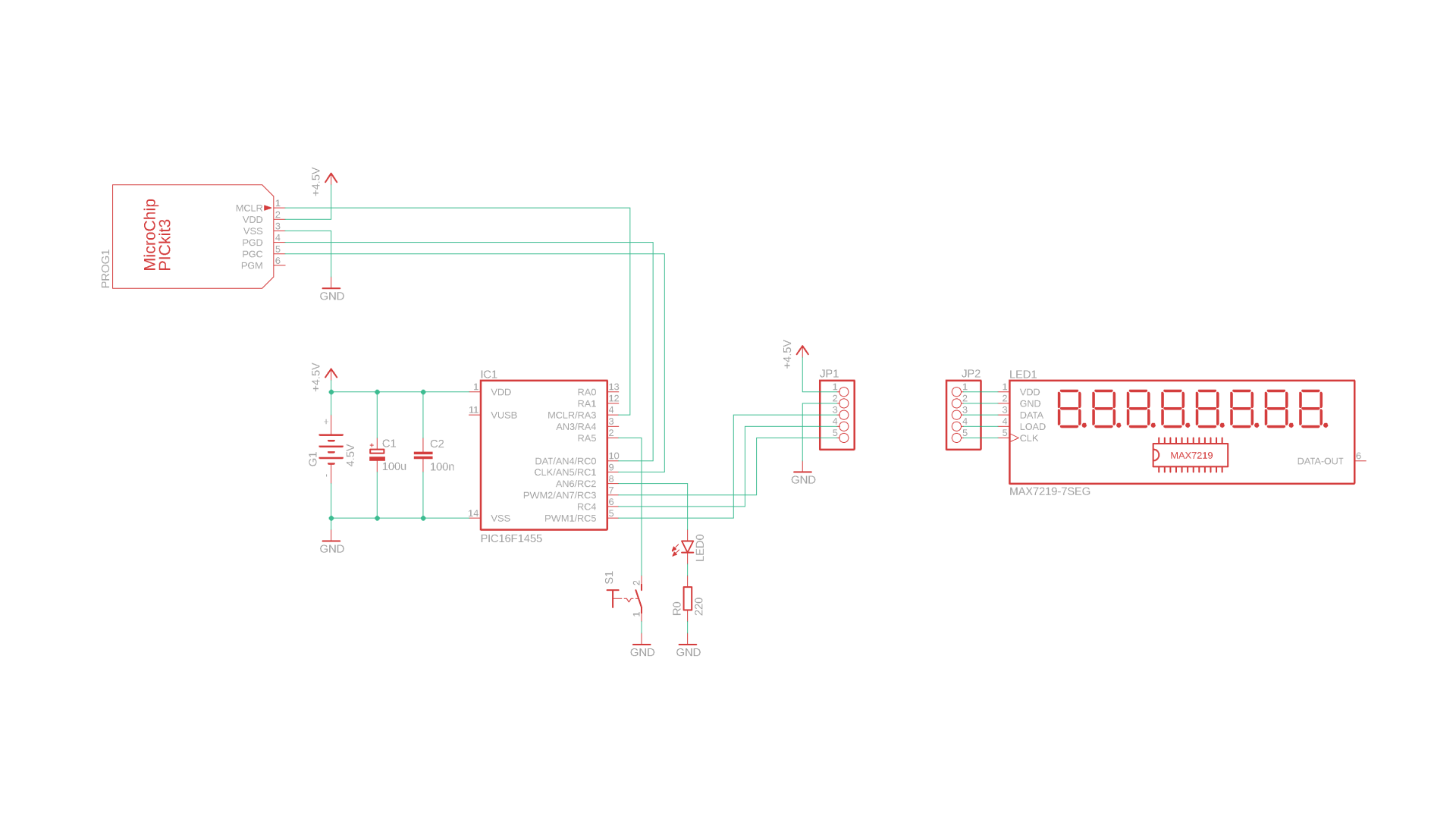 This here is our simple test circuit, and the MAX7219 display module can be plugged in at the jumper JP1 later: