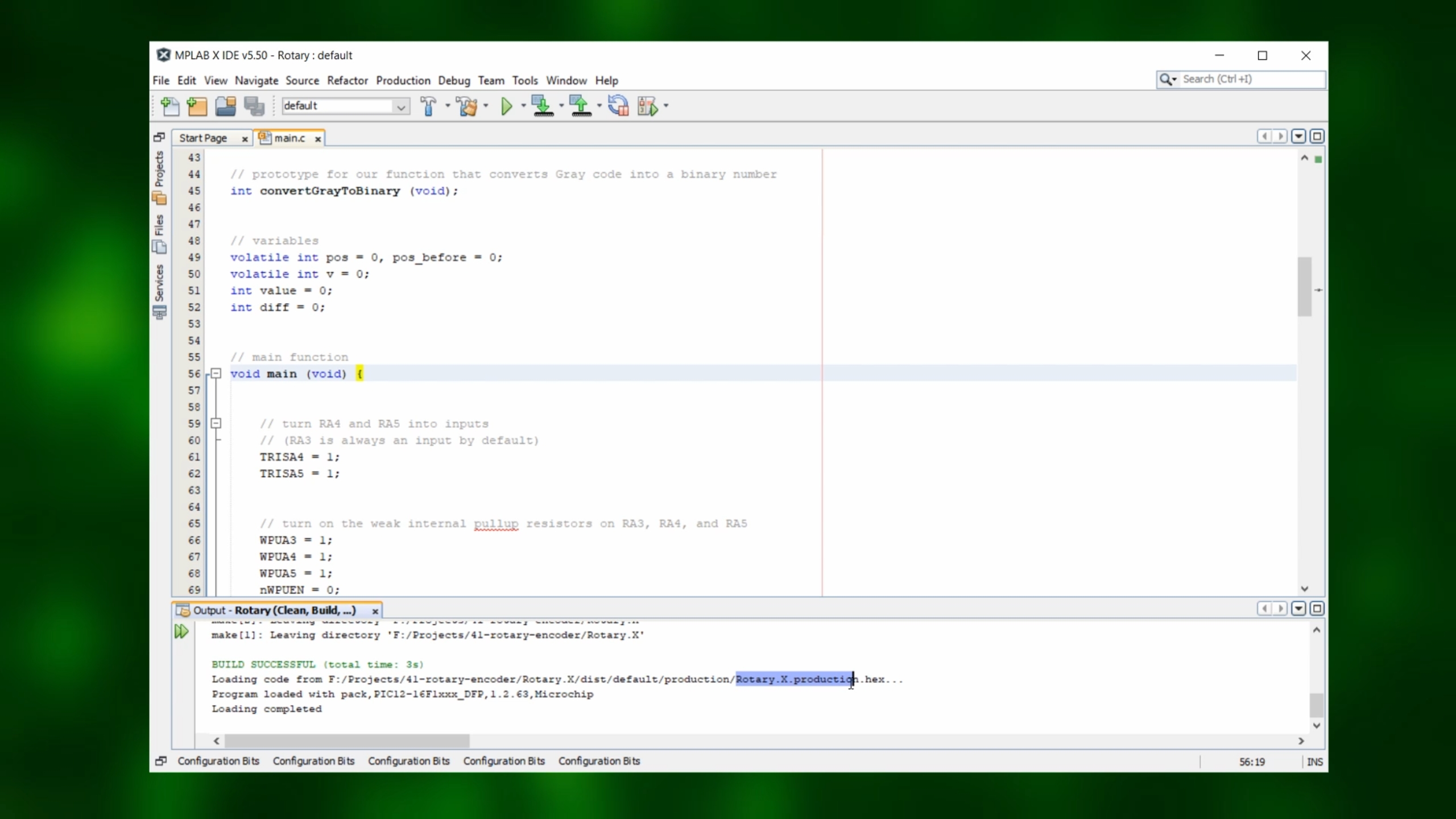 Now that we have the source code, create a project inside the MPLAB IDE and compile this code into a .hex-file. That's basically the code that the microcontroller can understand directly, and if you don't want to use the MPLAB IDE you can just download the rotary.hex file directly from the resources box, no coding needed.
