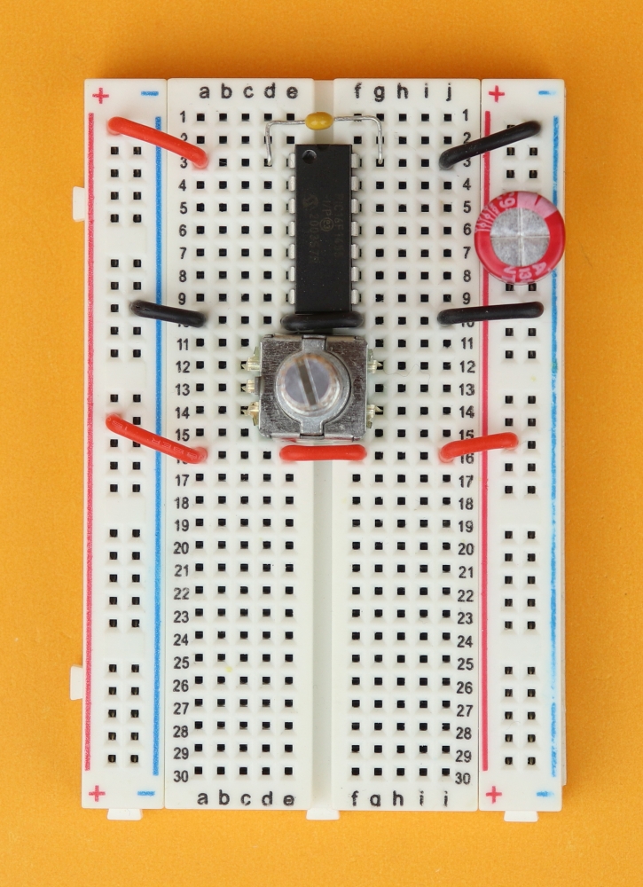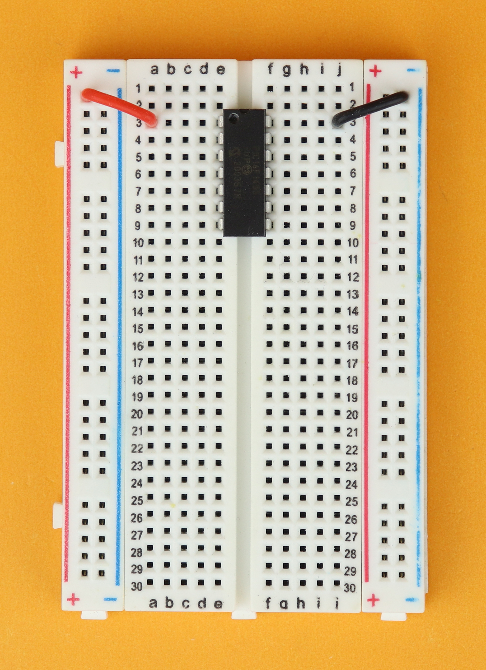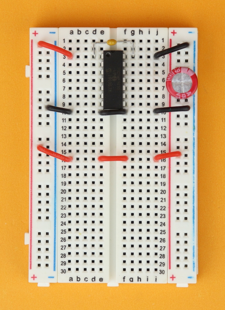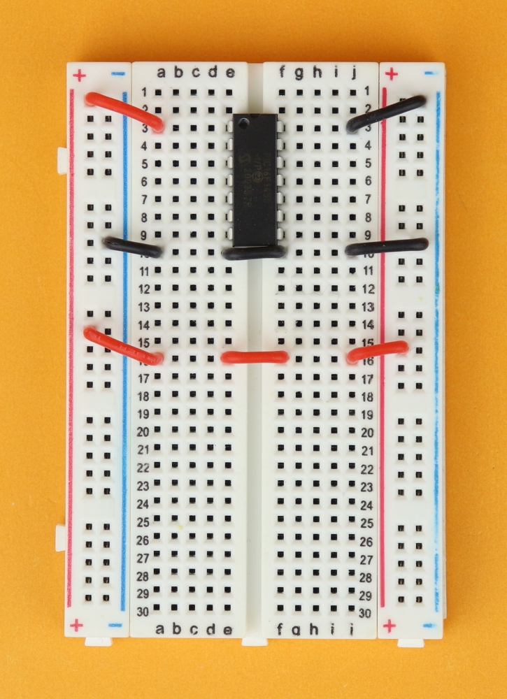 Place the 400-pin breadboard in front of you, and make sure row 1 is at the top. Insert the PIC16F1455 in row 3 and connect it to power at pins 1 and 14.