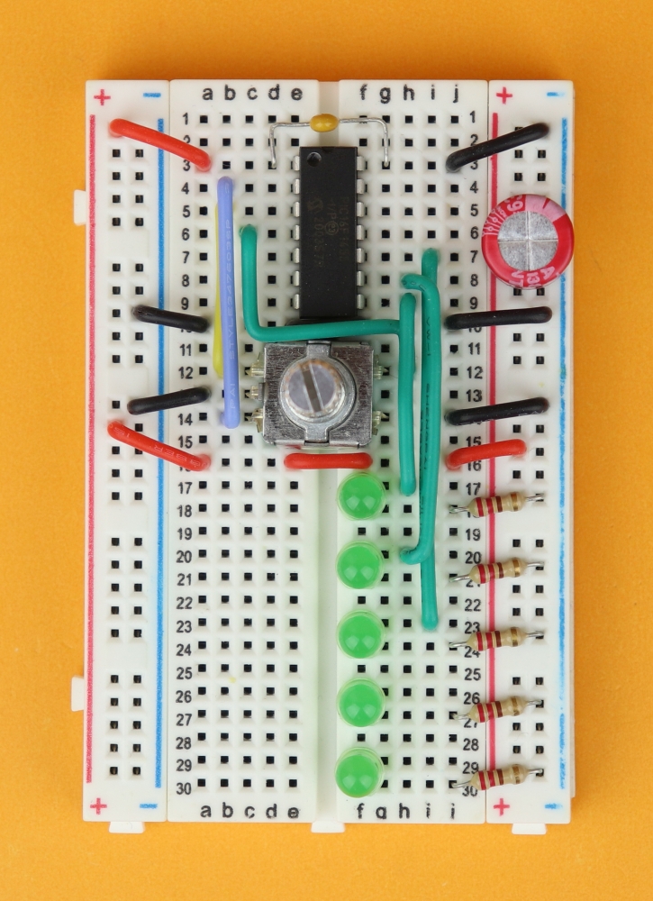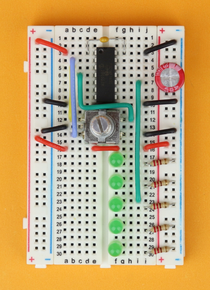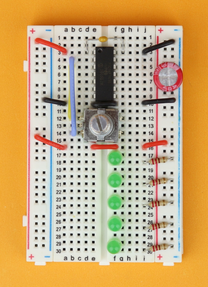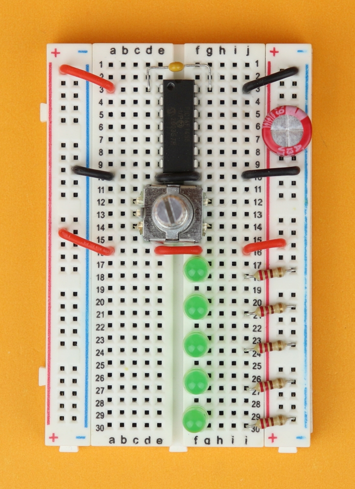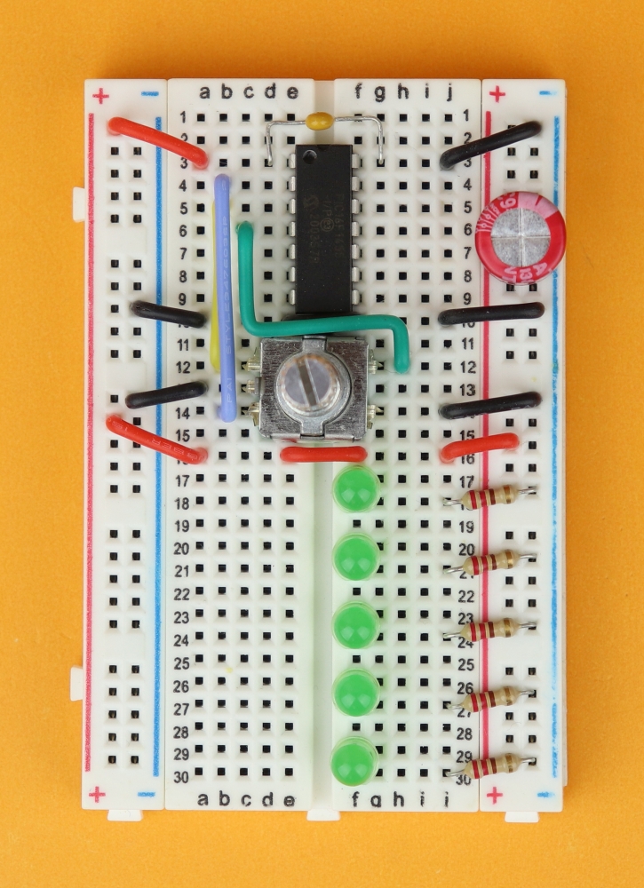 Place the 400-pin breadboard in front of you, and make sure row 1 is at the top. Insert the PIC16F1455 in row 3 and connect it to power at pins 1 and 14.