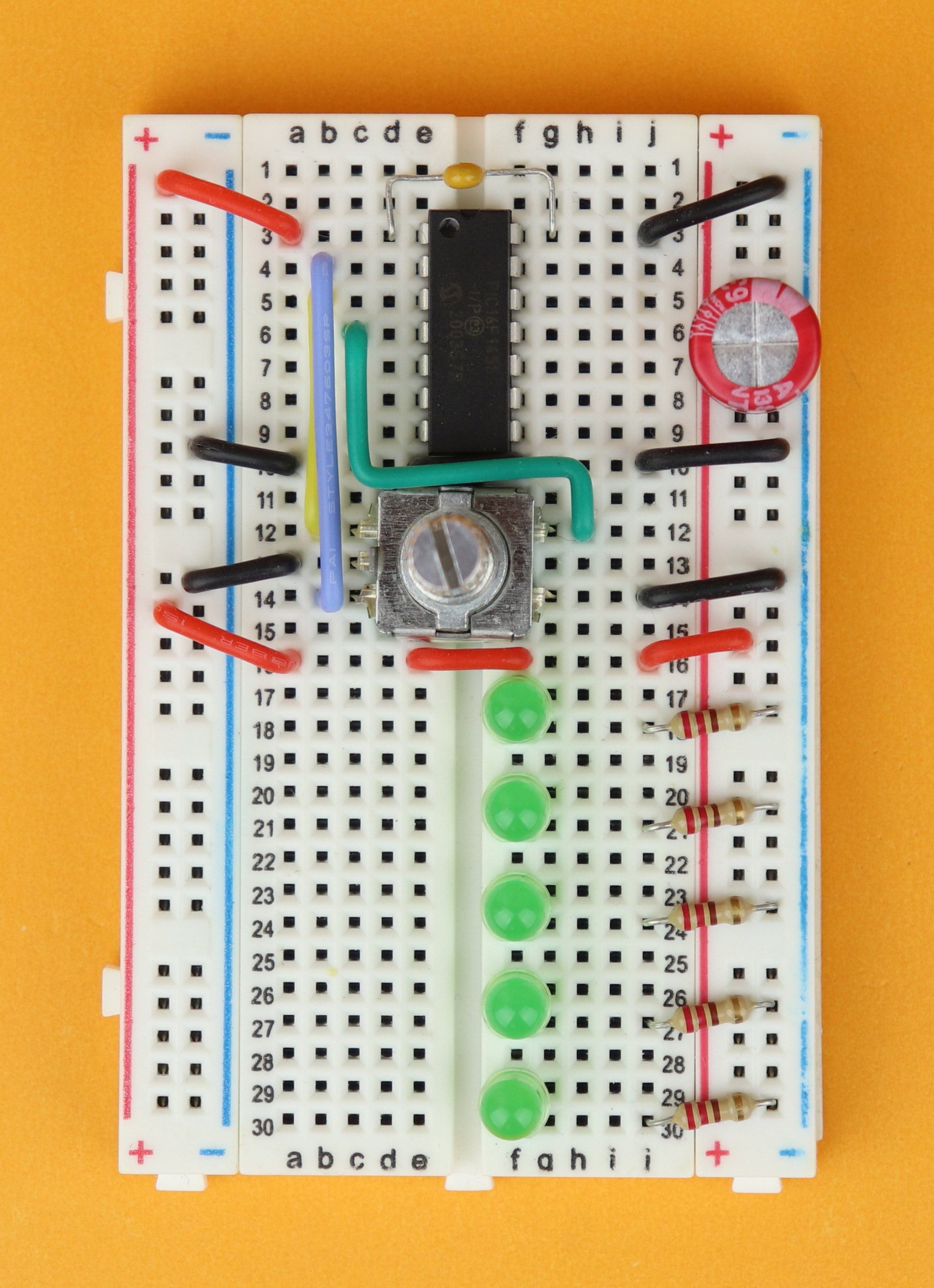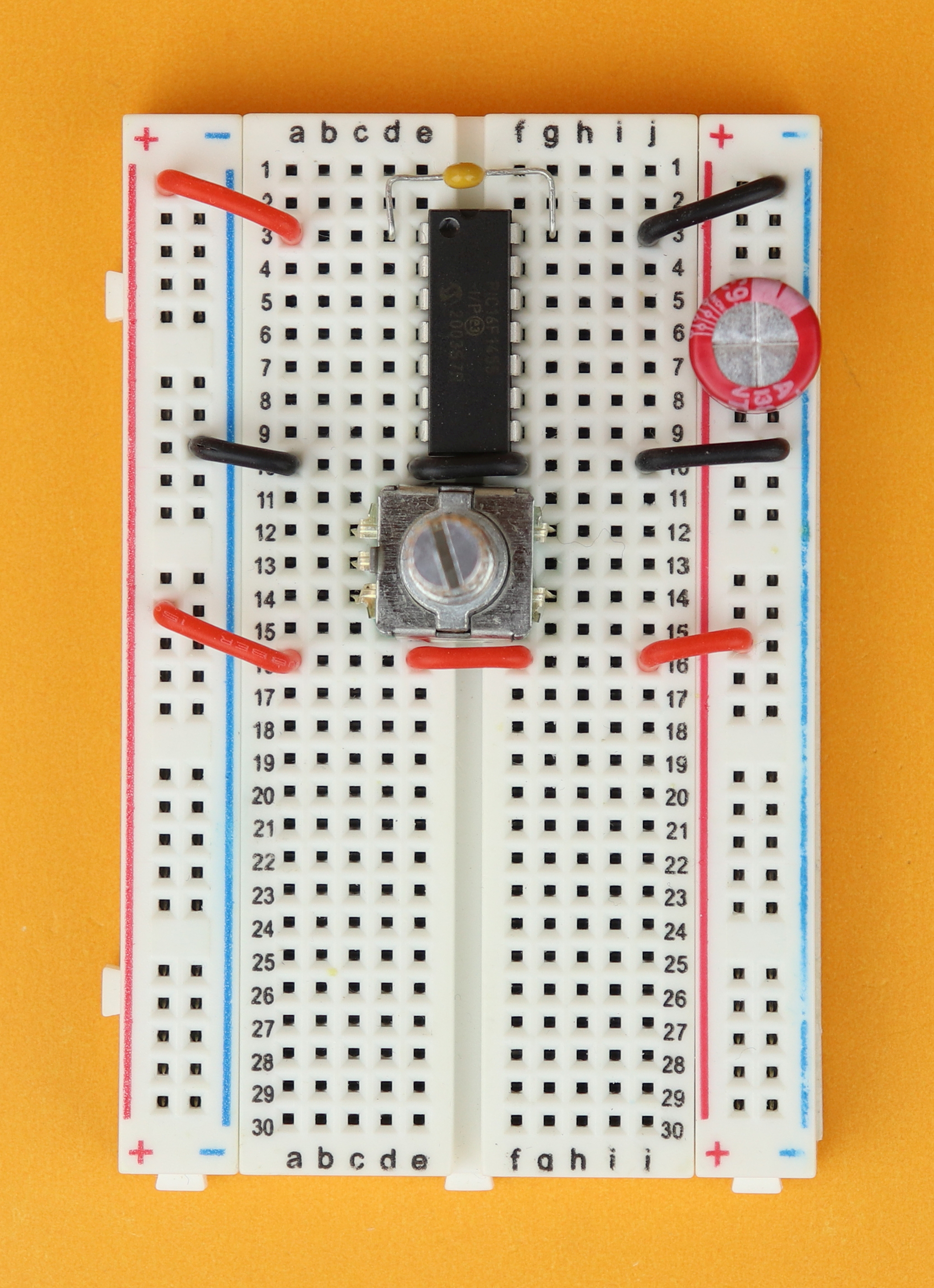 Insert the bypass capacitor C2 between pins 1 and 14 of the PIC16F1455, and the chunky bulk capacitor C1 in the power rail, making sure that the negative terminal is connected to the blue ground rail.