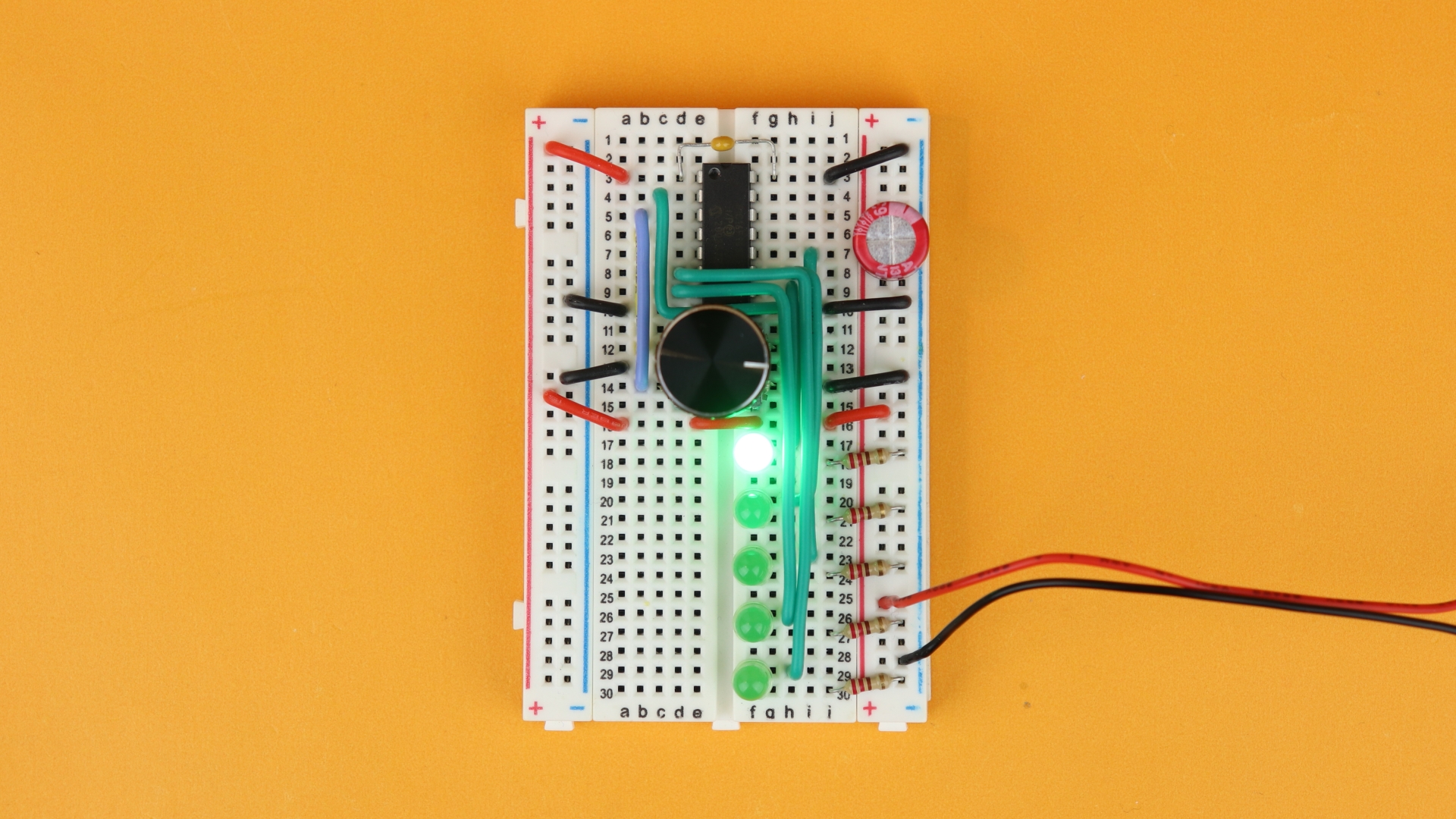 After this brief intermezzo, it's time to insert the LEDs, with the anodes facing up, in rows 17, 20, 23, 26, and 29; their cathodes are then connected to the ground rail with their 220Ω current-limiting resistors in rows 18, 21, 24, 27, and 30.