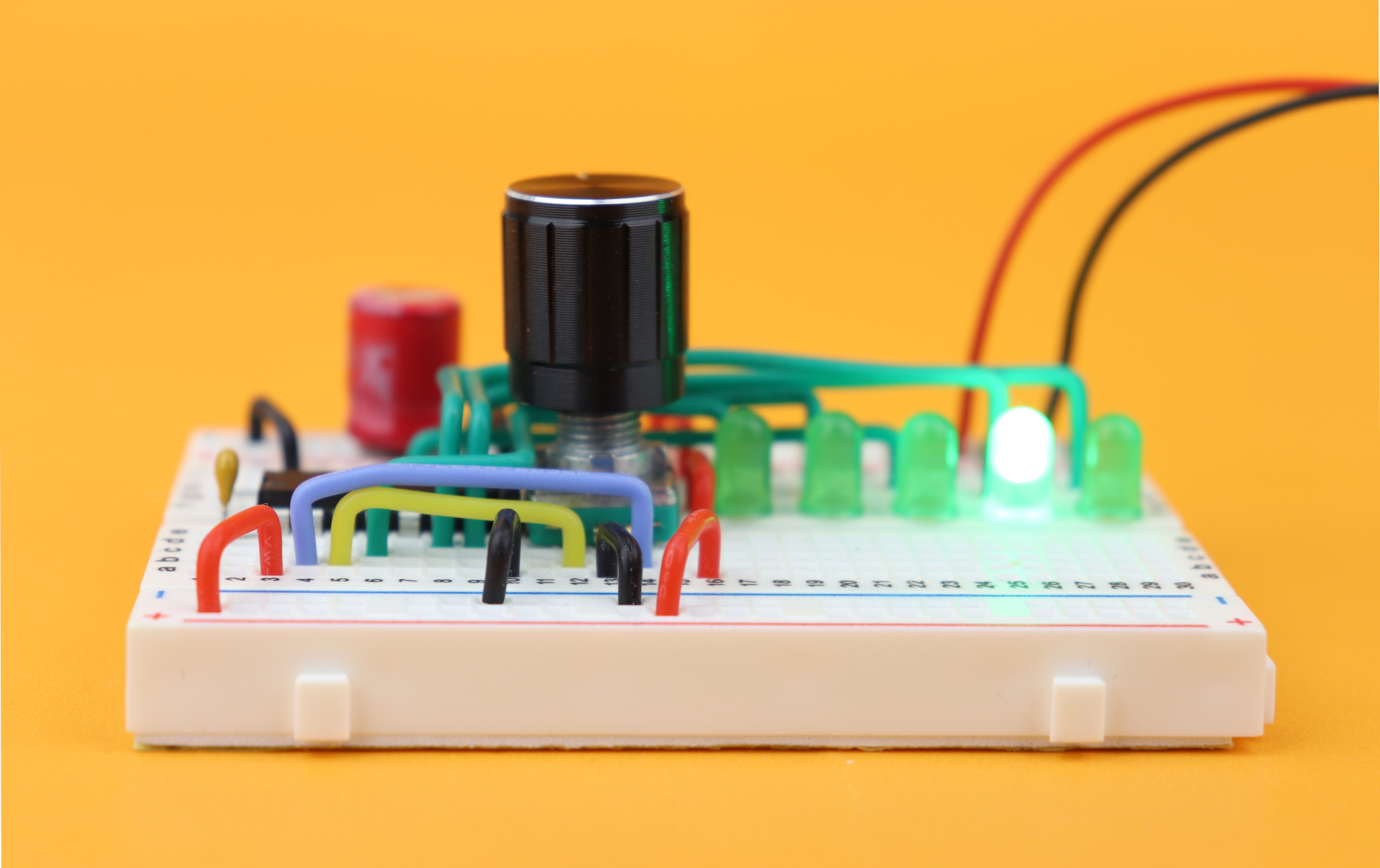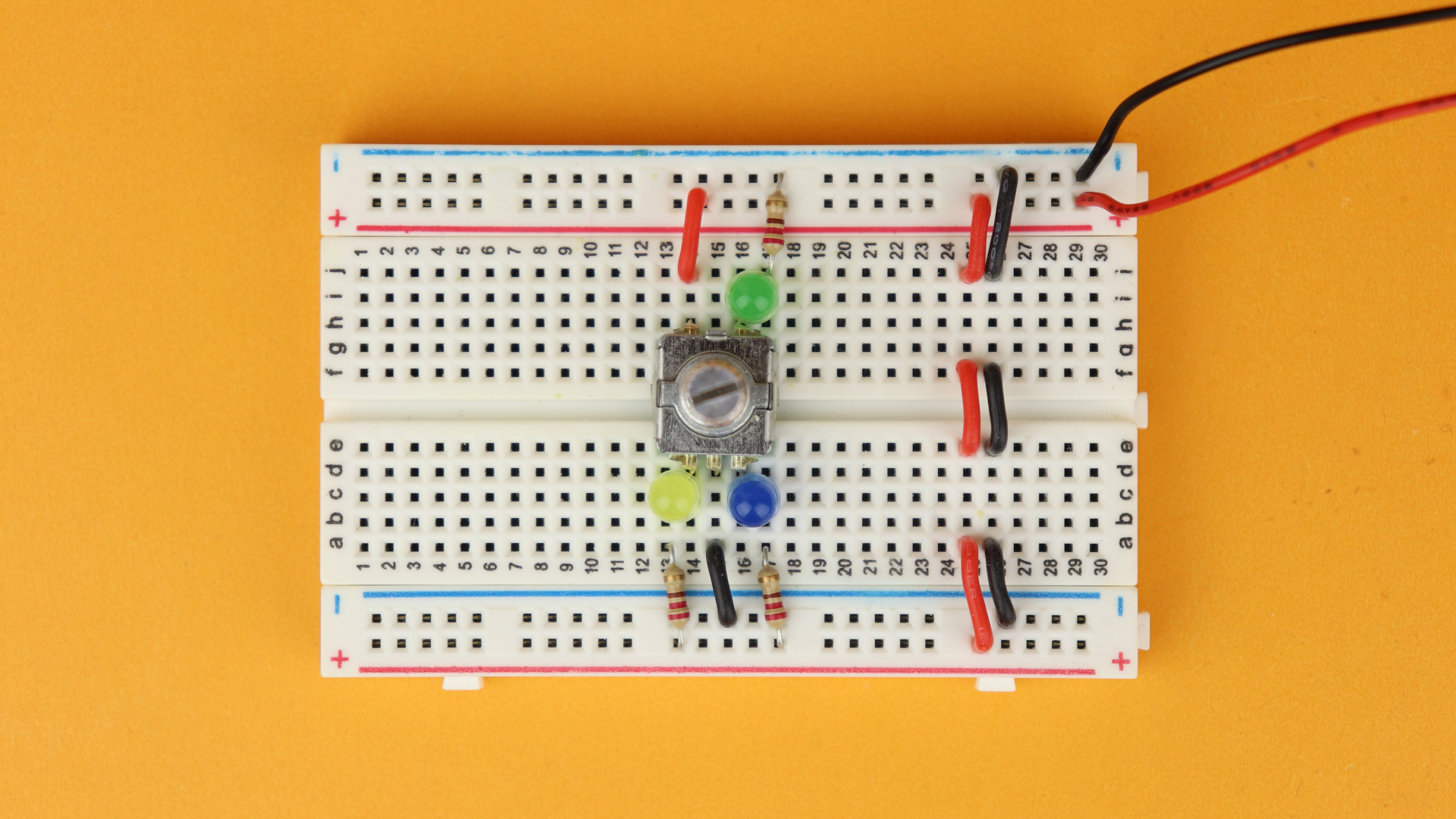 Now you can place the aluminum knob on the rotary encoder, and connect the 4.5V battery pack to the power rail (red wire to the red VDD rail, and the black ground wire to the blue GND rail).