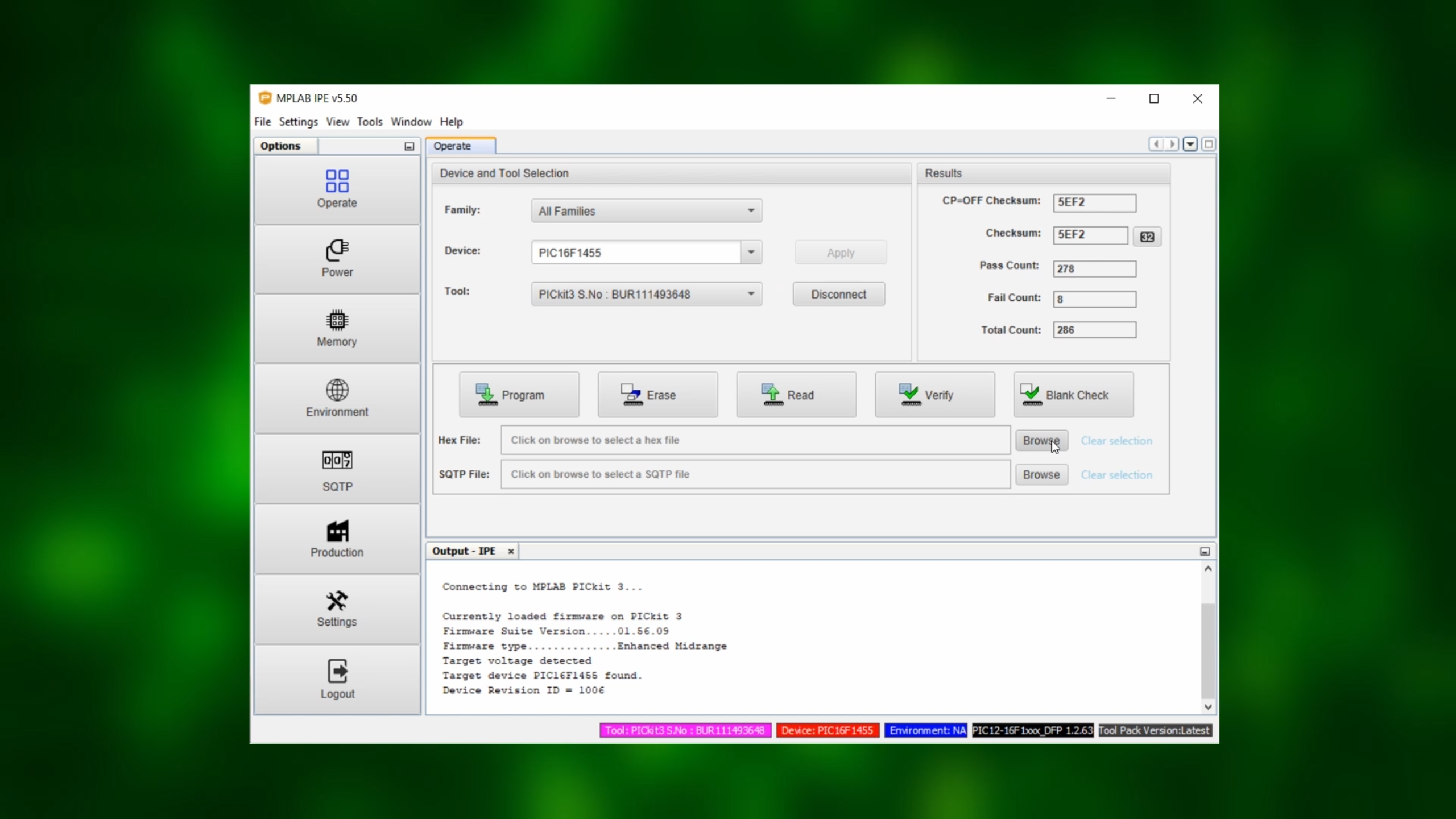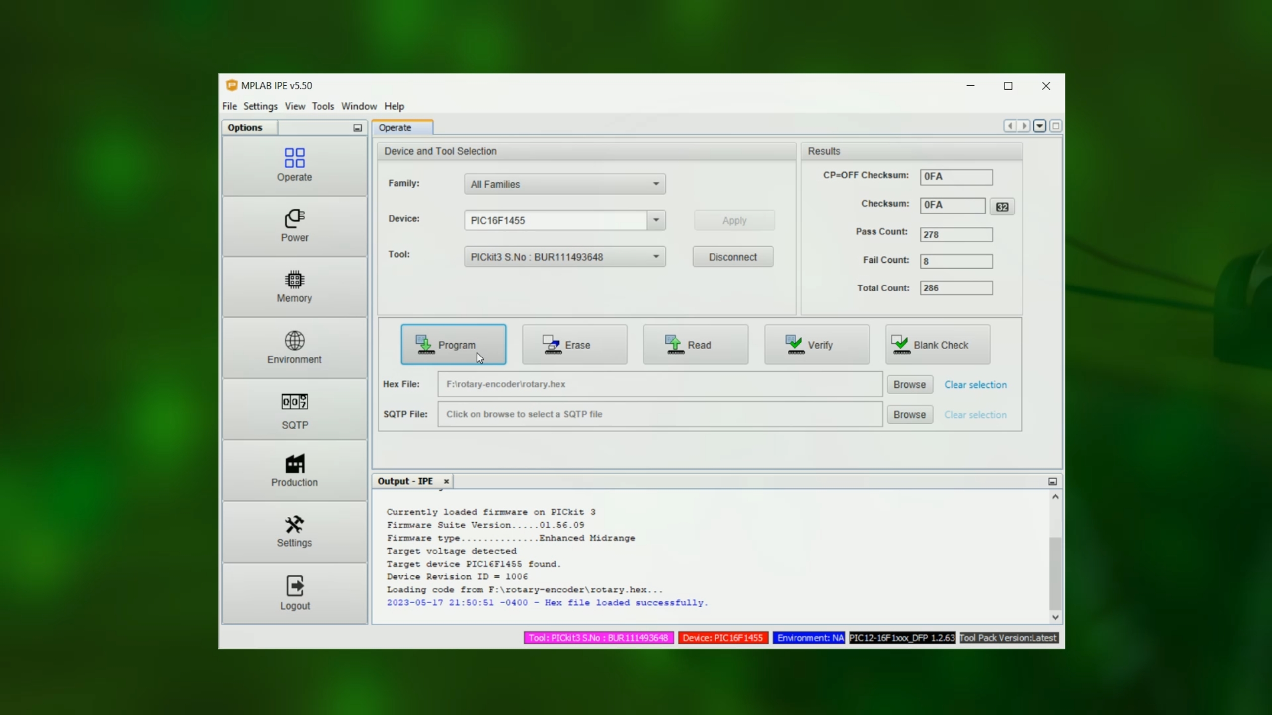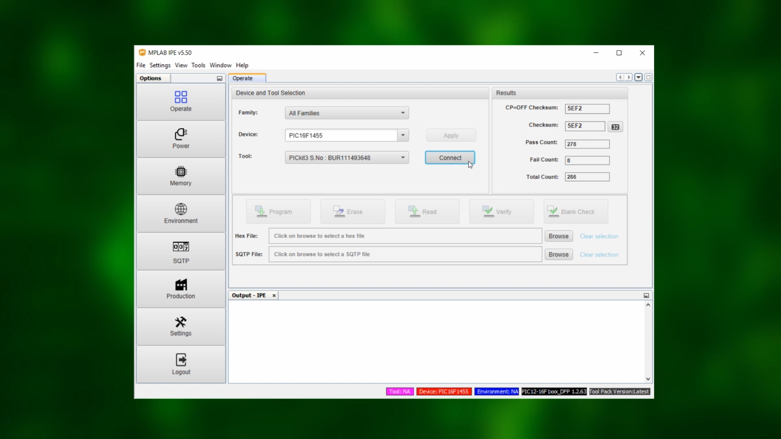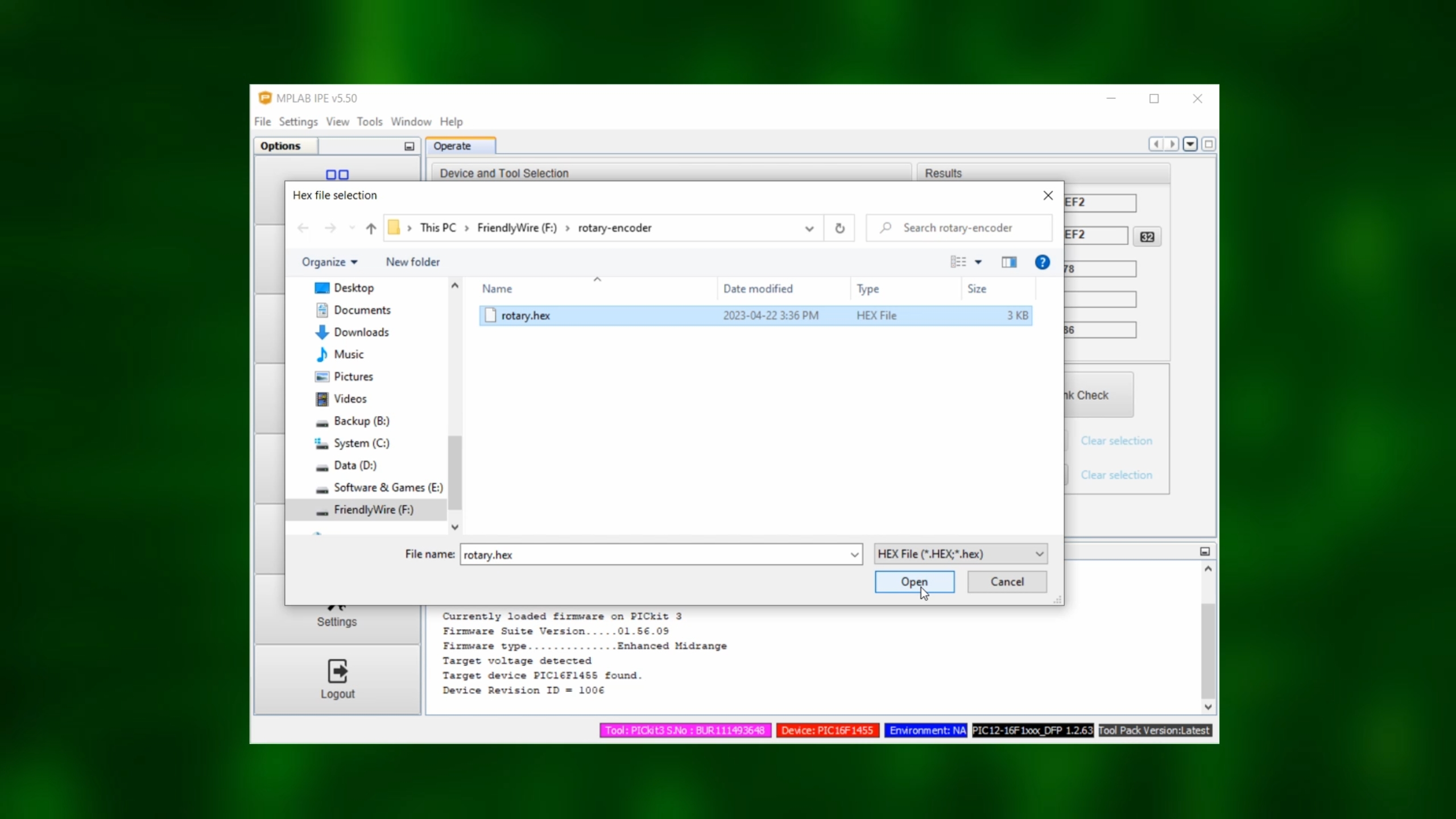 Now, start the MPLAB IPE, select the PIC16F1455 under "Device" and click on "Apply," and select the PICkit3 as your tool.