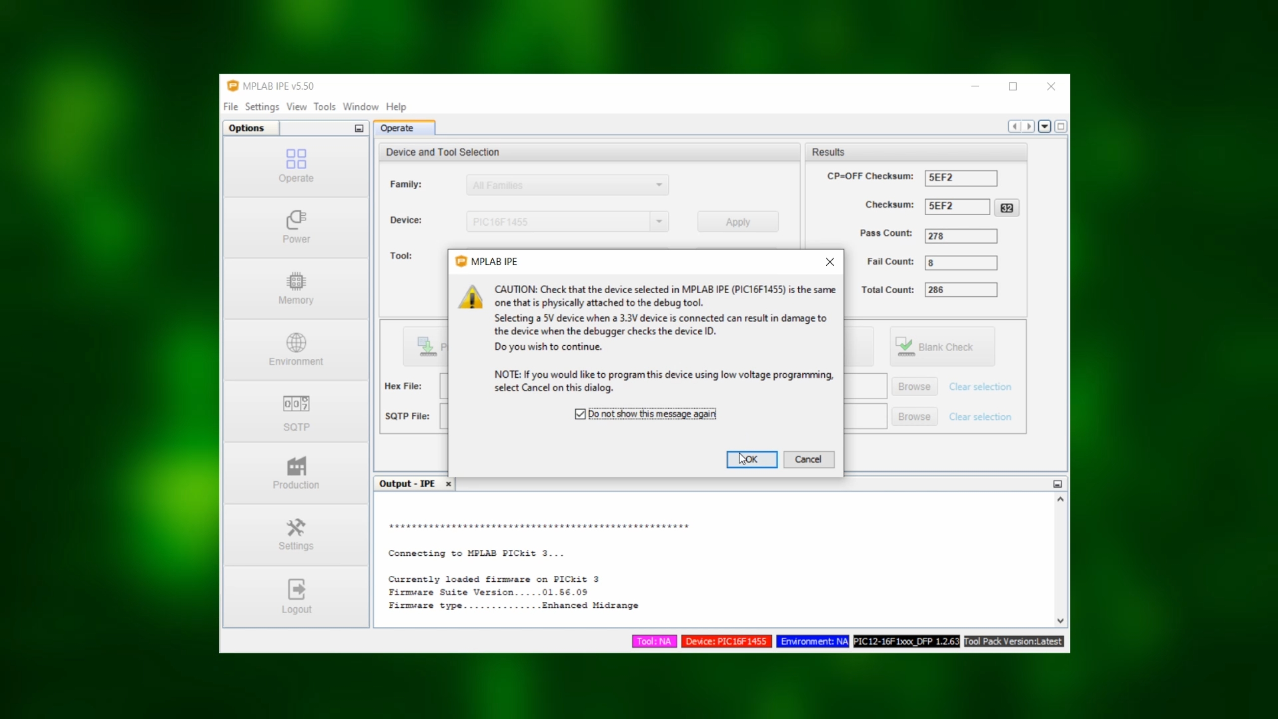 After this message appears (making sure that we are really using the PIC16F1455) you can confirm and click the checkbox, and cick on “OK.” After a few seconds, the PIC16F1455 should be detected: