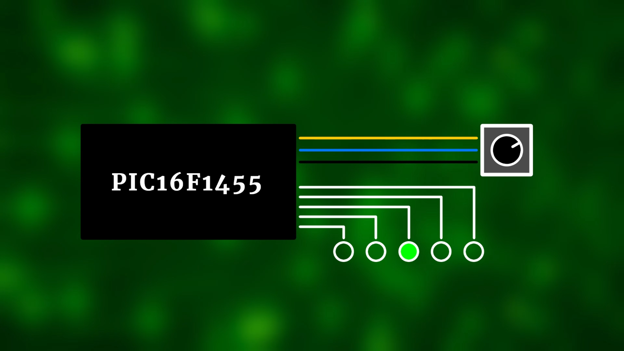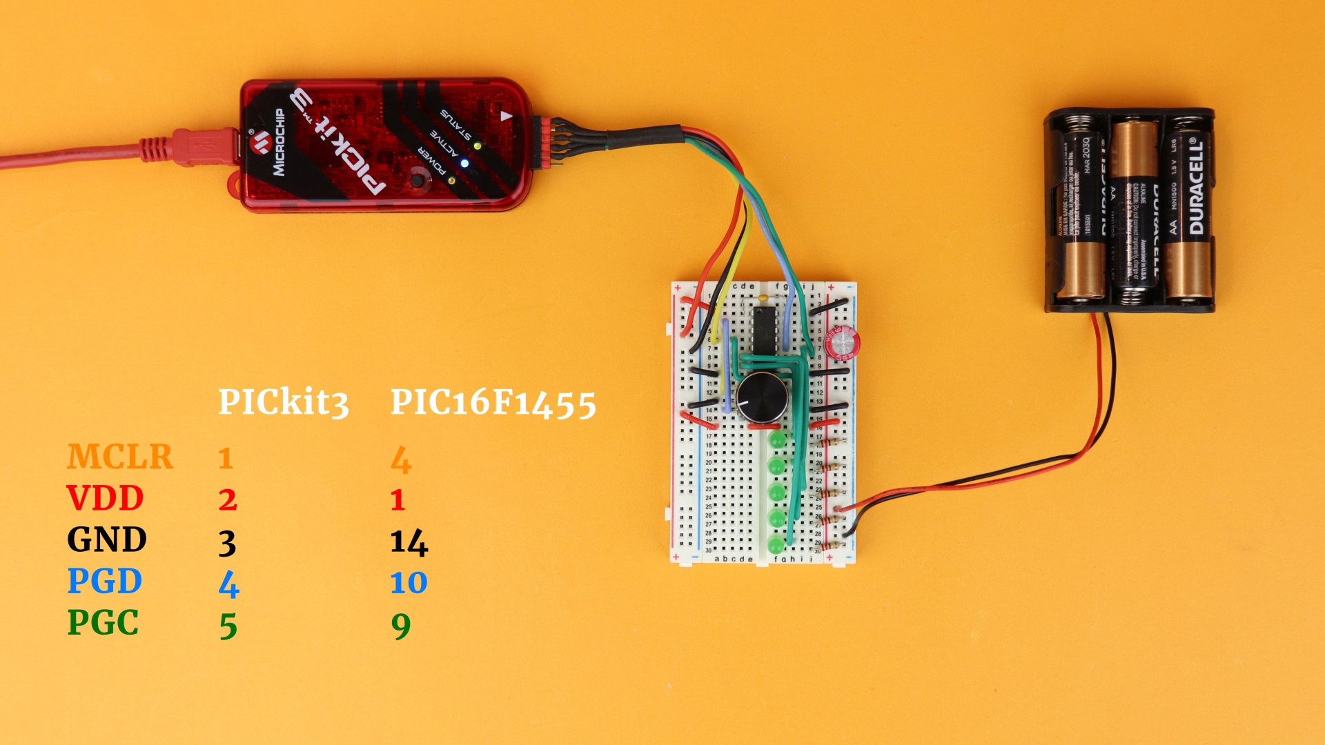 - The symbol at the top is the PICkit3 that we need to transfer the .hex-file onto the microcontroller, and the PICkit3 connected to the PIC16F1455 via the five wires VDD, GND, Master Clear, Program Data, and Program Clock, just as usual.