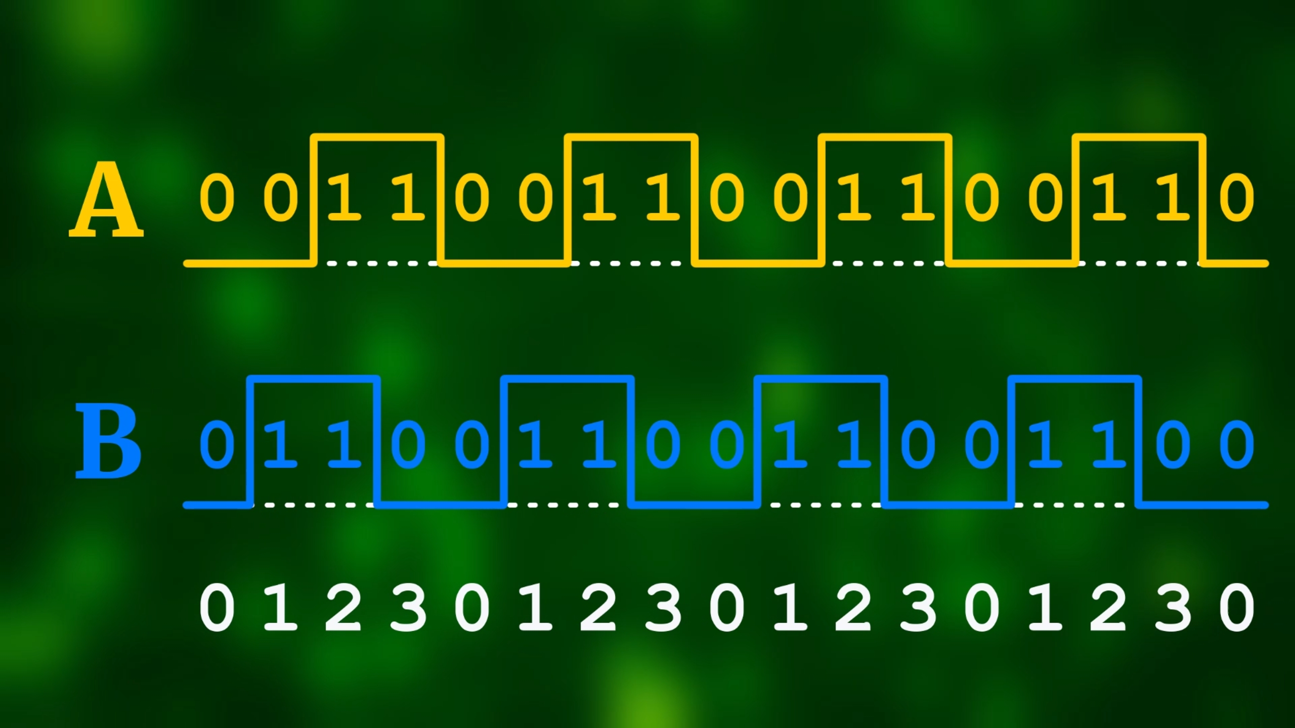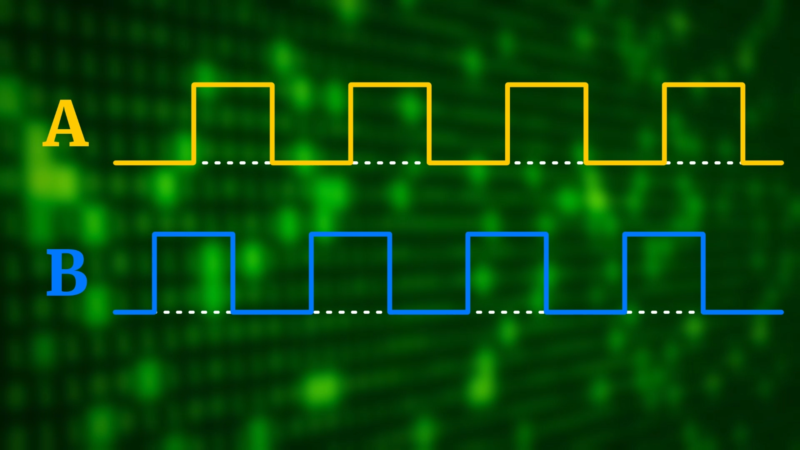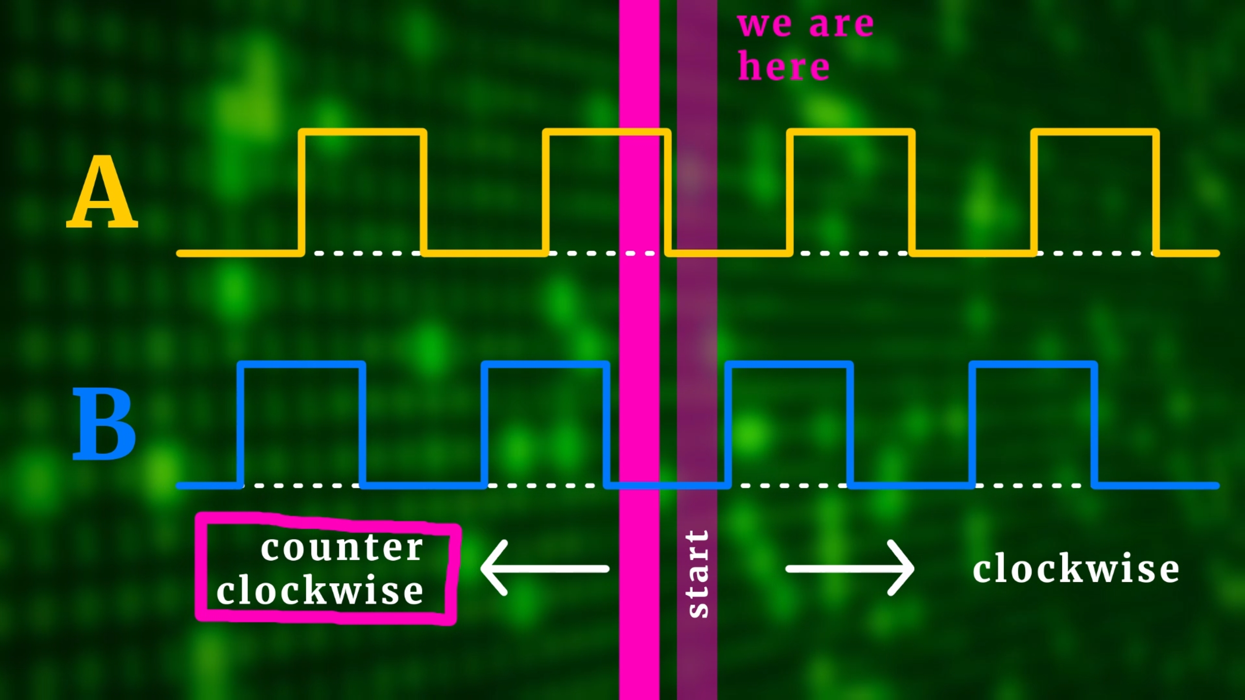 So, in this example, A and B were first both low, and afterwards B is still low, but A is now high. This means that we turned counter-clockwise. If instead A remained low, and B turned high, then we would have turned clockwise.