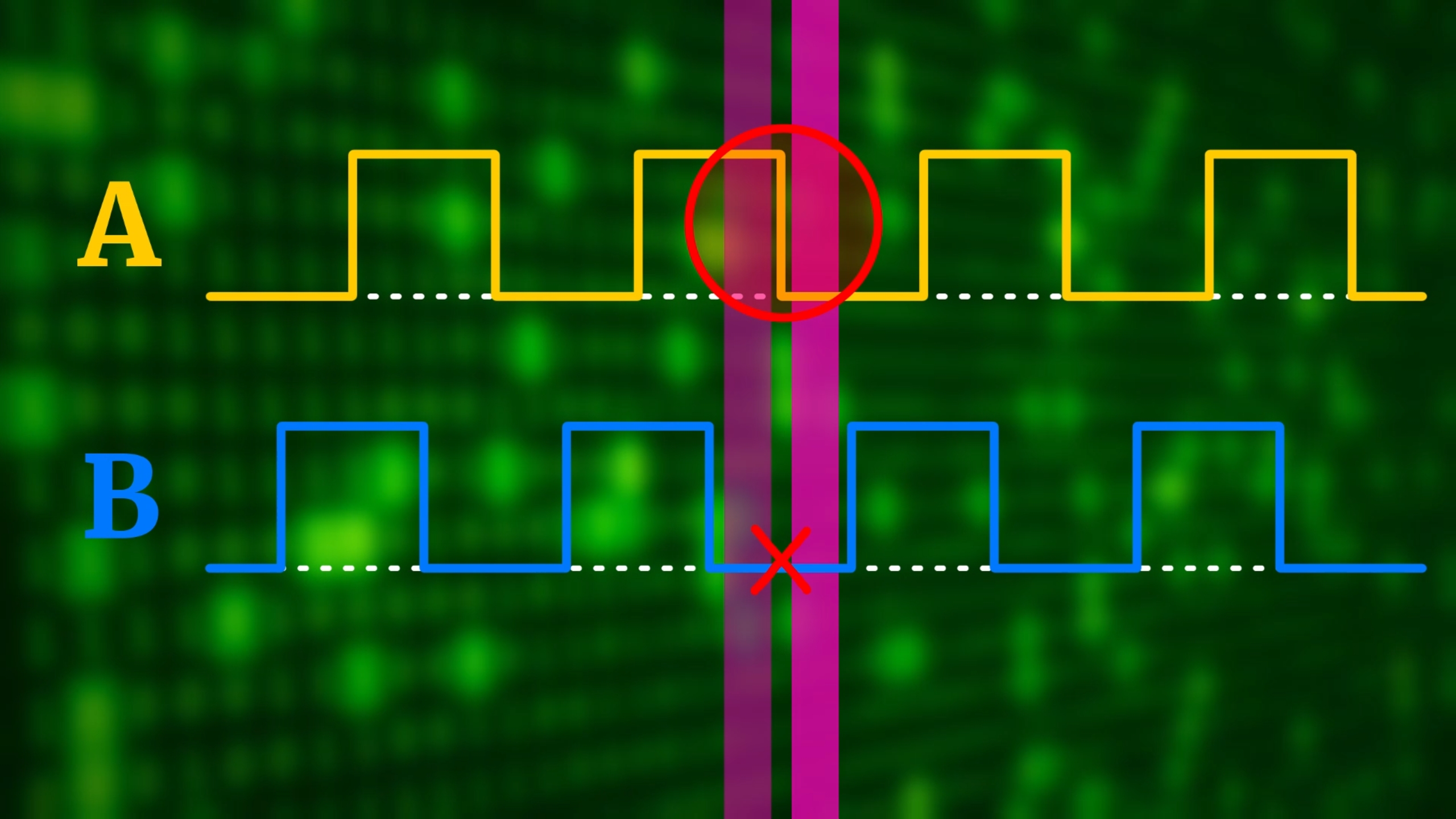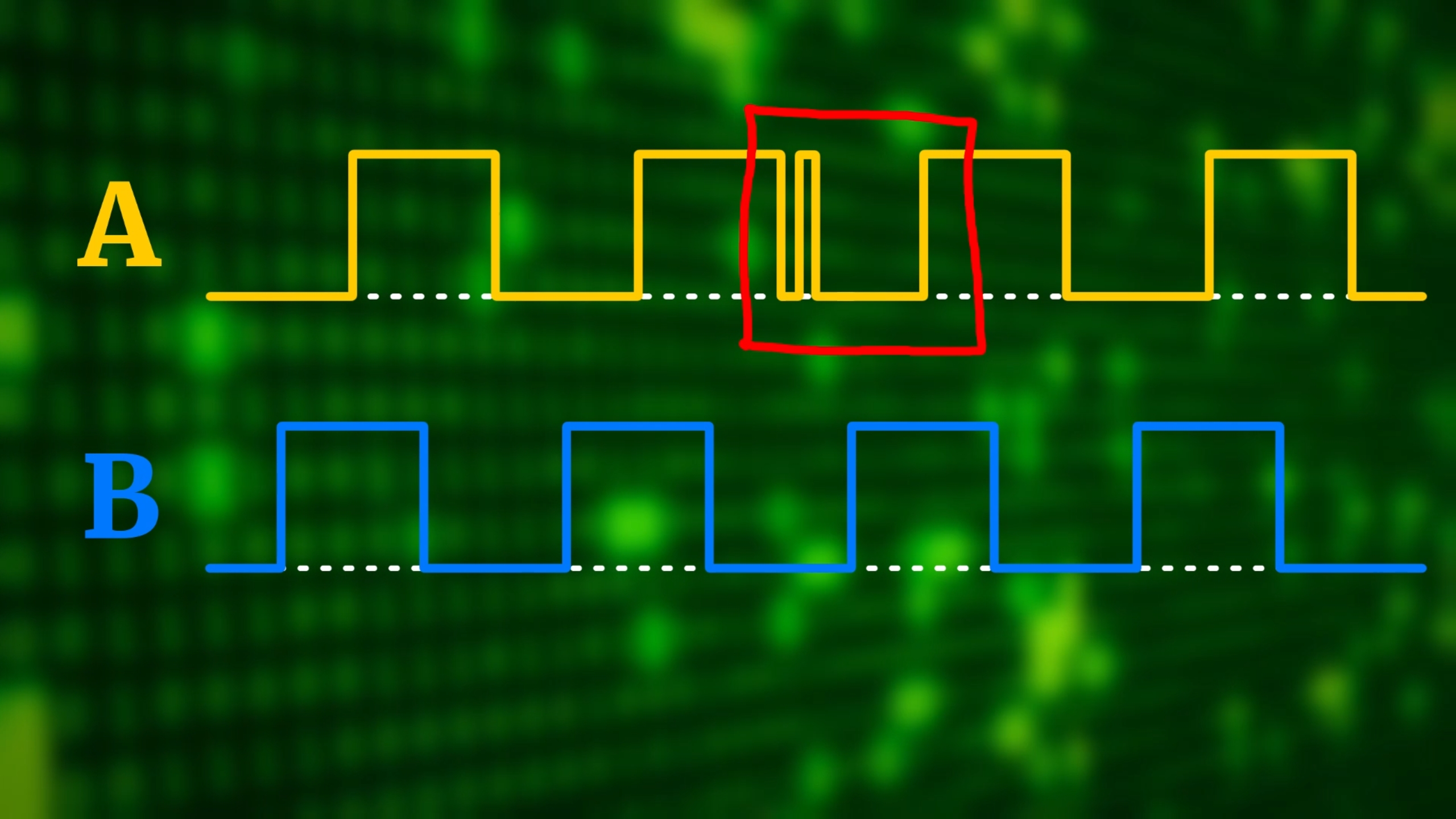 But at this point you probably want to ask: what makes Gray code so special? Why do we use this code, and not something else? Basically, if you look at the timing diagram, you see that from one step to the next one, only one pin changes (circled in red), and the other one stays the same (red cross):