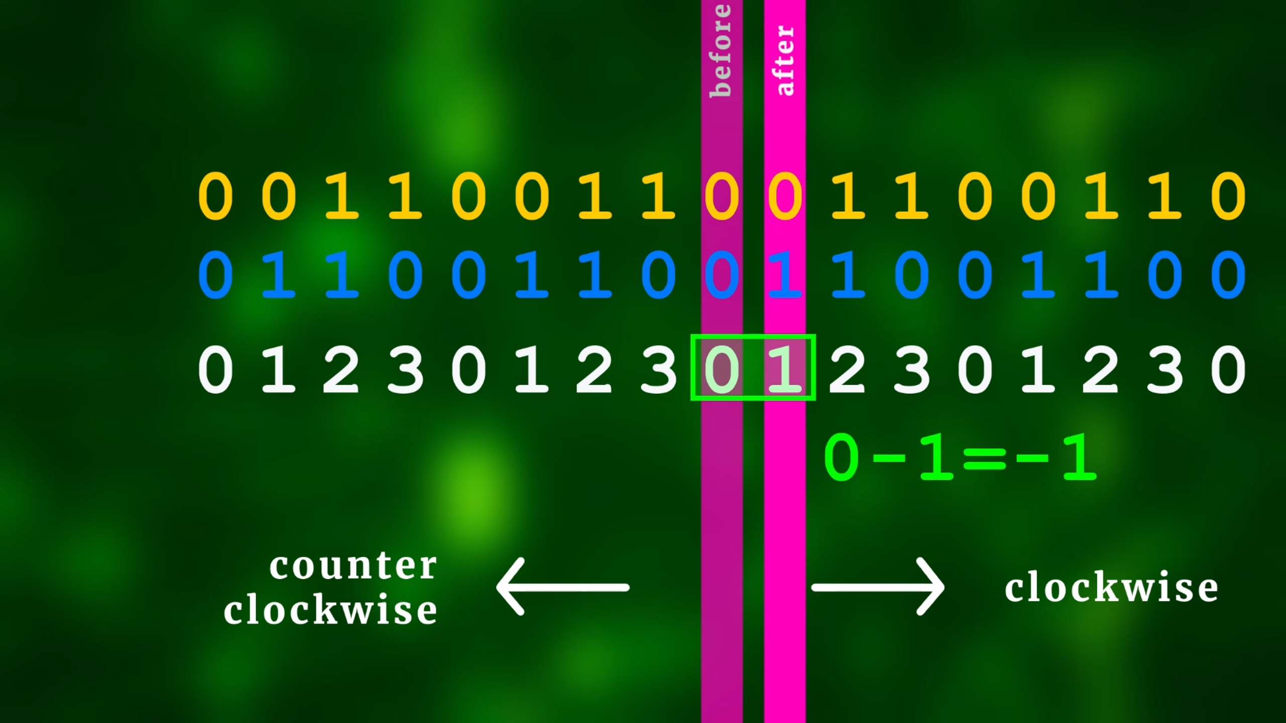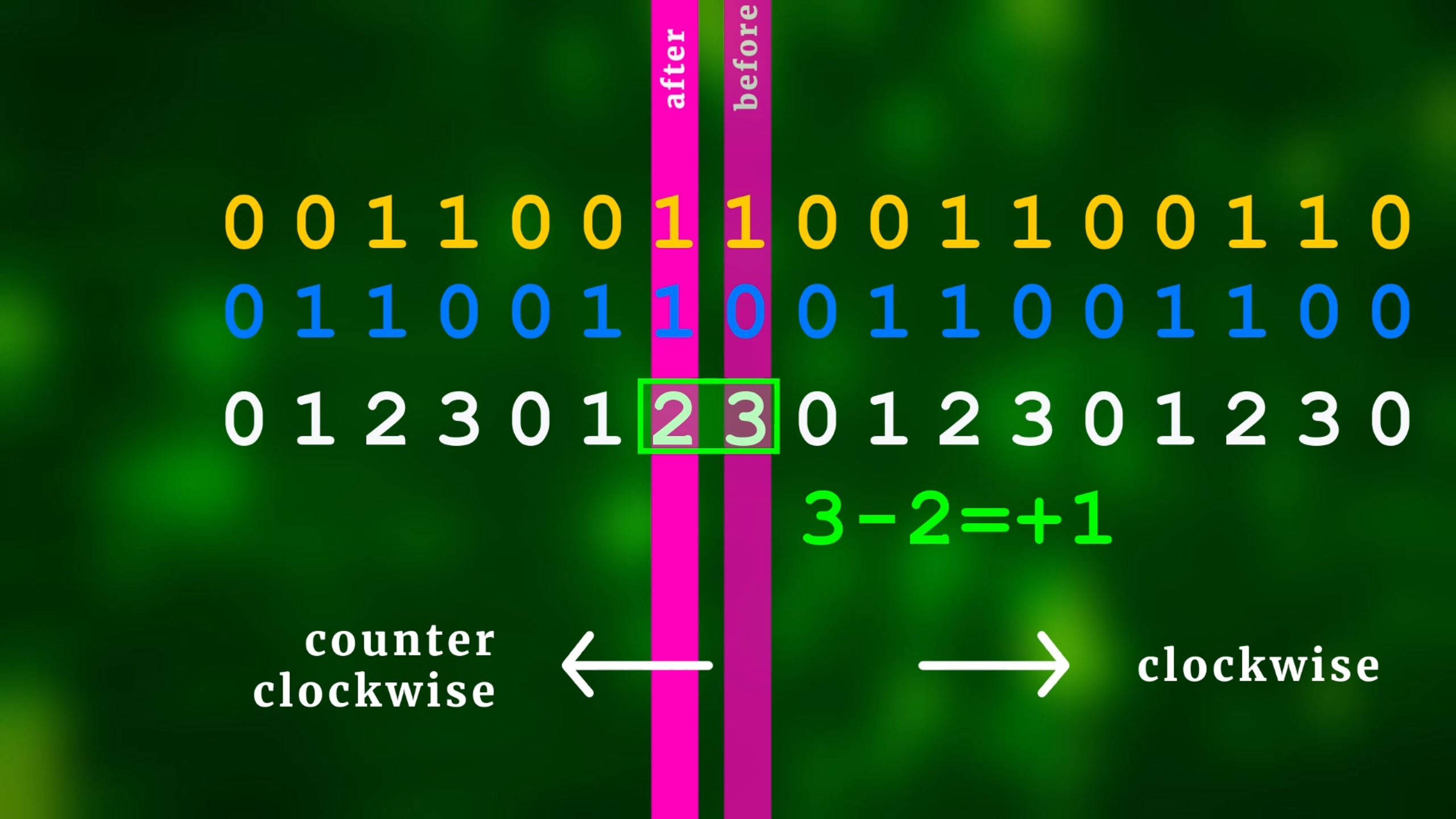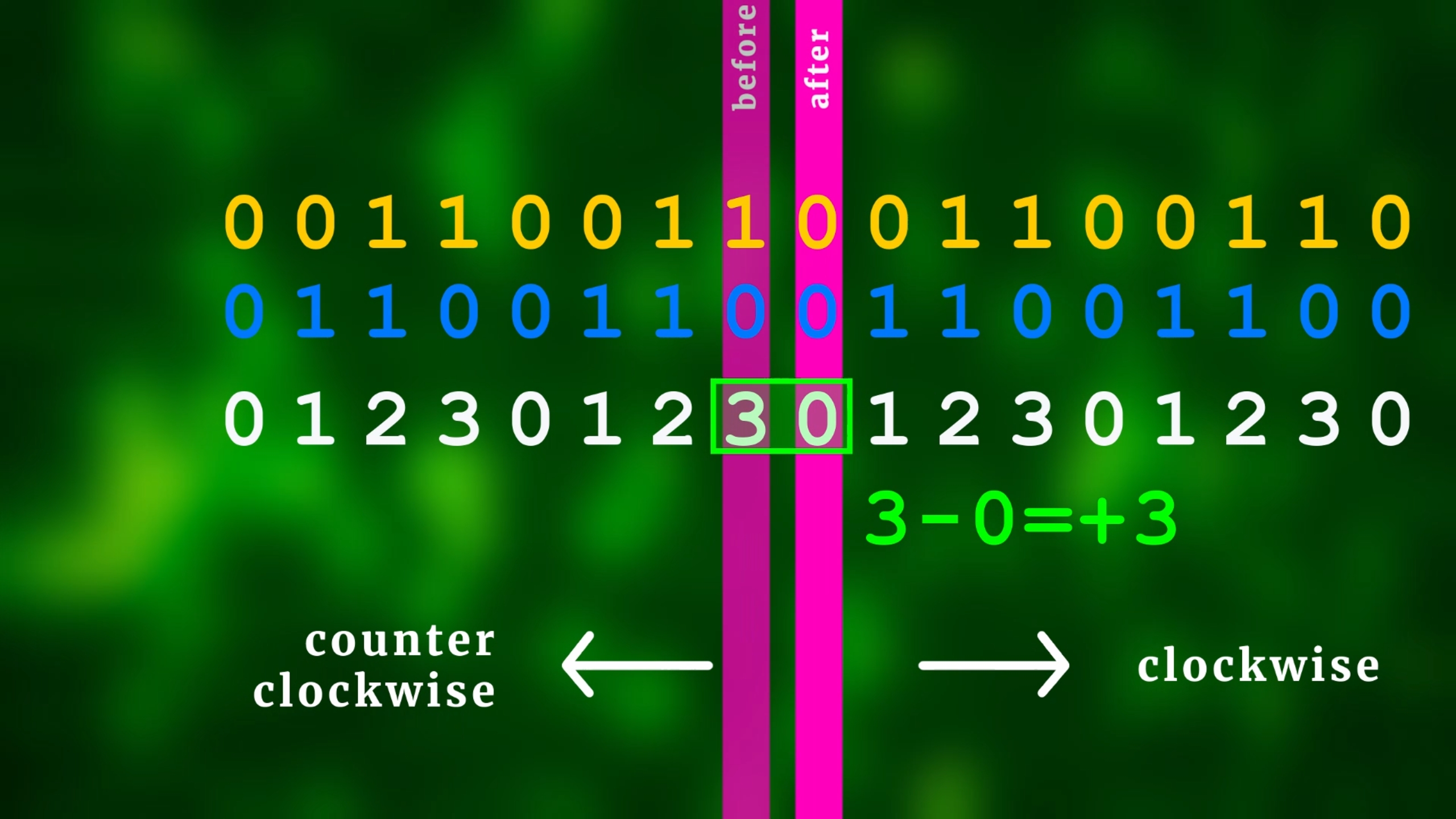 So we basically have reduced the problem to one simple thing: how can we figure out if the rotary encoder has been turned clockwise or counter-clockwise? The easiest way to find out is to first convert Gray code into normal binary numbers (clockwise goes to the right, counter-clockwise goes to the left):