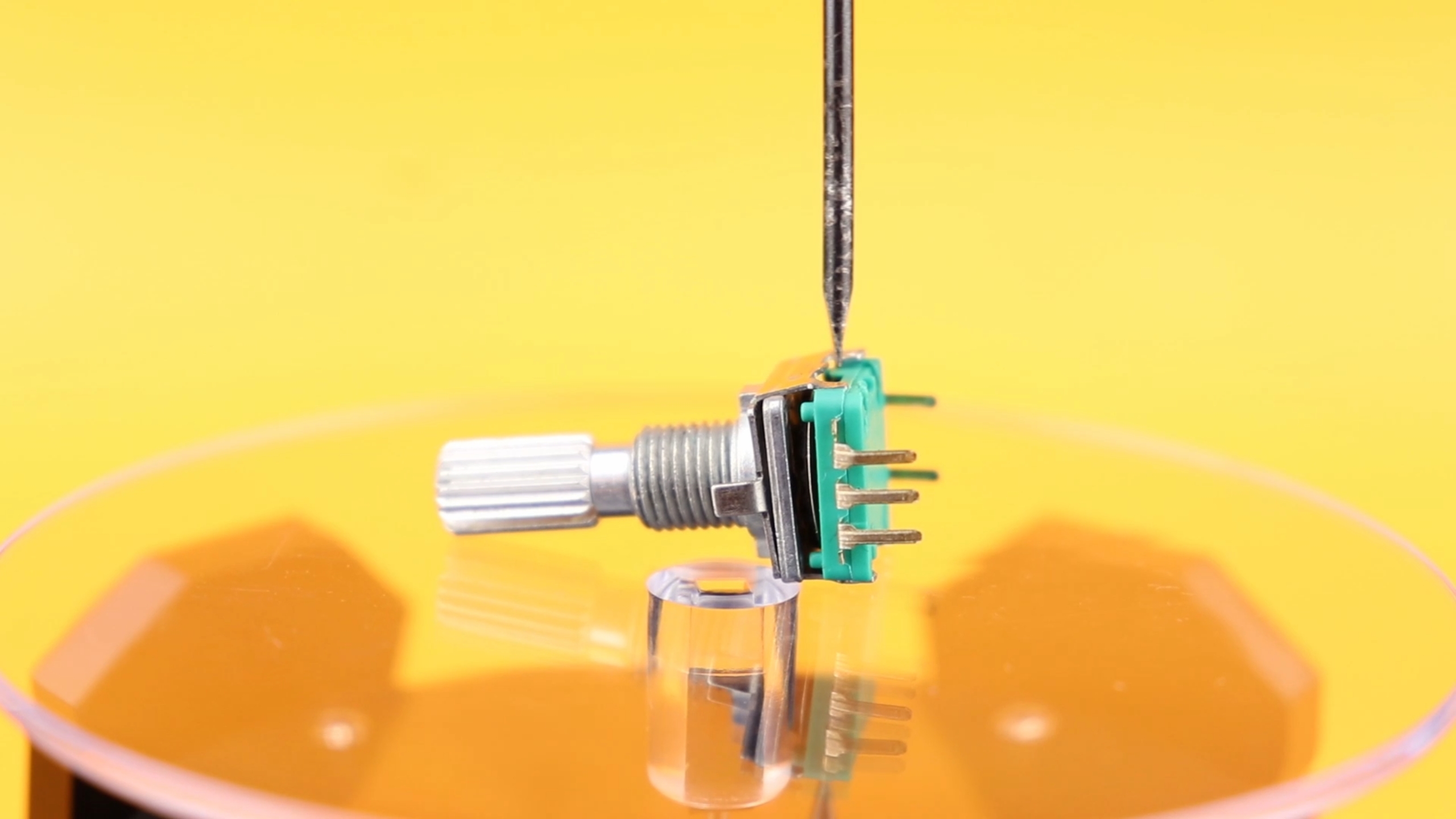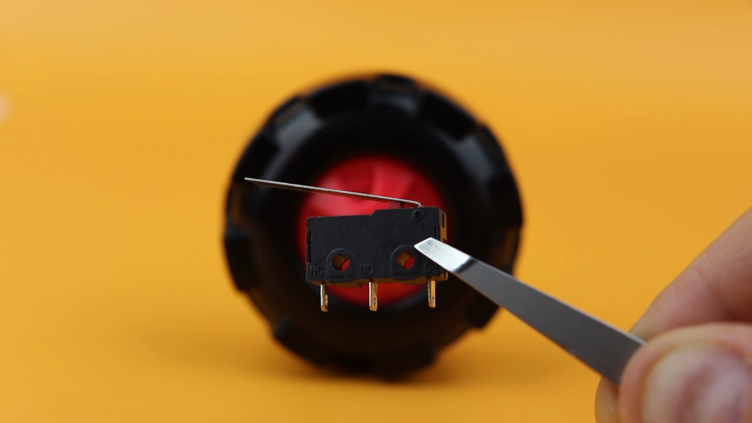 - Pushing down the knob pushes down the metal dome (the central green circular part), which then connects the two terminals SW and SW' at the top of the base, so: the pushbutton part is quite simple.
