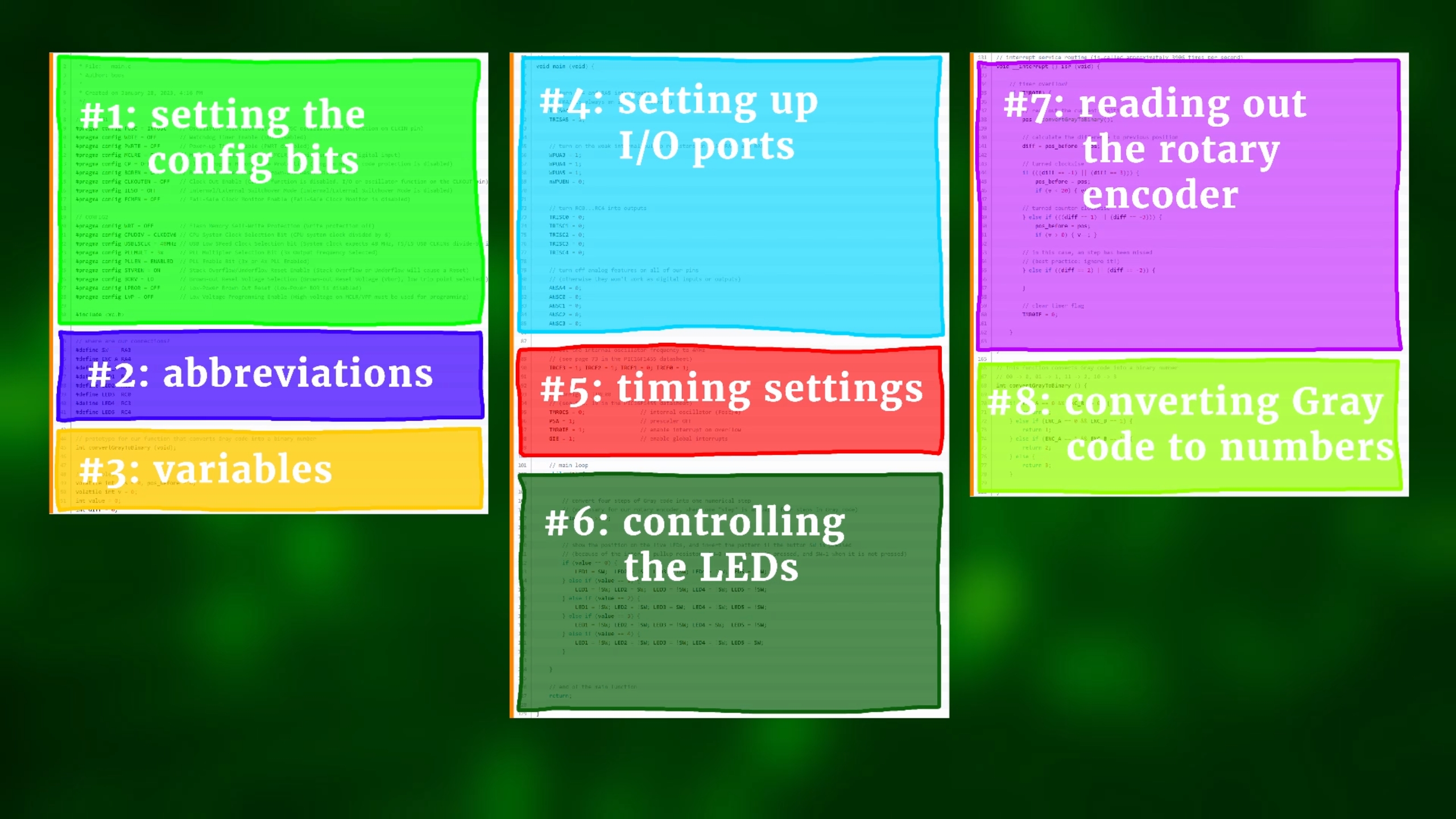 So I hope you see that all of this just makes sure the LEDs get inverted. Phew. And that was the main loop! So now let's talk about the main part: how to read out the rotary enocer. And we do that inside the interrupt service routine: