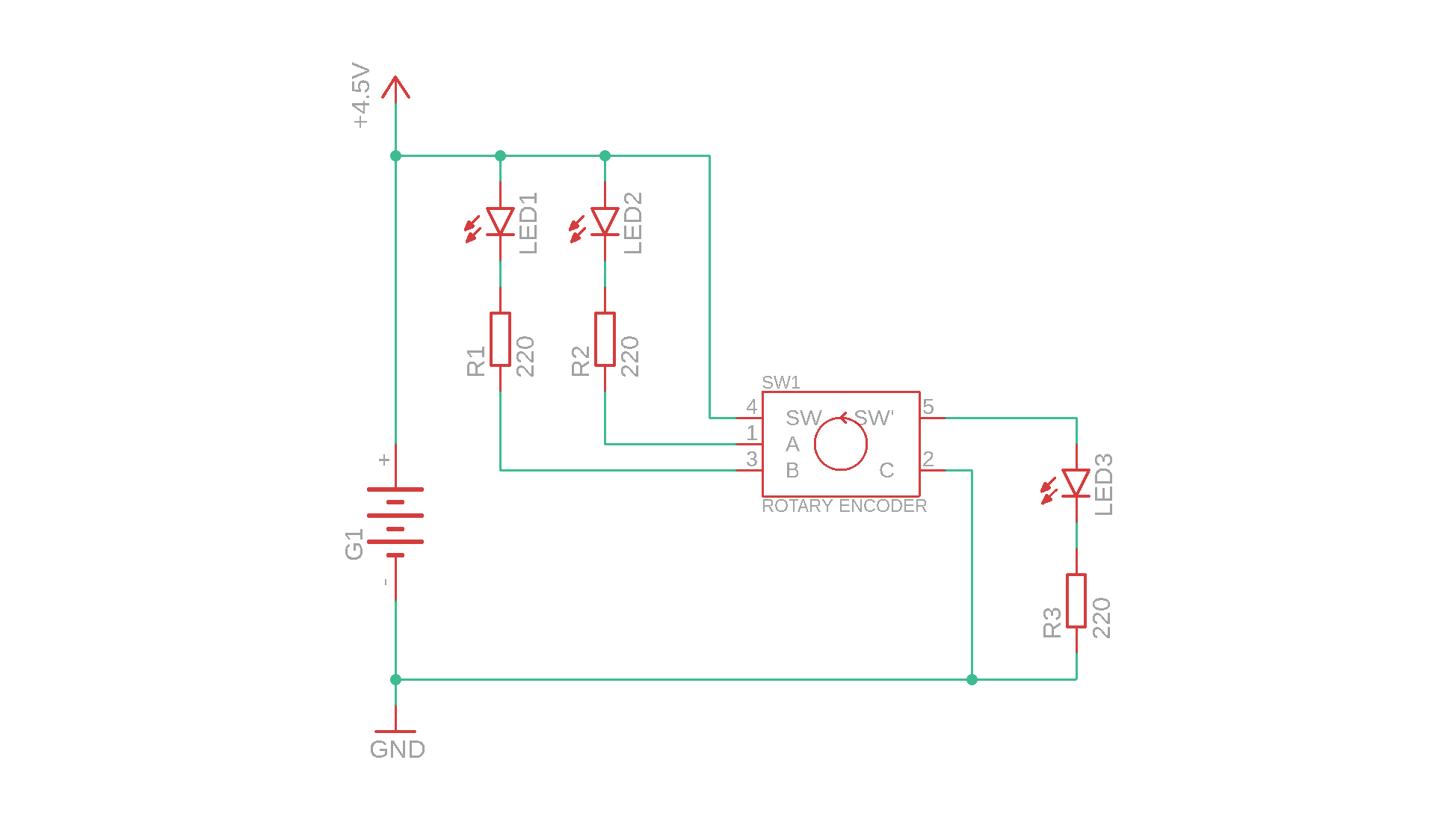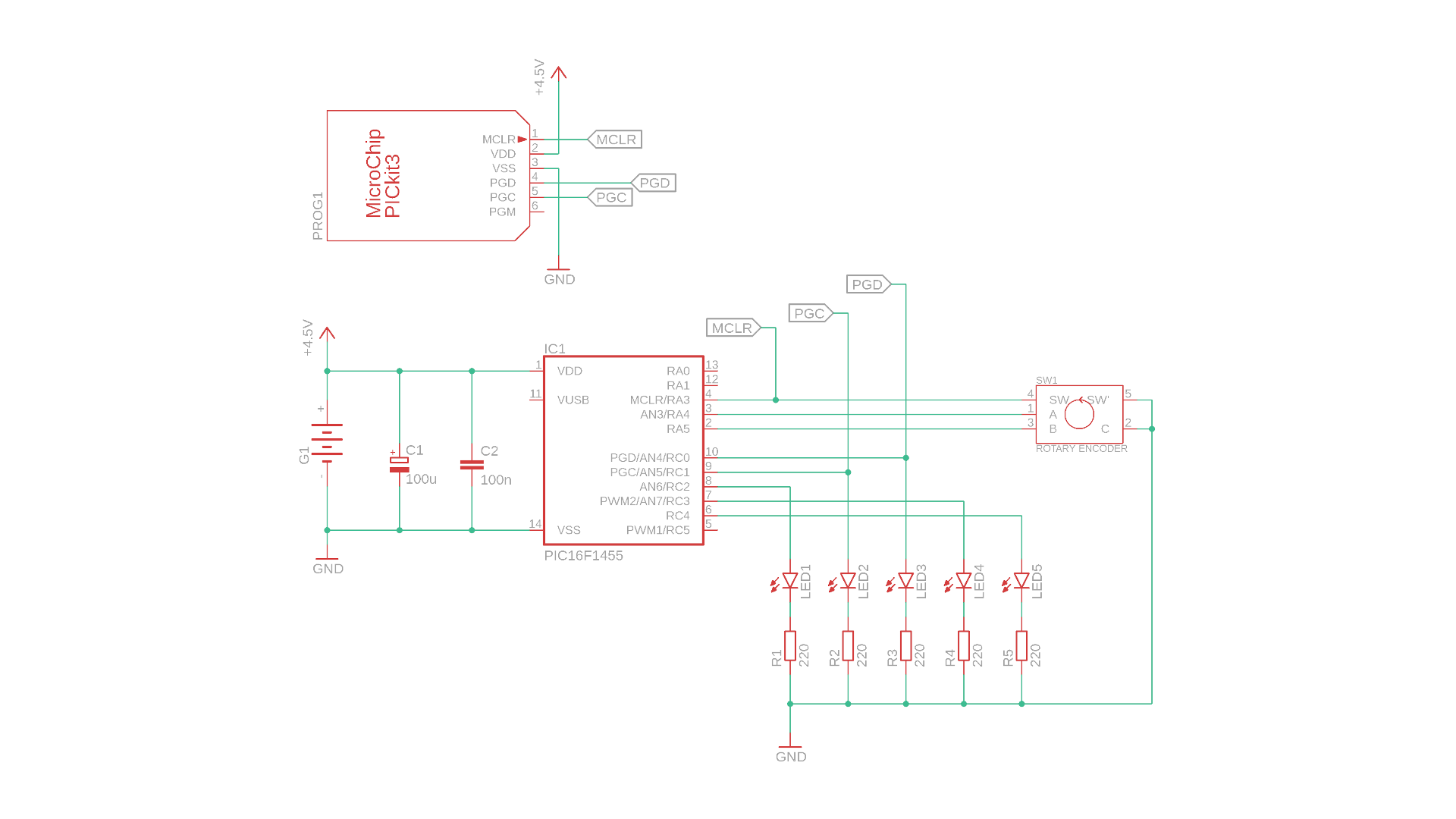 - Then we also have five LEDs that we will use to visualize the motion of the rotary encoder, and they are connected to outputs of the PIC16F1455 with 220Ω current-limiting resistors.