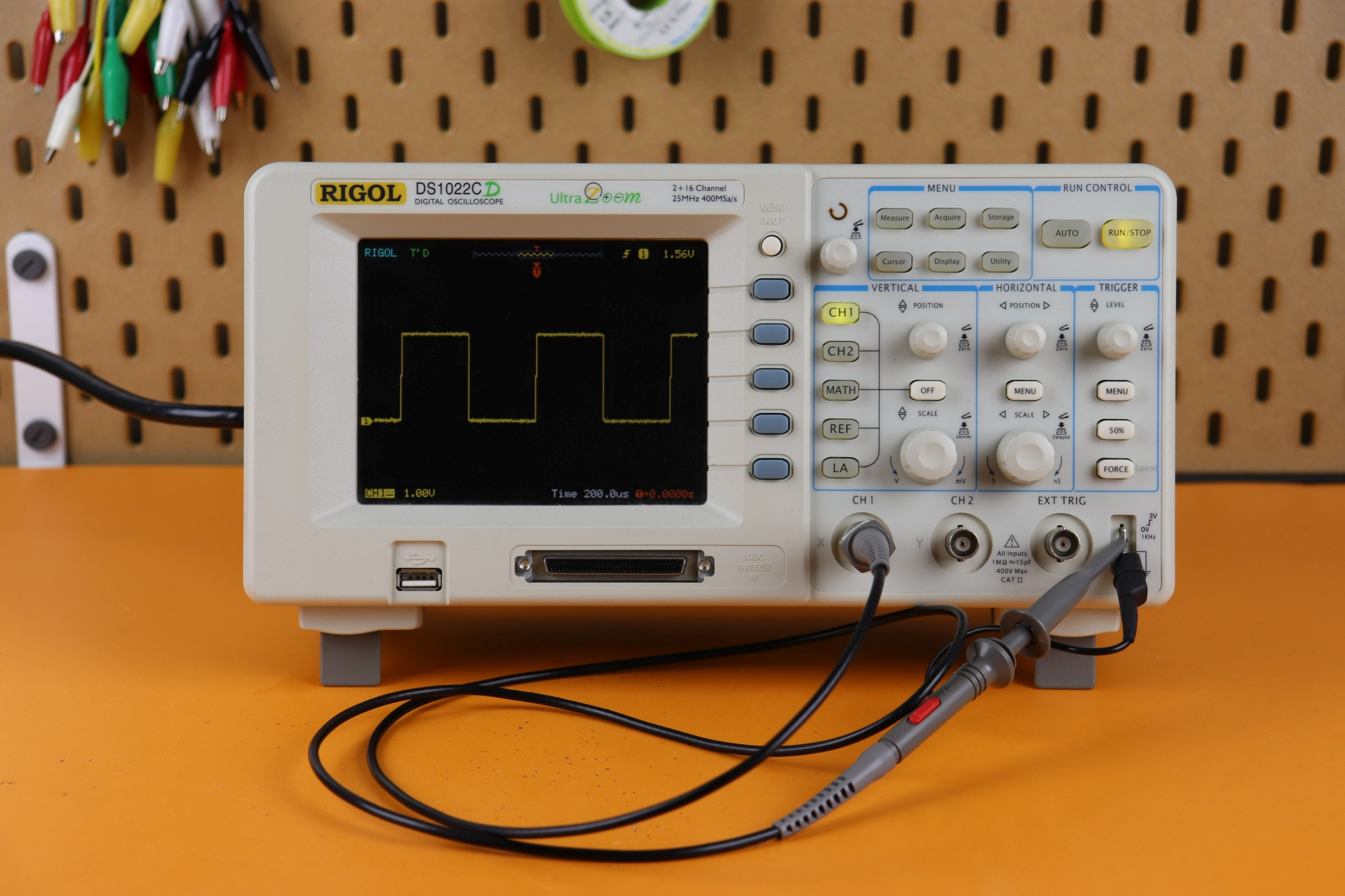 This was my first and only oscilloscope, and nowadays it is very outdated. It was one of the first flatscreen TFT-type scopes, and I bought the used beginner version. 25MHz bandwidth is very low, I would recommend at least 100MHz for anybody interested in microcontrollers. On the plus side, this unit has an attachable 16-channel logic analyzer, which works great. The internal functions of this scope are very basic, but that makes this scope nice for beginners. It has a very noisy fan, maybe I will replace it at some point. The memory depth is quite low because this is a rather old model and has long been discontinued.