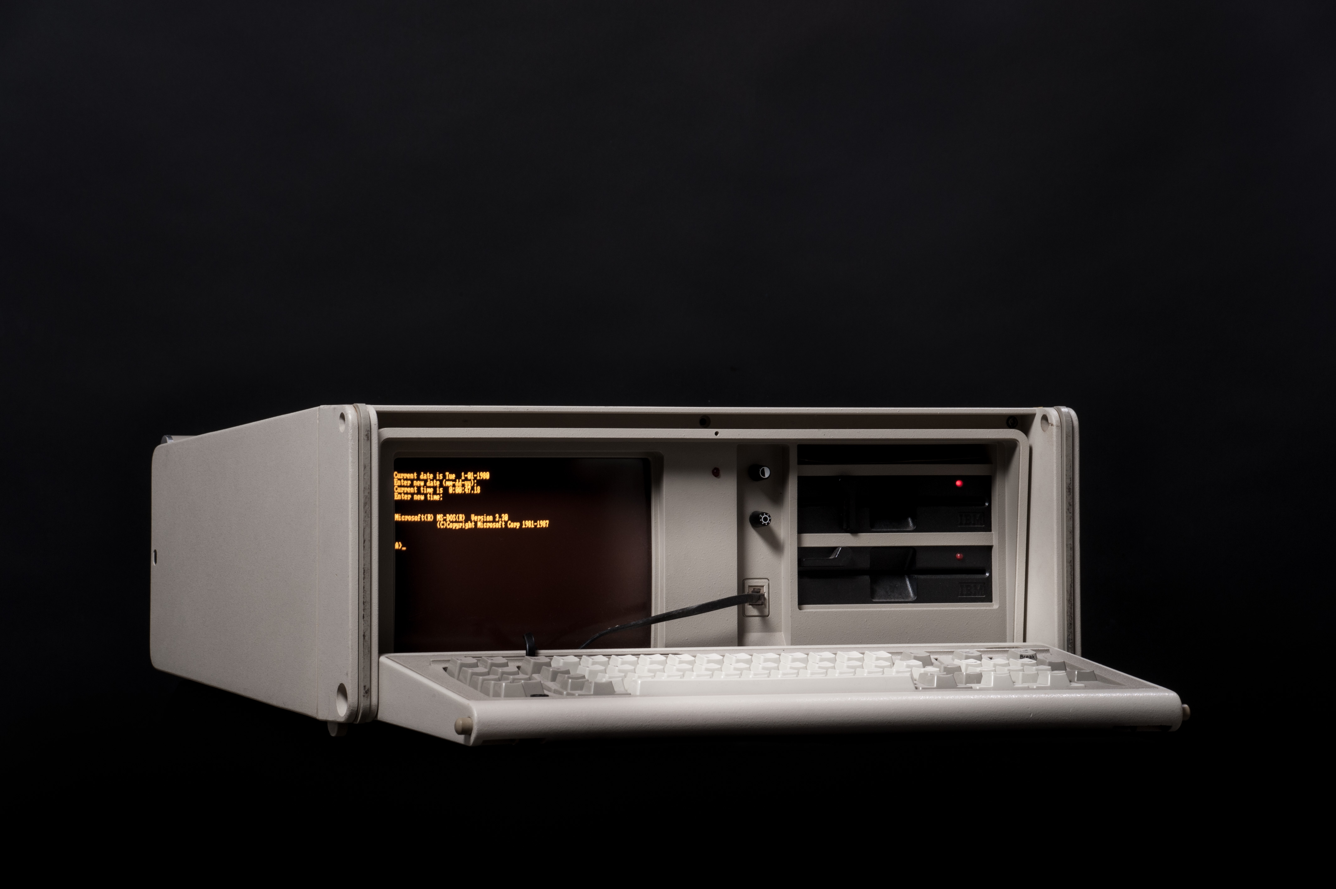 The portable IBM 5155 was introduced in 1984 and comes with two 5 1/4" floppy drives and a beautiful amber CRT.