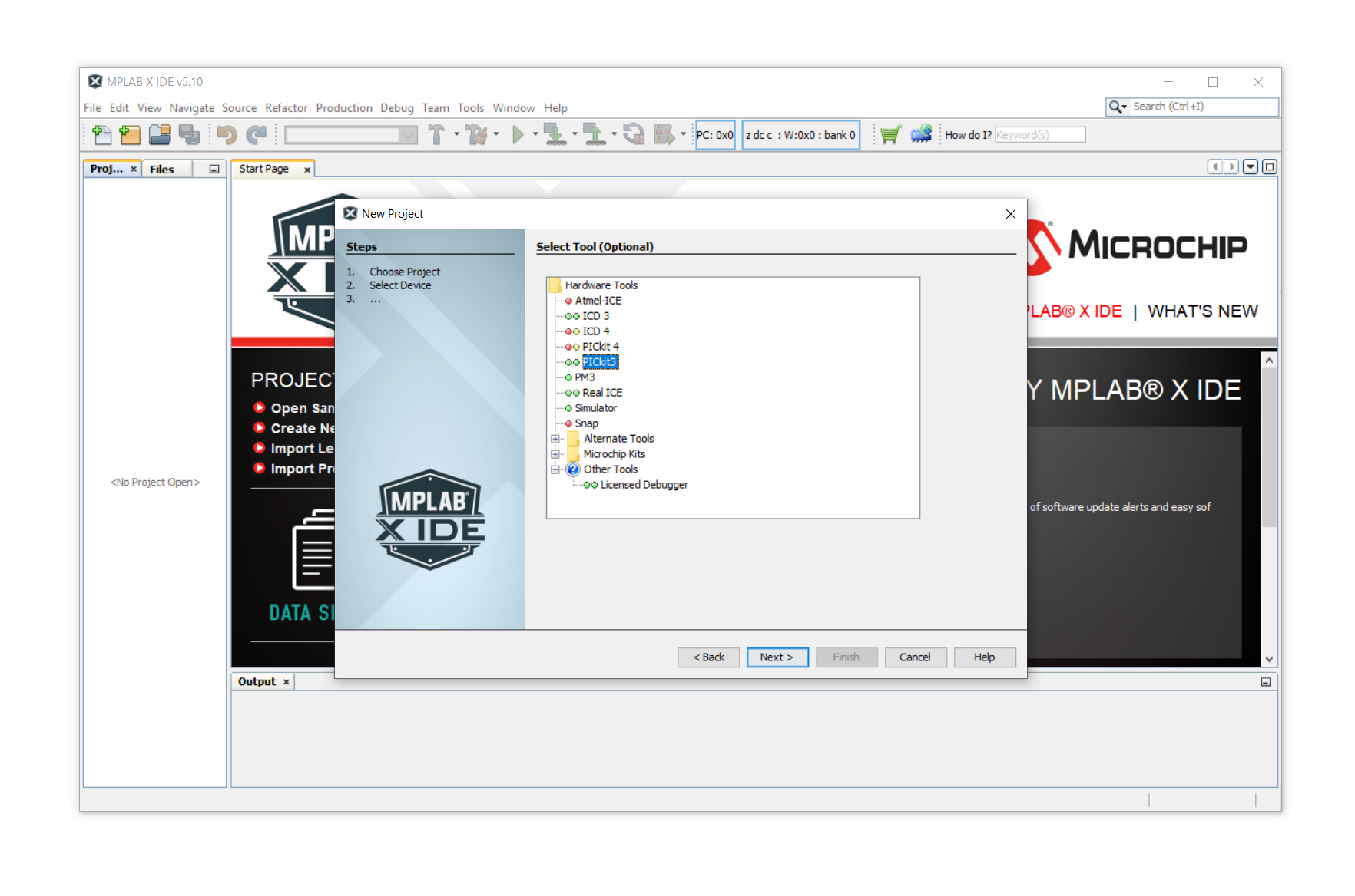 Then we select our programming tool, for which I am using the PICkit3, so this is what I select in this list. Click on PICkit3 if you also use it, and then click on Next.