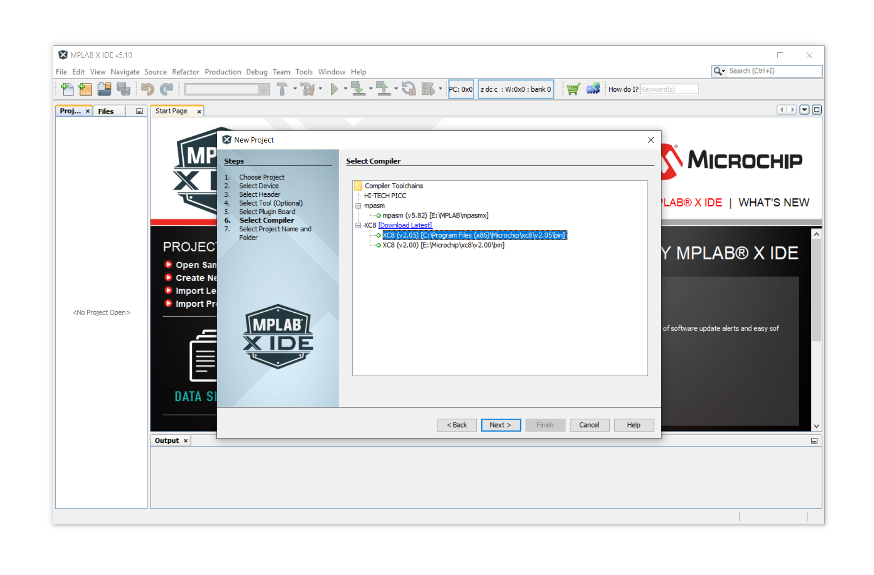 As a compiler just select any XC8 compiler (which will be automatically installed when you install MPLAB X IDE, so don't worry about it). If for some reason it is not installed you can download it for free here. Select XC8 and click on Next.