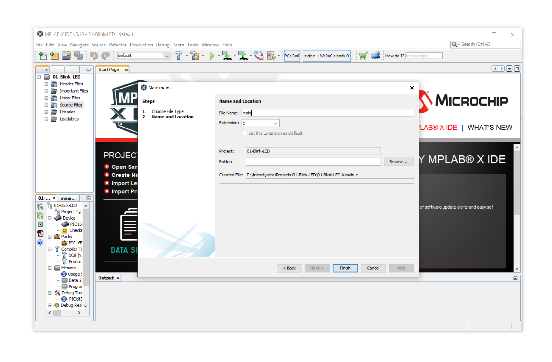 In the next window you can select the file name, for which I suggest main, but it can be anything you want. Then click on Finish.