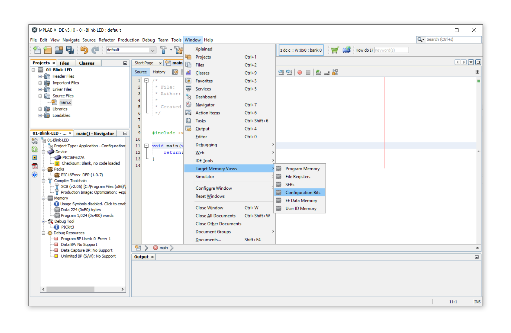 Luckily, MPLAB X IDE has a built-in manager for these bits to make it easy and convenient for us mortals. Simply click on Window, then on Target Memory Views and then on Configuration Bits: