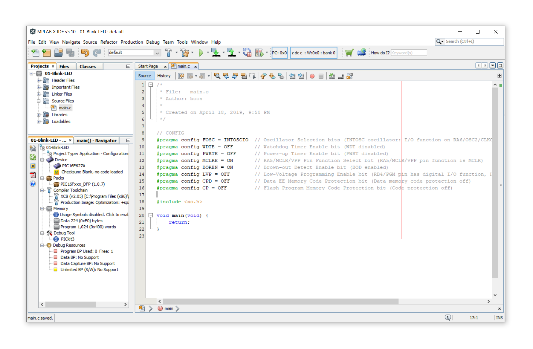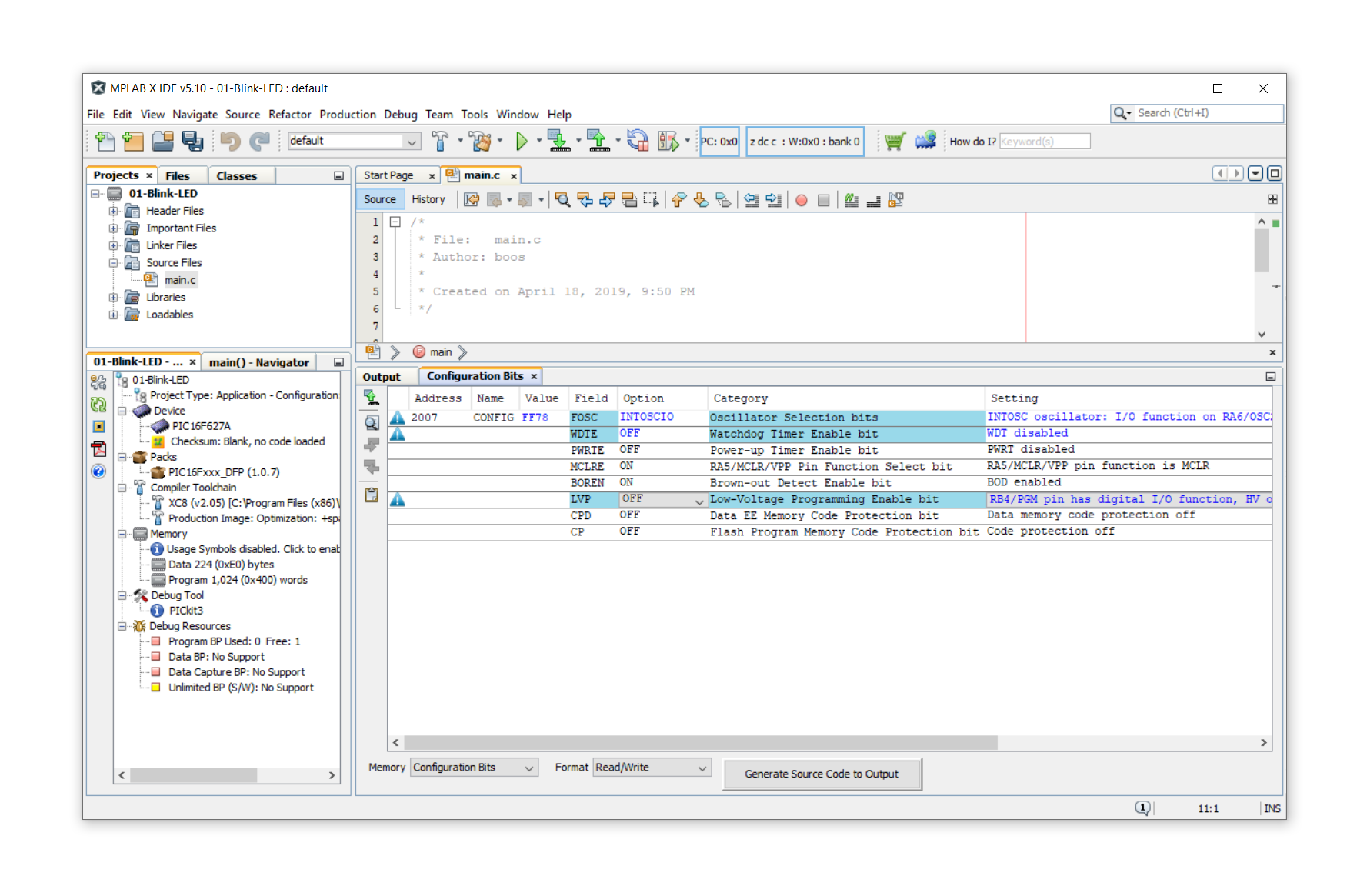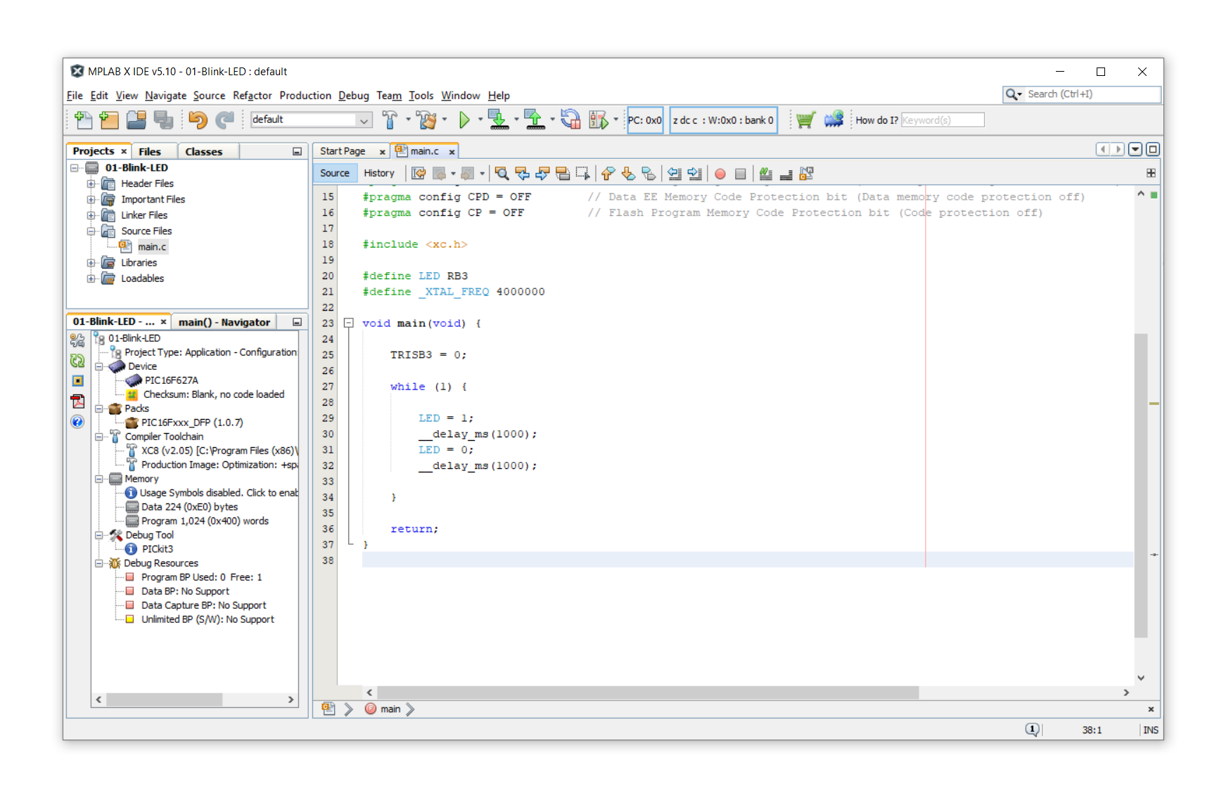 So last week we learned how to transfer a hex file onto a PIC microcontroller using the PICkit3 and the MPLAB X IPE software. For this week's post I think it will be nice to go through a very simple program that makes an LED blink.